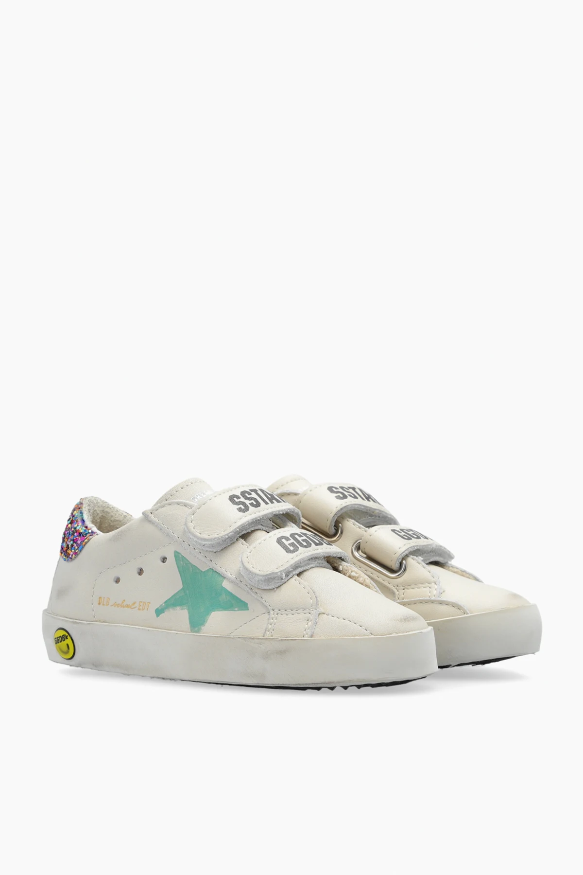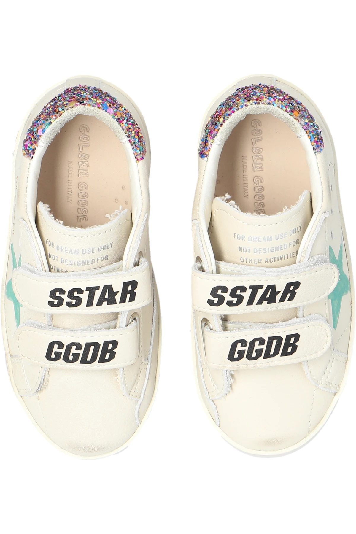 Introducing the Old School Witm Print Star sports shoes from the exclusive Golden Goose Kids collection. These children\'s sneakers exude elegance while providing unparalleled comfort and style. The classic shape of these shoes is accentuated by a distinctive large green star on the side. The upper is crafted from premium ivory-toned material, beautifully contrasted by a multicolored glittery heel. The shoes feature two black Velcro straps with the inscriptions \"SSTAR\" and \"GGDB,\" ensuring a secure and adjustable fit. Further enhancing their charm, the shoes display the golden \"OLD SCHOOL EDT\" inscription on the side and a yellow circular logo with a black pattern on the heel sole. Inside, the shoes are lined with soft leather, promising a plush and comfortable experience. The flat white rubber sole offers excellent grip, making them perfect for any adventure. Golden Goose, a renowned Italian luxury brand, seamlessly blends traditional craftsmanship with an iconic star motif and a unique distressed finish. Their designs are inspired by global experiences and memories, blending urban style with vintage accents. Why choose these shoes? High-Quality Materials: Expertly crafted with a leather exterior and interior. Unique Design: Features a large green star and multicolored glittery heel. Comfort: Soft leather lining and secure Velcro straps. Durability: Robust rubber sole ensures excellent grip. Exclusive Brand: From the prestigious Golden Goose Kids collection.