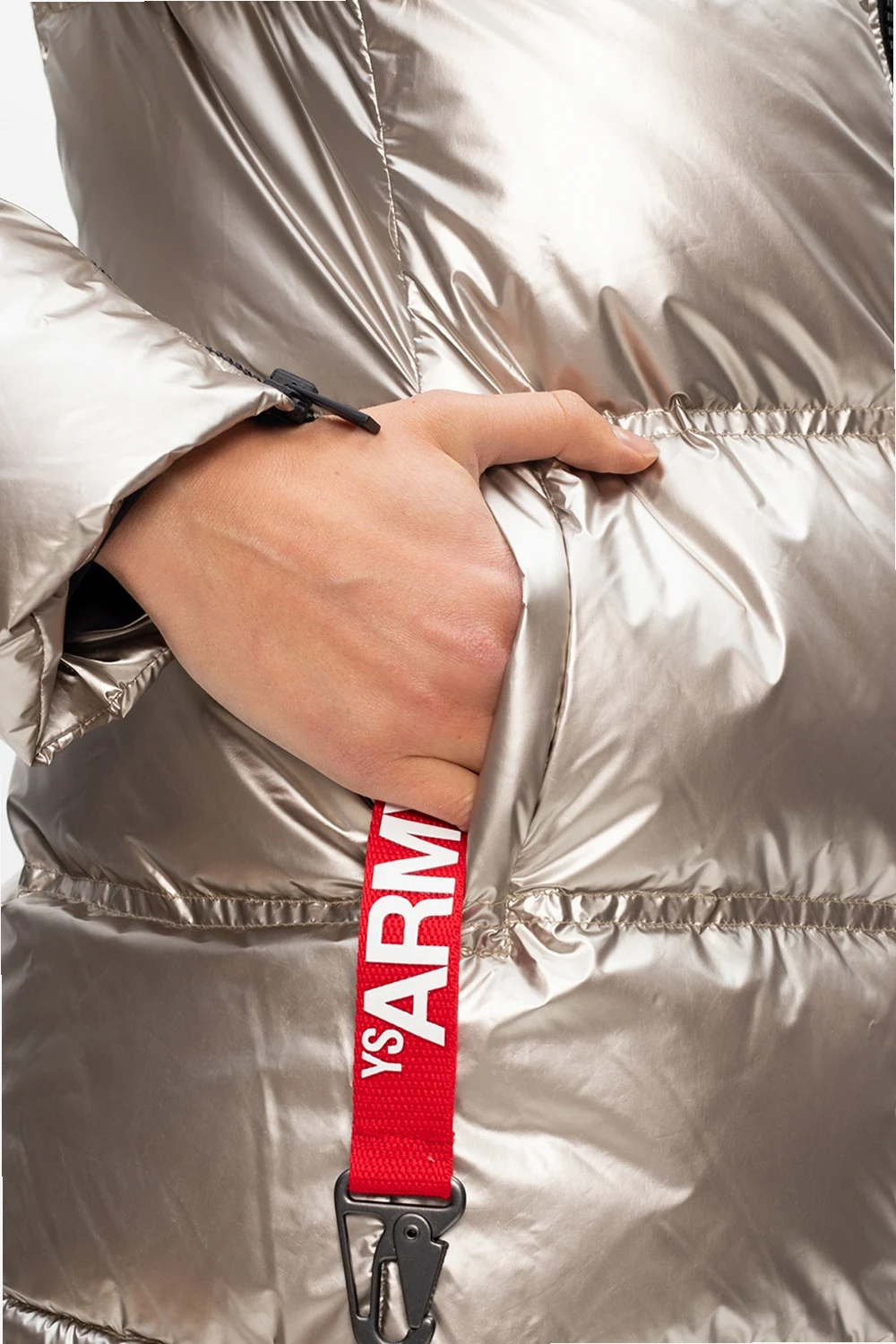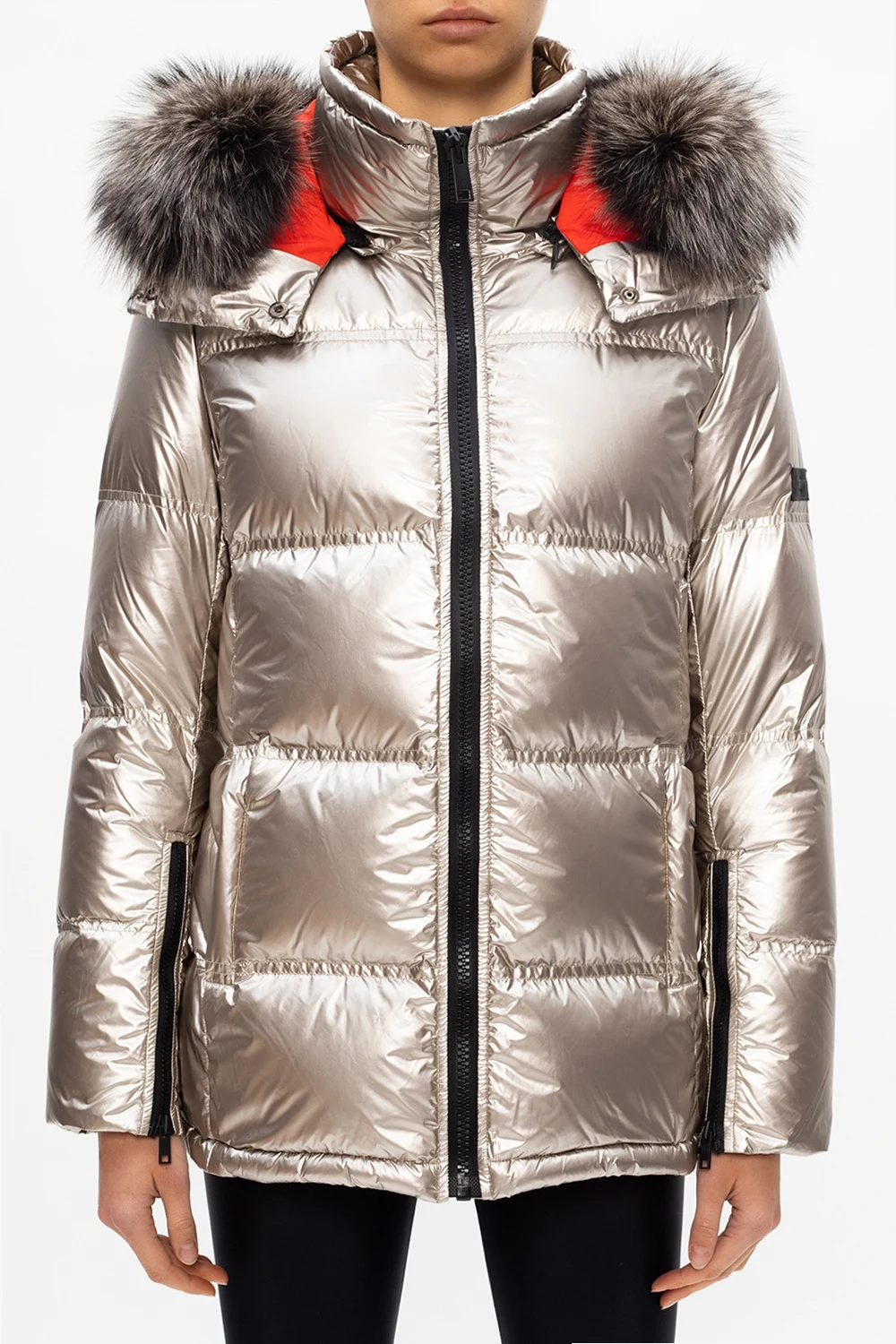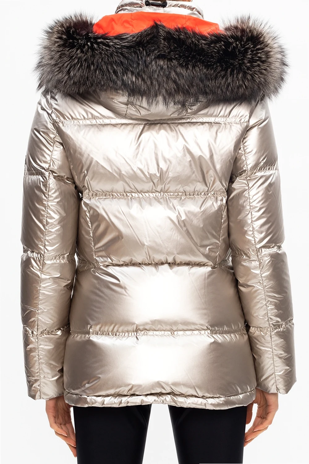 Silver-tone quilted down jacket from Yves Salomon. Sporting black logo patch for the brand recognition, this wintry piece employs zip fastening, detachable hood trimmed in black and grey fox fur, two zipped front pockets, red lining and zipped cuffs.
