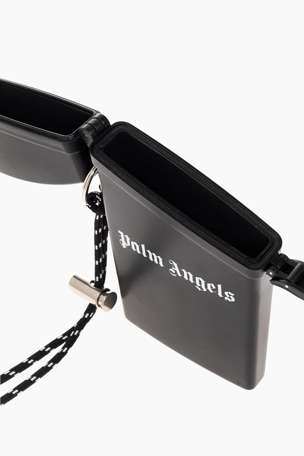 Black phone pouch from Palm Angels. Fastened with a snap button, this item features a white logo print, detachable strap to the side, silver-tone metal hardware and one internal compartment with foam and soft fabric trimming.