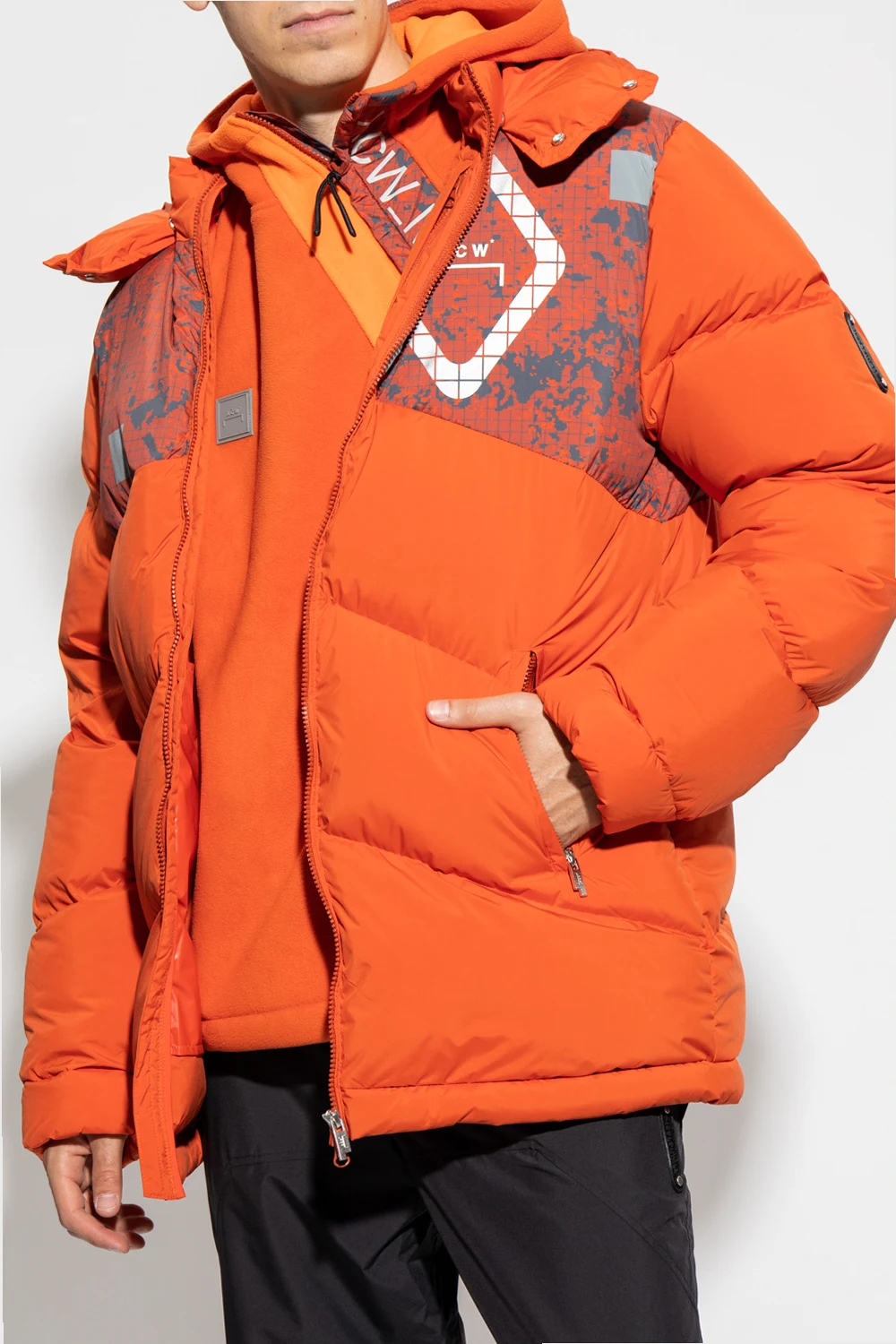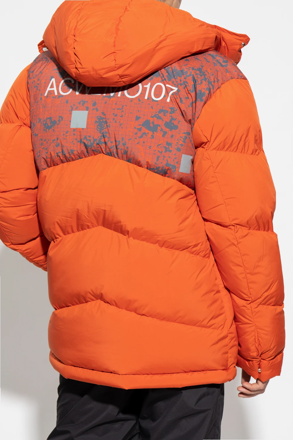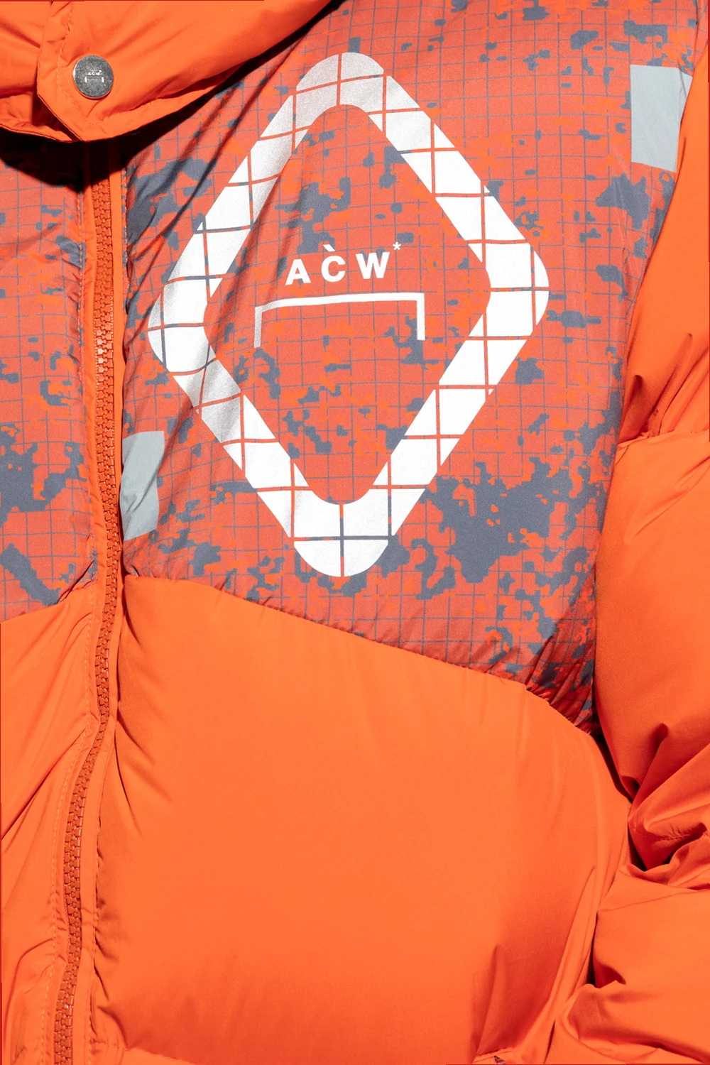 Orange down jacket from A-COLD-WALL*. Crafted from material with a water-resistant finish, this style features a two-way zip fastening, quilted detailing, metallic logo prints, a detachable hood with front snaps, two zip pockets, a drawcord-adjustable hem and long sleeves with snap-fastened cuffs.