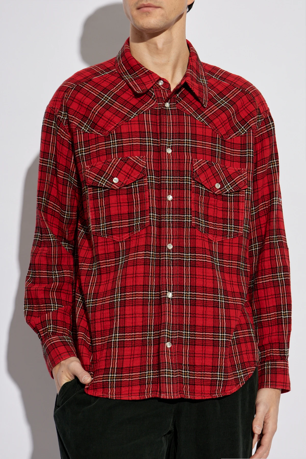 Introducing the Panema Shirt from the exclusive MARANT collection, a piece that epitomizes the seamless blend of casual elegance and contemporary style. This exquisite shirt features a classic cut with long sleeves and a standard collar, making it a timeless addition to any wardrobe. The dominant red plaid pattern, accented with black, white, and yellow lines, adds a splash of bold sophistication. Crafted from soft cotton, it promises unparalleled comfort and warmth, perfect for those seeking both style and ease. Distinctive details include two flap pockets on the front, secured with light buttons that contrast beautifully against the darker plaid backdrop. This casual shirt, tailored for men, is ideal for relaxed, everyday ensembles. Why Choose This Product? Designed by the renowned MARANT, renowned for its Parisian nonchalance and androgynous motifs. Features a unique red plaid design for a bold statement. Made from 100% soft cotton for supreme comfort and warmth. Includes convenient flap pockets for added functionality. Secured with stylish snaps for a modern twist.