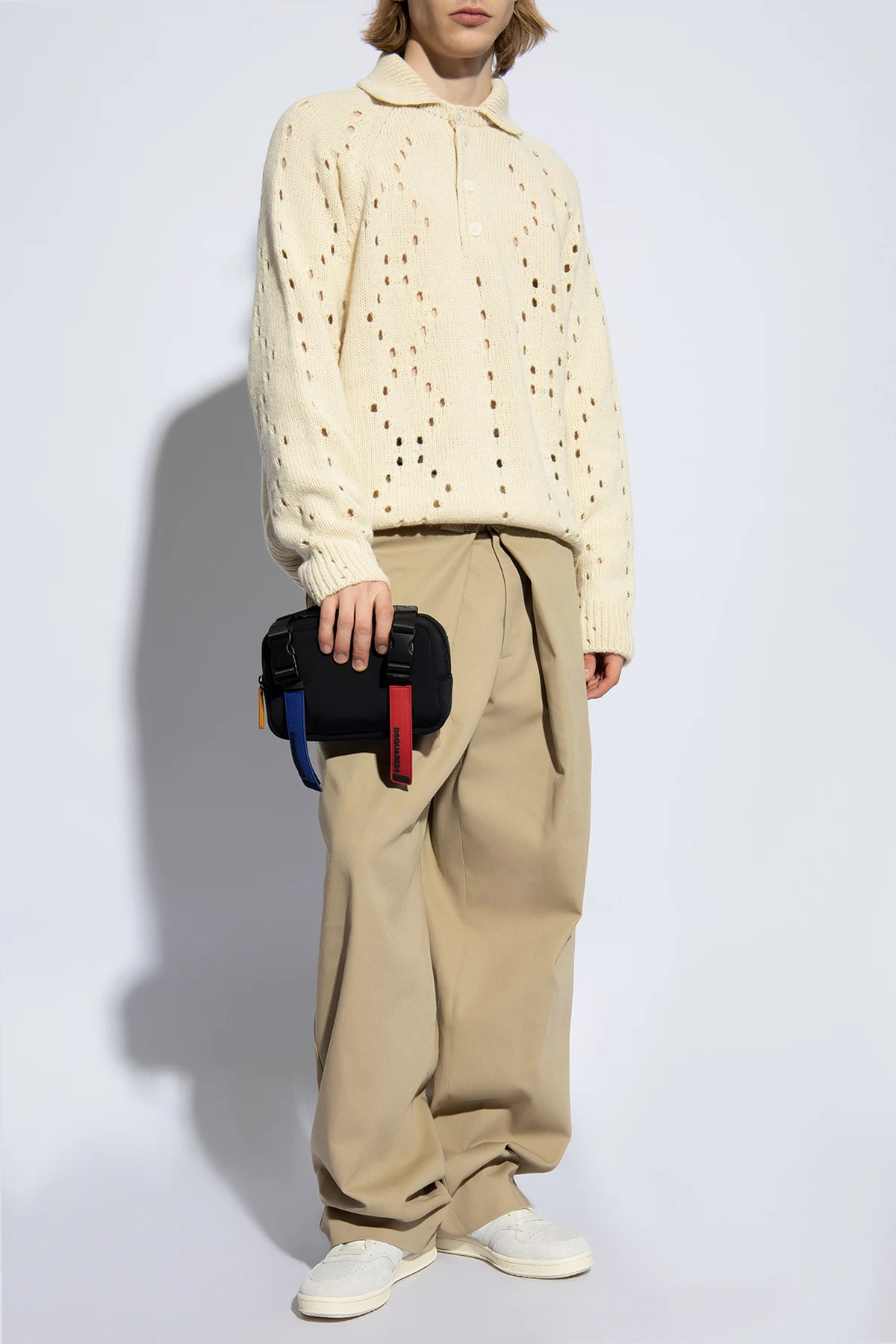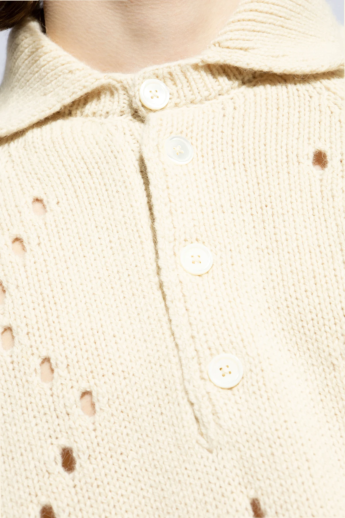 In an ode to timeless elegance and sophisticated comfort, the Givenchy Ażurowy Sweater with a Collar emerges as a paragon of sartorial excellence. Crafted from a sumptuous blend of wool and alpaca, this garment promises an unparalleled softness and a gentle caress against the skin. Its creamy, light beige hue embodies versatility and understated luxury. The sweater’s distinctive openwork pattern, arranged in vertical stripes, adds a touch of intricacy and visual interest, while the polo-style collar infuses a dash of refinement. A line of pristine white buttons down the front offers a classic closure mechanism, harmonizing with the sweater’s overall aesthetic. Short sleeves, a rarity among sweaters, lend it a unique character, making it a versatile piece for transitioning between seasons. Ribbed cuffs and hem ensure a snug fit, enhancing the silhouette. Why Purchase This Product? Exquisite craftsmanship from the renowned house of Givenchy. Luxurious blend of wool and alpaca fibers for supreme comfort. Elegant openwork design for a sophisticated visual appeal. Versatile light beige color that complements a myriad of outfits. Unique short-sleeve configuration for diverse styling options.