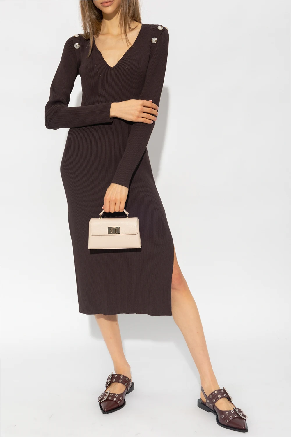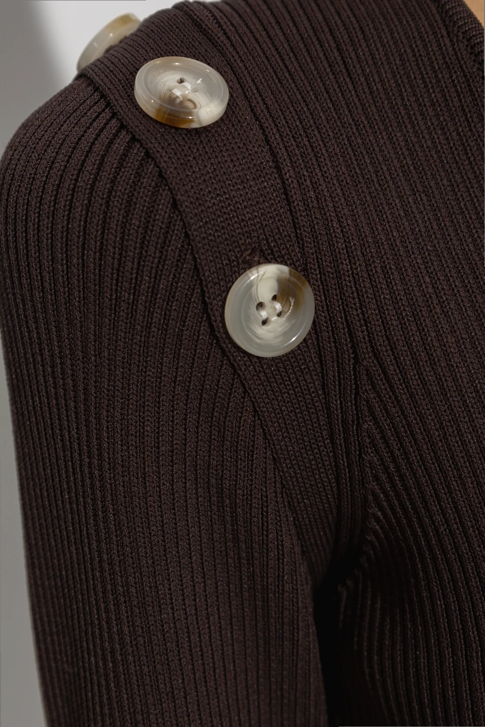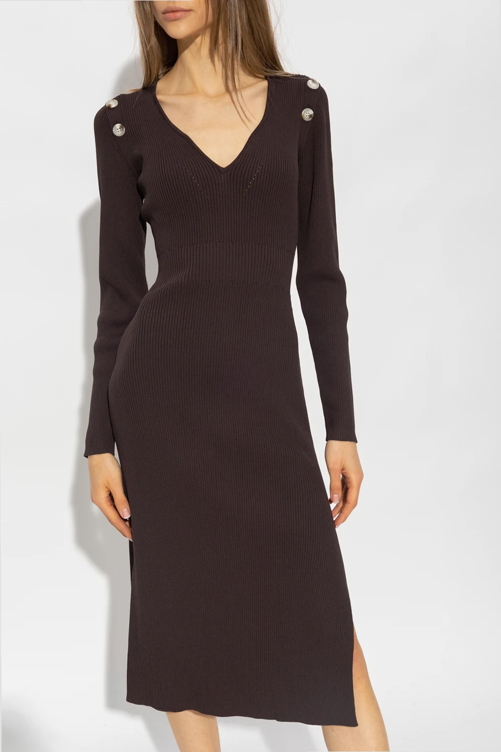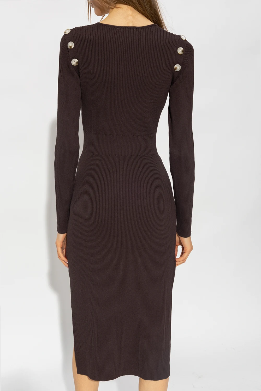 Brown ‘Fonda’ dress from Notes Du Nord. Crafted from a rayon blend with a ribbed texture, this style features a decorative collar, buttoned inserts, long sleeves and bottom slits.