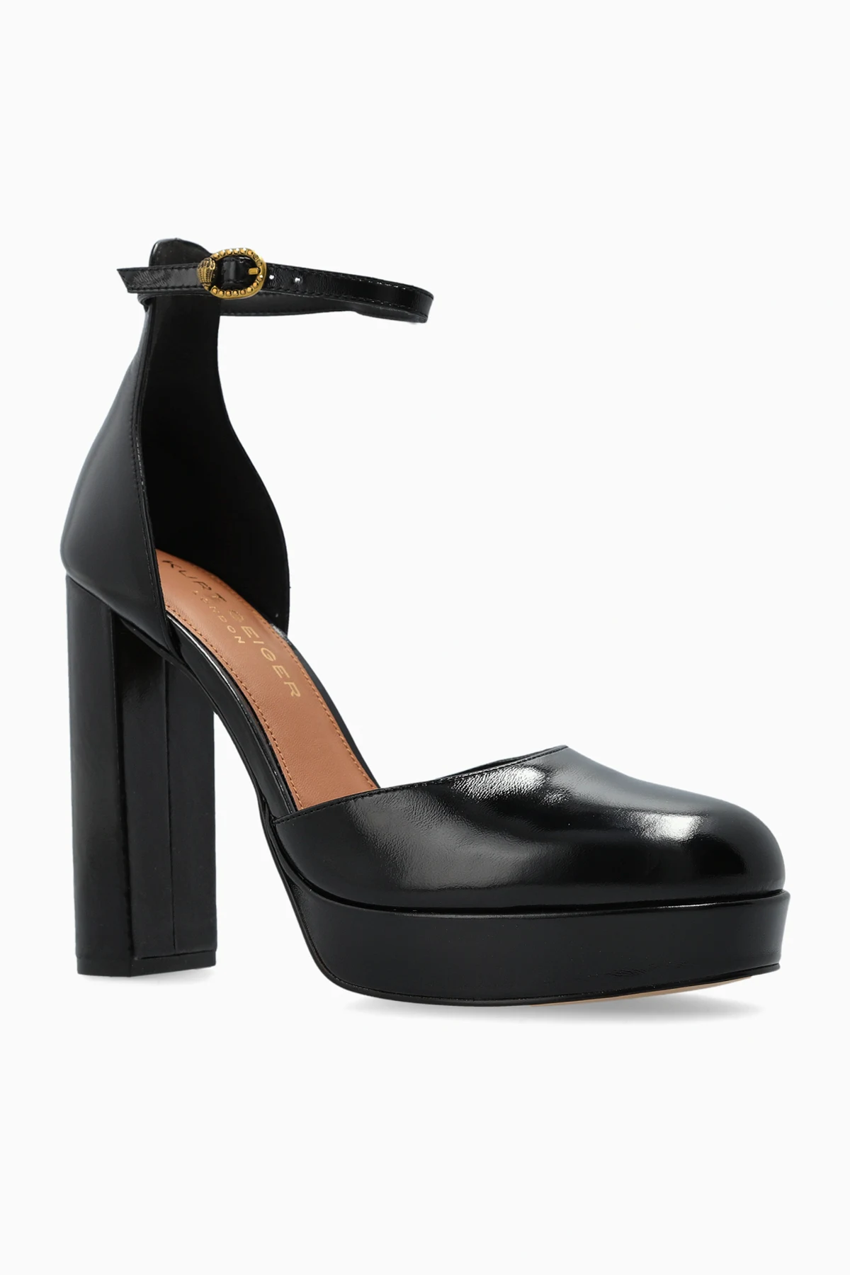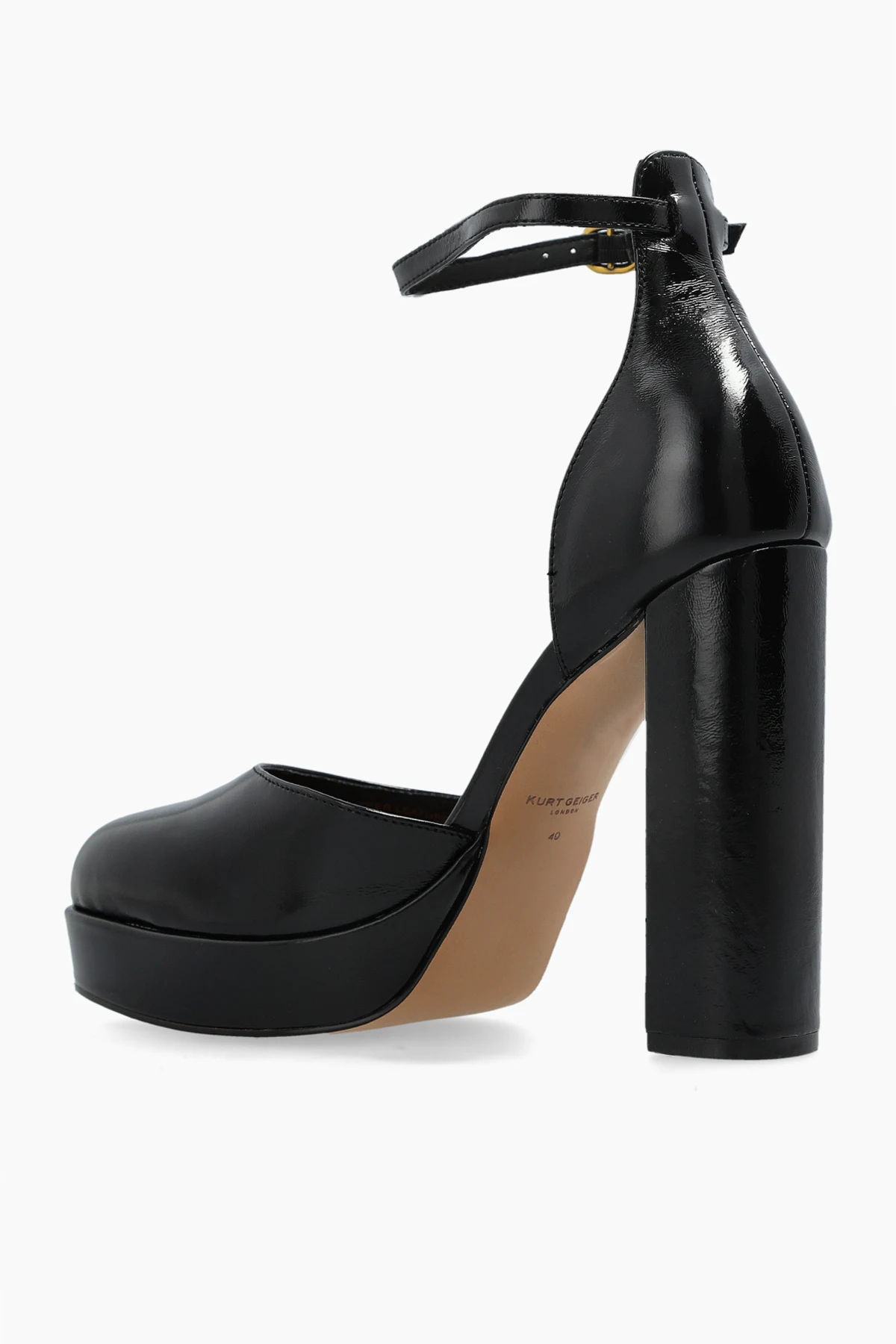 Introducing the \'Shoreditch\' platform shoes, an epitome of elegance and modernity from the illustrious house of Kurt Geiger. These exquisite black platforms feature a distinctive high block heel and a bold, thick platform that exudes avant-garde sophistication. Crafted from patent leather, these shoes shimmer with an elegant luster. The ankle strap adorned with a round gold buckle provides both stability and a chic accent. Inside, the natural leather insole showcases the designer\'s logo, a testament to the quality and craftsmanship synonymous with the Kurt Geiger brand. These shoes seamlessly blend classic allure with contemporary design, making them the perfect addition to any elegant ensemble. Why Choose This Product? Exquisite patent leather finish for a luxurious look. Sturdy block heel and thick platform for modern sophistication. Elegant ankle strap with gold buckle for added style and stability. Renowned craftsmanship from the iconic Kurt Geiger brand.