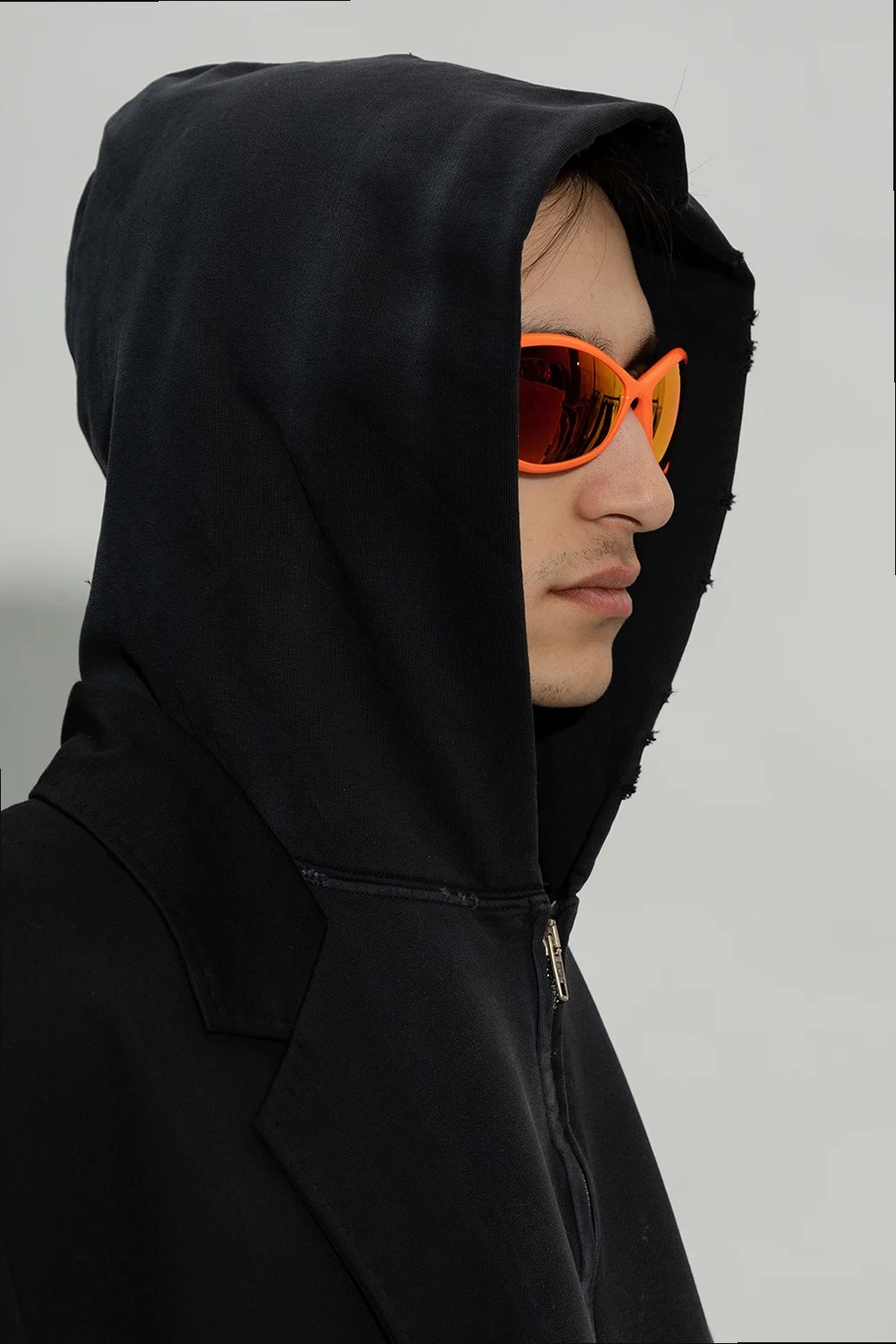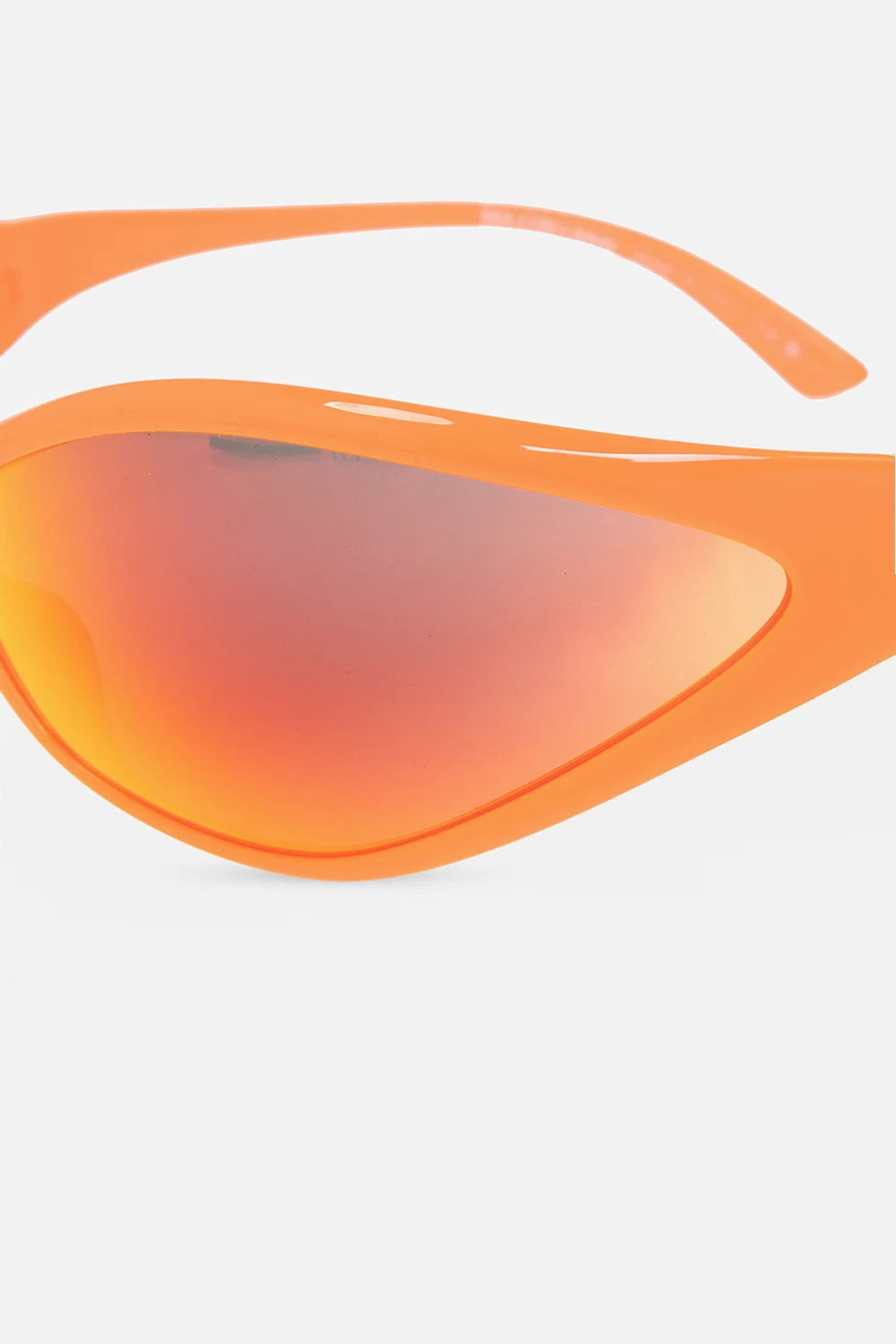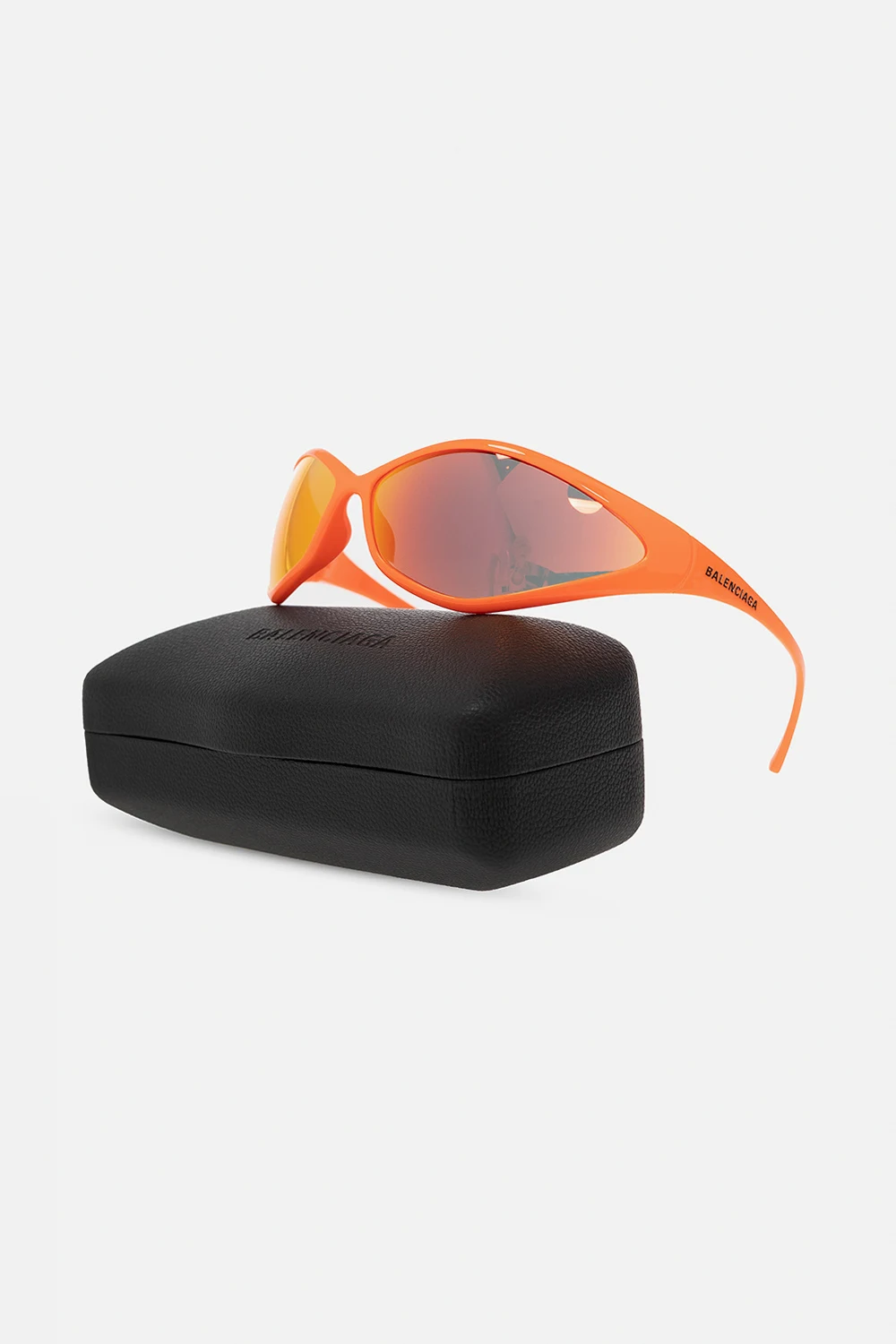 Neon orange ‘90s Oval’ sunglasses from Balenciaga. Crafted from bio-based nylon with an oversize shape, this model features a single bridge, integrated nose pads, white logo detailing on the temples and grey mirrored lenses with 100% UV protection. Case included.