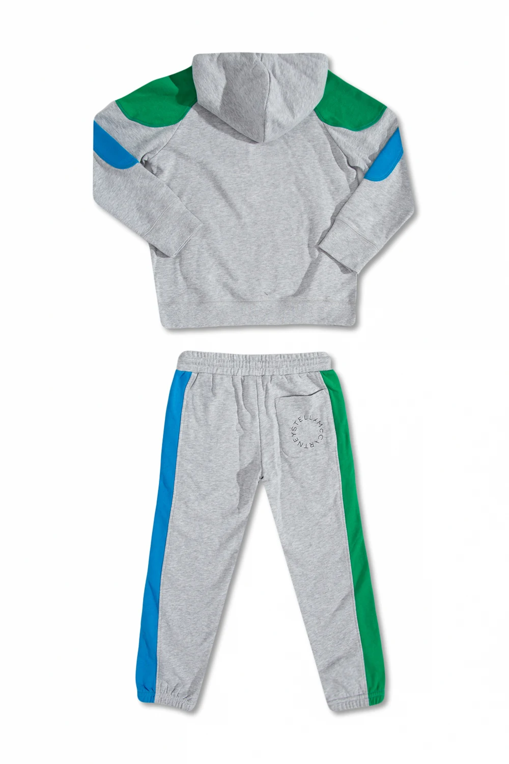 Grey sweatsuit from Stella McCartney Kids. Crafted from cotton jersey, this style showcases orange, blue and green inserts and a logo print and includes a sweatshirt with a drawstring hood and sweatpants with two slip pockets, two zip pockets and elasticated cuffs.