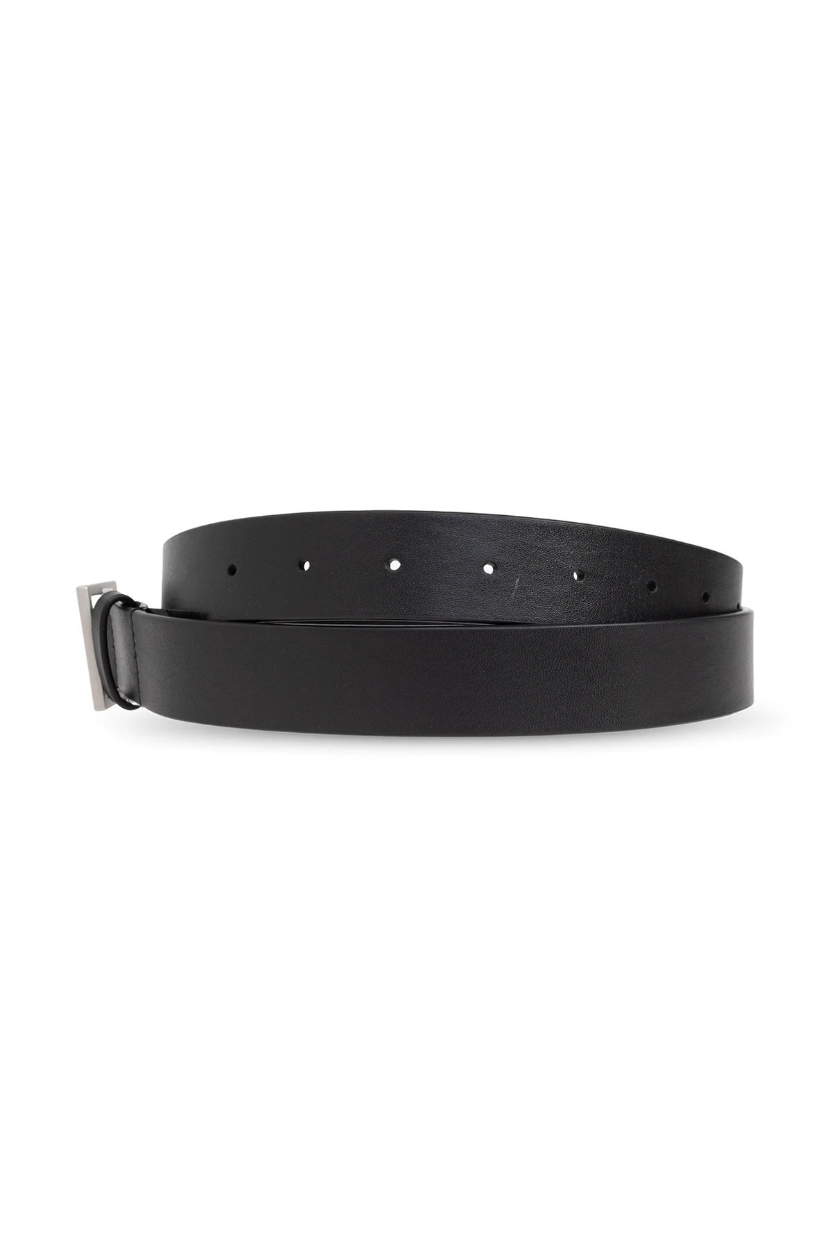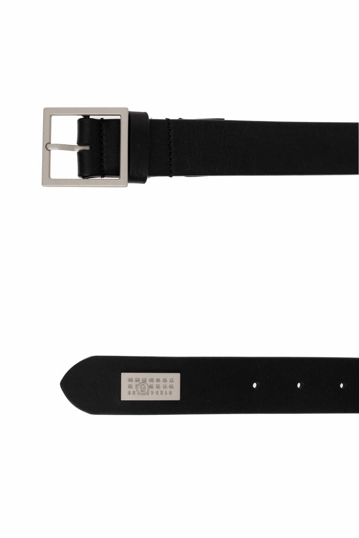 Introducing the Leather Belt by MM6 Maison Margiela, an epitome of refined elegance and avant-garde design. This exquisite belt is crafted from luxurious calfskin leather, exuding timeless sophistication. The belt is adorned with a sleek, silver-toned rectangular metal buckle, which infuses a contemporary flair into its classic silhouette. Its dominant black hue ensures versatility, making it a quintessential addition to any formal or elegant ensemble. Designed with practicality in mind, this belt features multiple holes for adjustable fit, ensuring optimal comfort and style. The discreet logo embossed on the inner side is a subtle nod to its designer heritage. Why Choose This Product? Expertly crafted from premium calfskin leather. Features a modern silver-tone metal buckle. Offers adjustable fit for personalized comfort. Part of an exclusive collection from MM6 Maison Margiela.