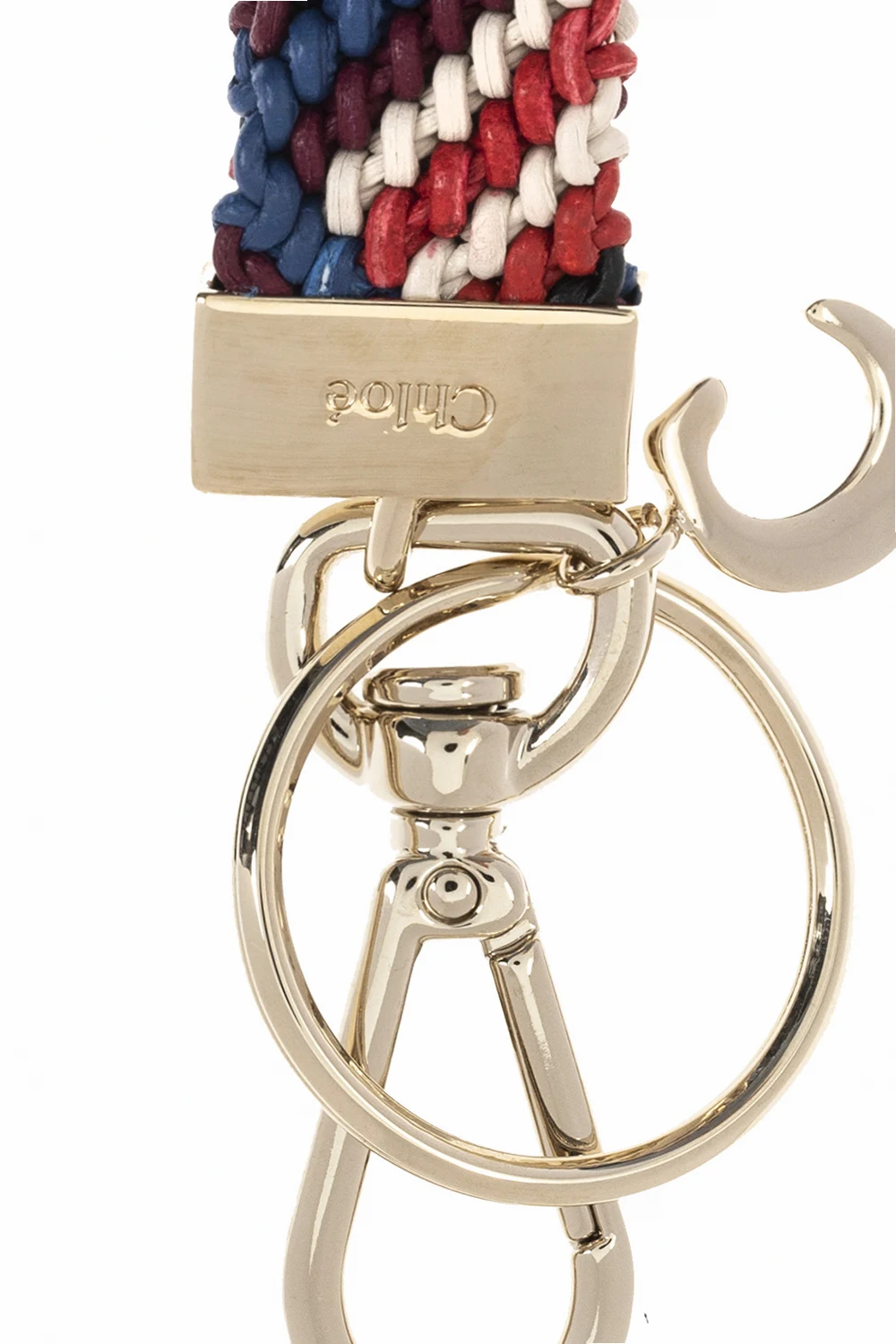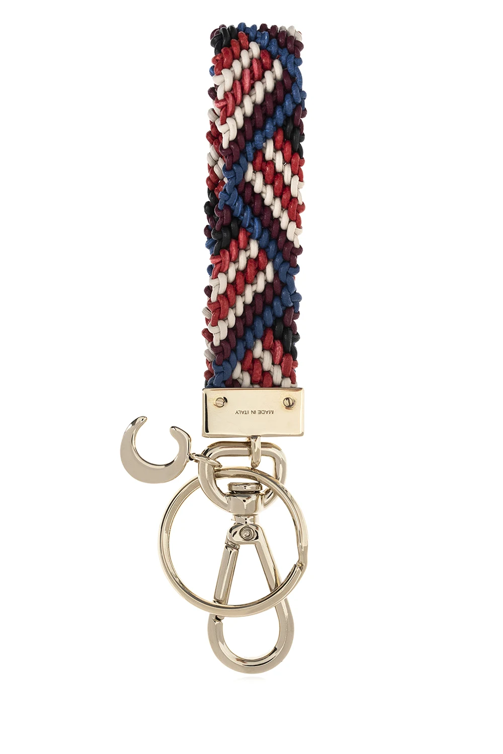 Multicoloured ‘Kyn’ keyring from Chloé. Crafted from brass and braided lamb leather, this item features an engraved logo and gold-tone metal hardware, including a lobster clasp fastening and a ‘C’ charm.