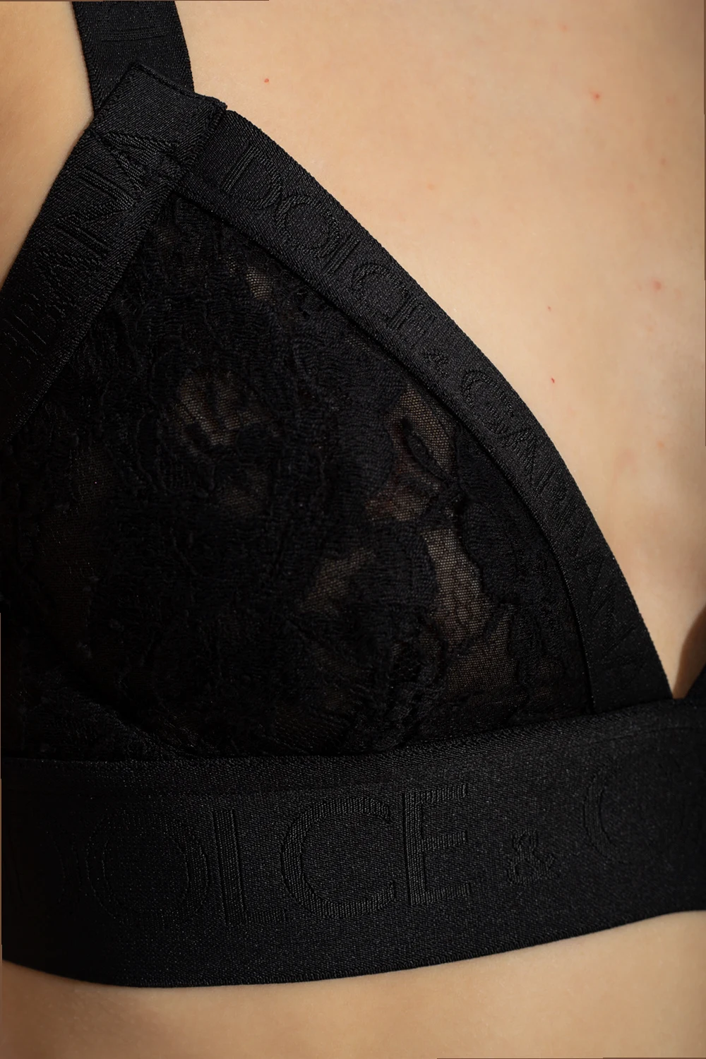Black lace bra from Dolce & Gabbana. Trimmed with a logo-embroidered elastic band, this item features an adjustable hook & eye fastening.