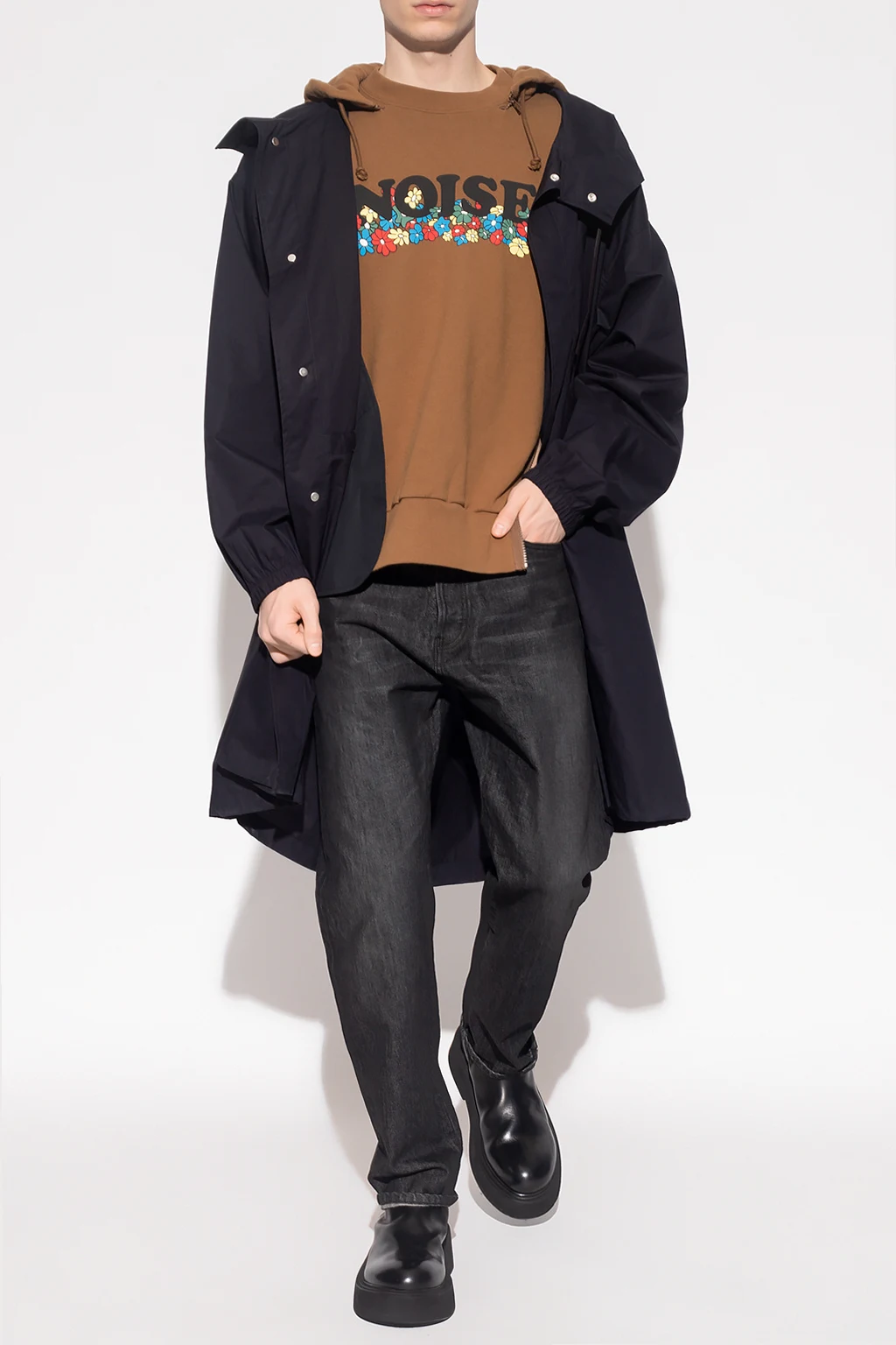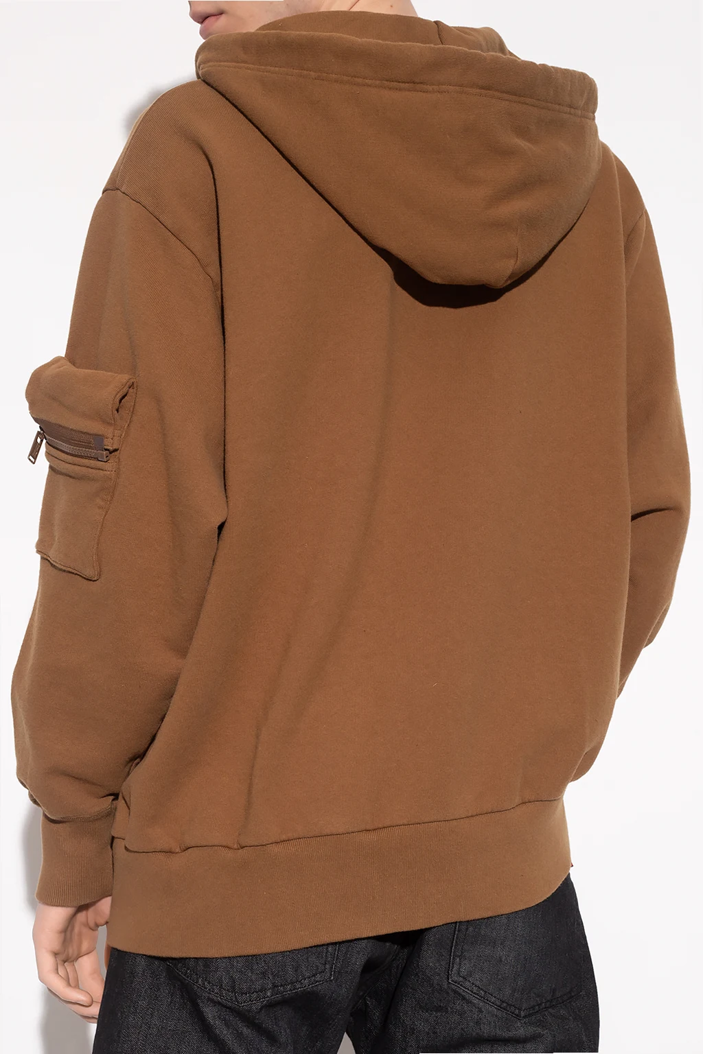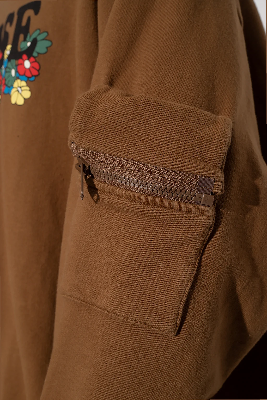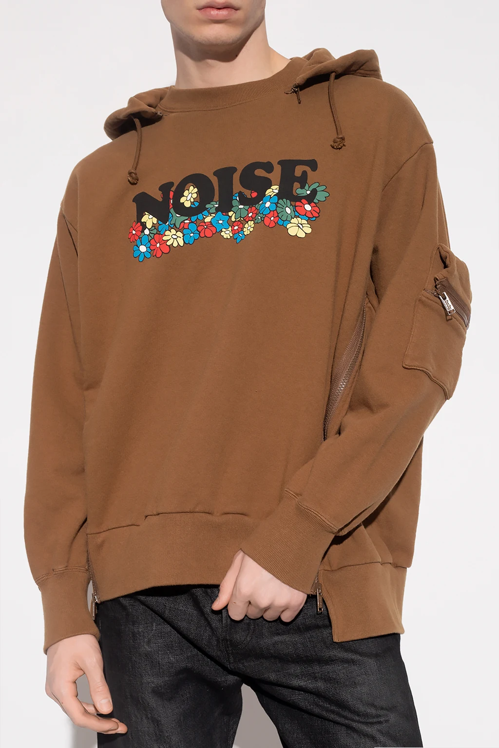 Brown sweatshirt from Undercover. Crafted from cotton jersey, this style showcases a detachable drawstring hood, a colourful floral print accompanied by zip vents on the front, a zip pocket and slip pocket on the sleeve and ribbed trims on the bottom hem and cuffs.