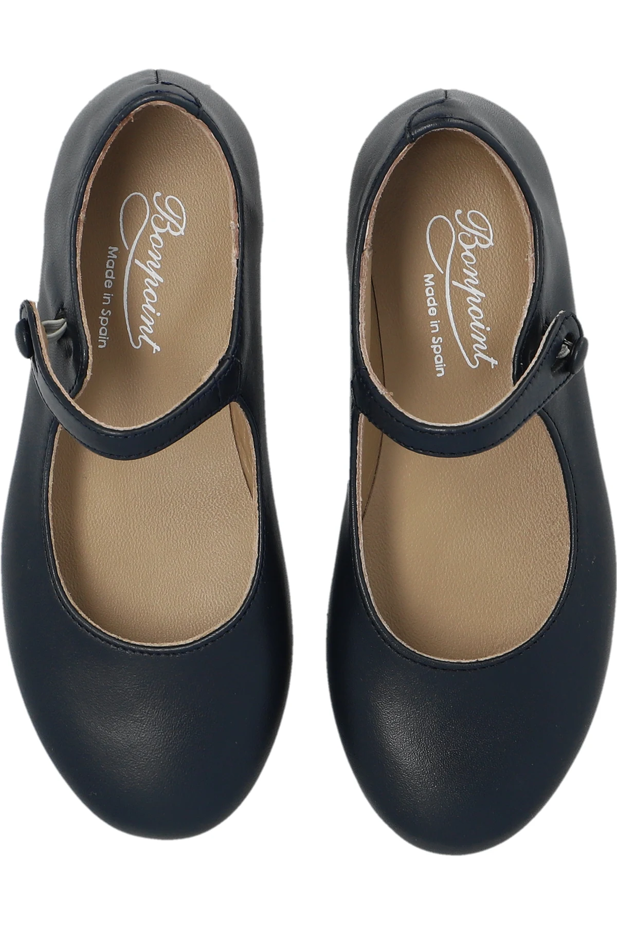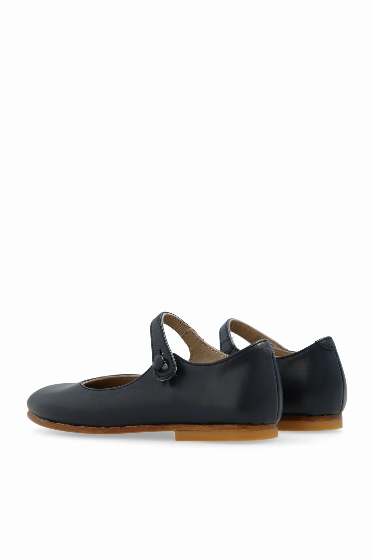 Navy ‘Ella’ ballet flats from Bonpoint. Crafted from leather, this pair features a buttoned strap and brown rubber-trimmed leather sole.
