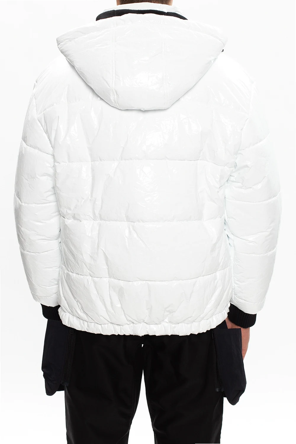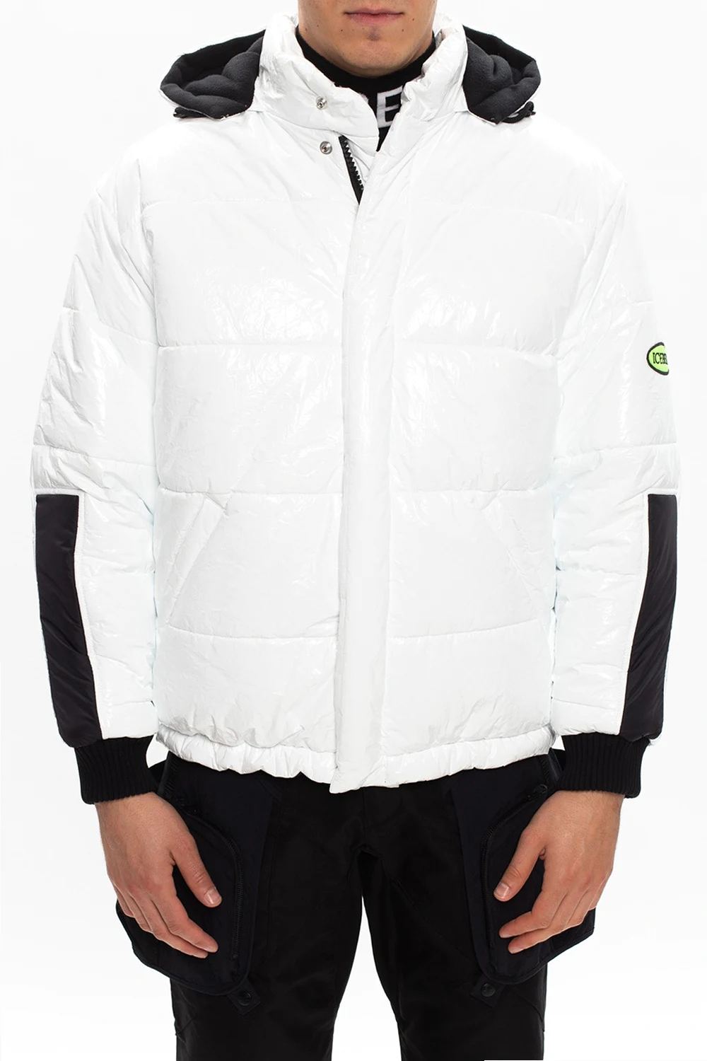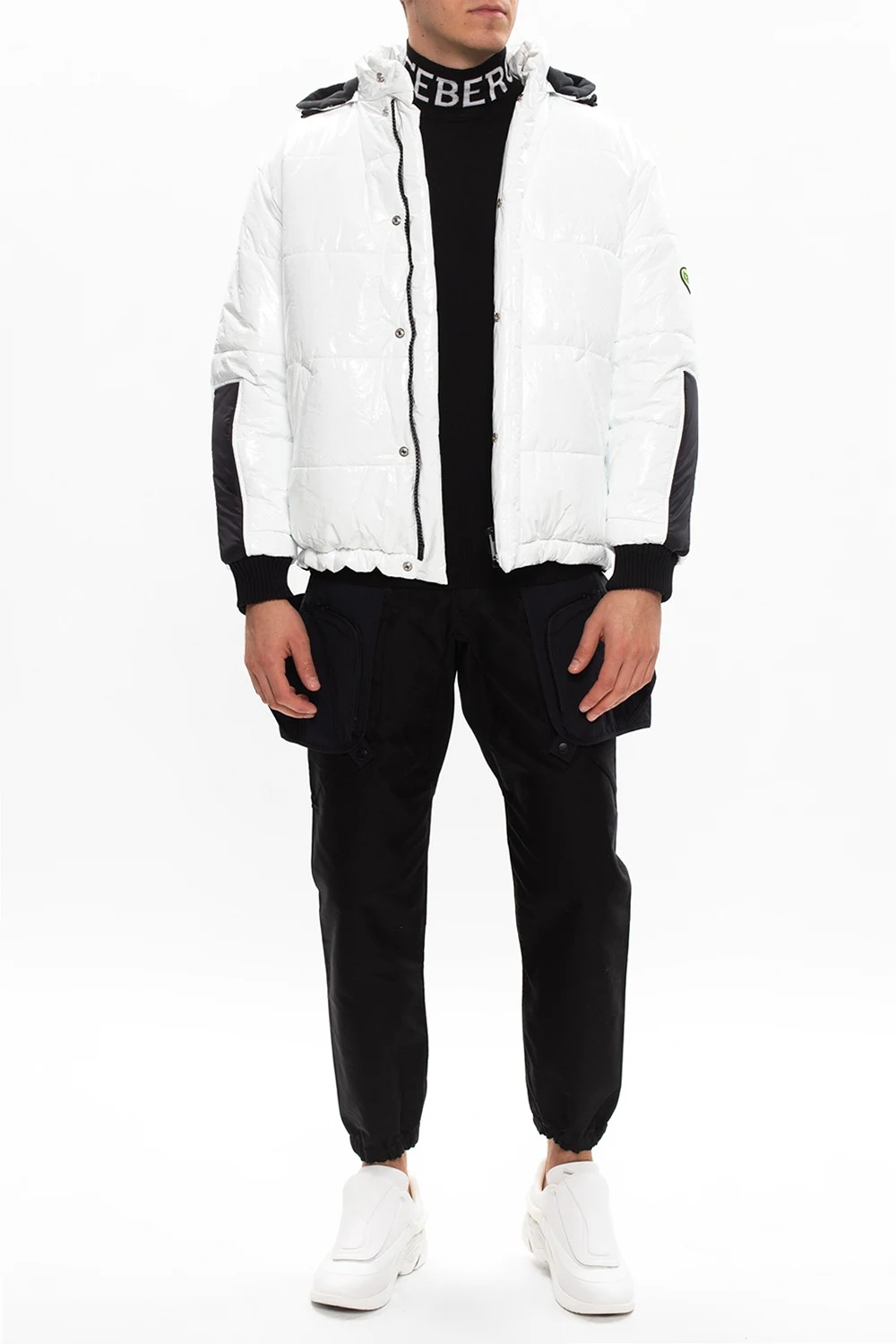 White and black jacket from Iceberg. Equipped with a drawcord-adjustable hood, this exclusive piece of outerwear employs two-way zip and snap fastenings, two zipped pockets on the front and long sleeves with elasticated cuffs, one of which showcases logo patch.