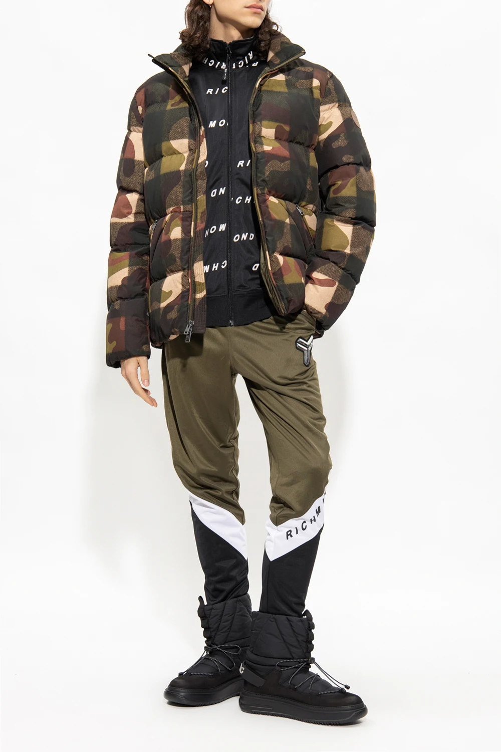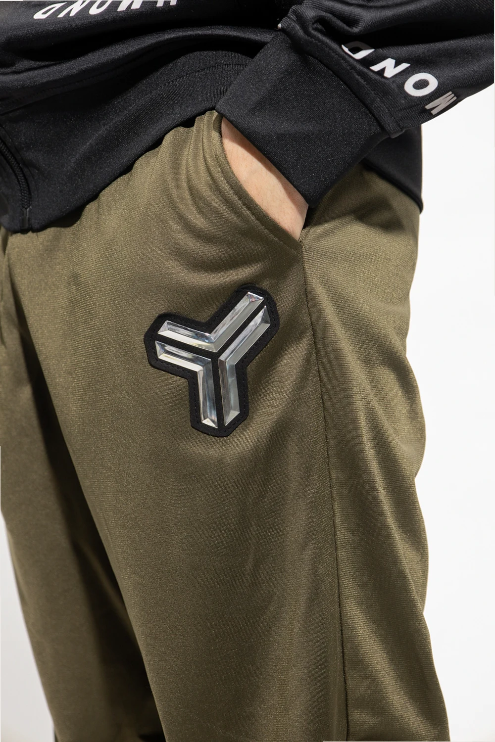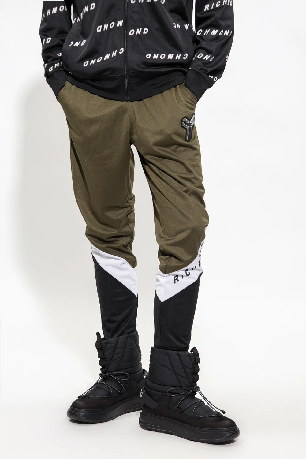 Green, black and white sweatpants from John Richmond Sport. Fastened with drawstrings, this pair features a logo print and appliqué in silver-tone and black, two front pockets and elasticated cuffs with zips.