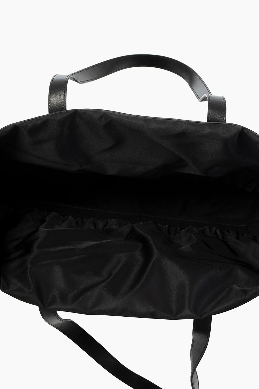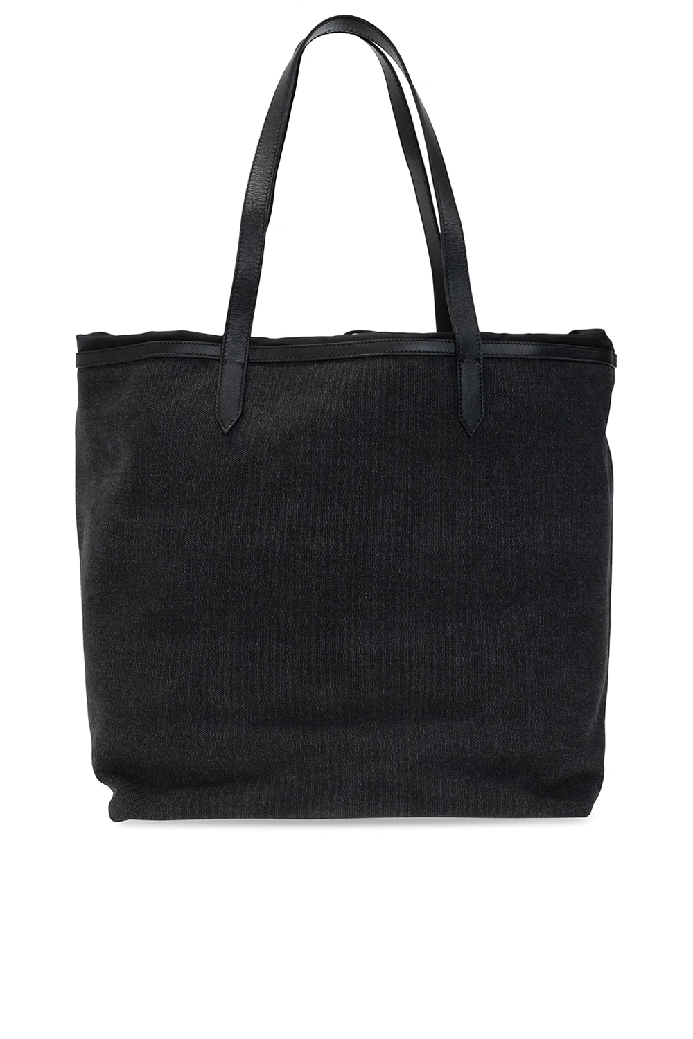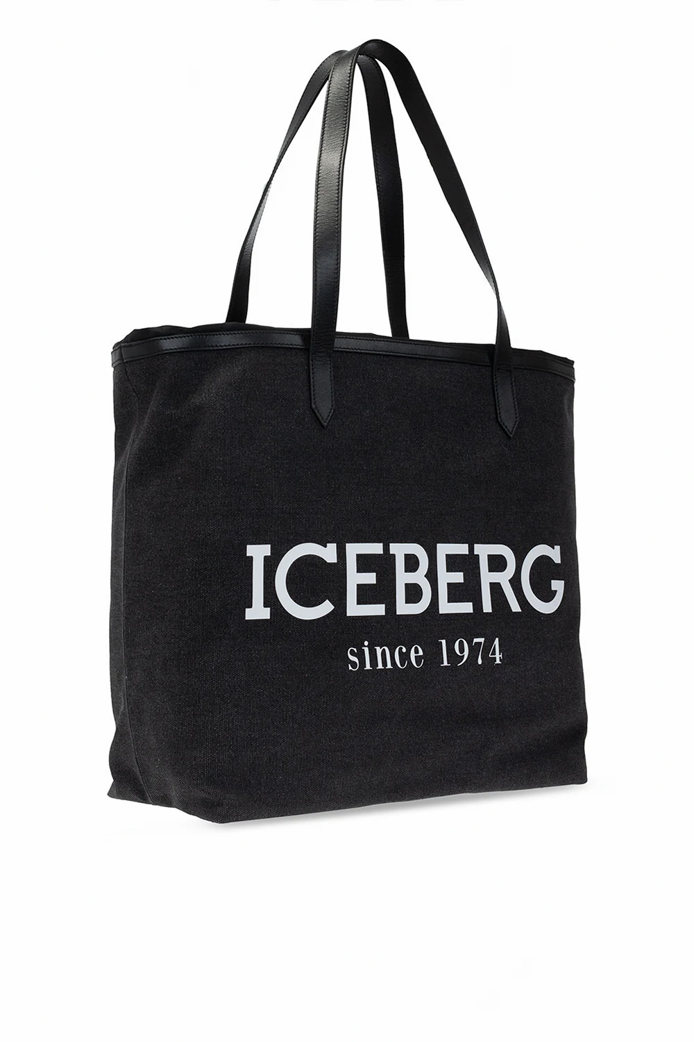 Grey and black tote bag from Iceberg. Size large. Crafted from cotton, this design features a white logo print, two half-round handles and one internal compartment with drawstring fastening, two slip pockets and one zip pocket.