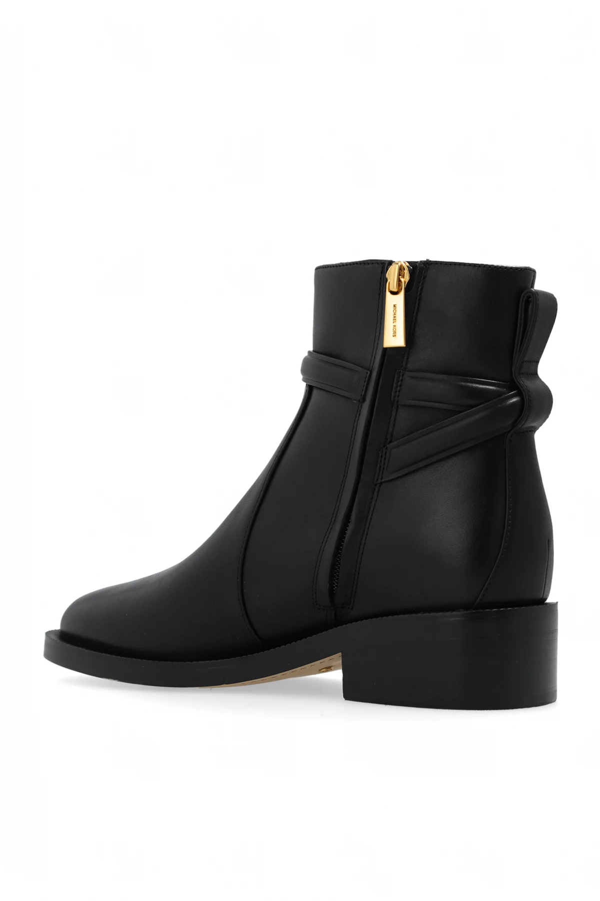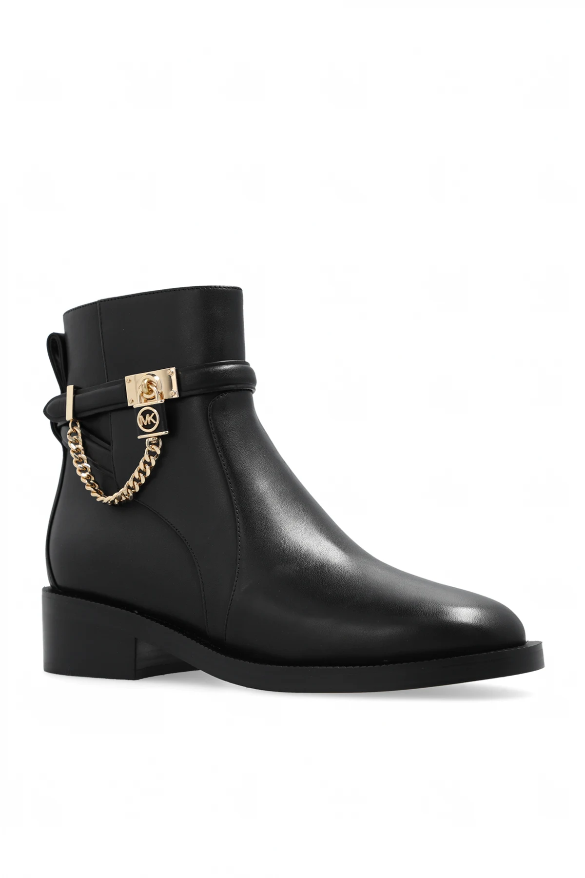 Black ‘Hamilton’ ankle boots from Michael Michael Kors. Made from leather, this model sits on a beige and black rubber sole and features a side zipper and gold-tone chain detailing accompanied by a branded padlock on a strap around the ankle.