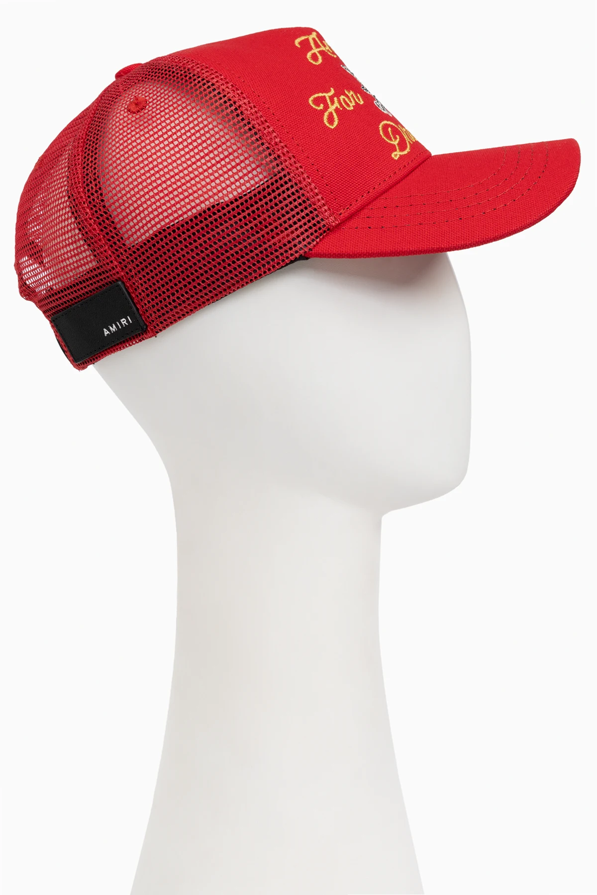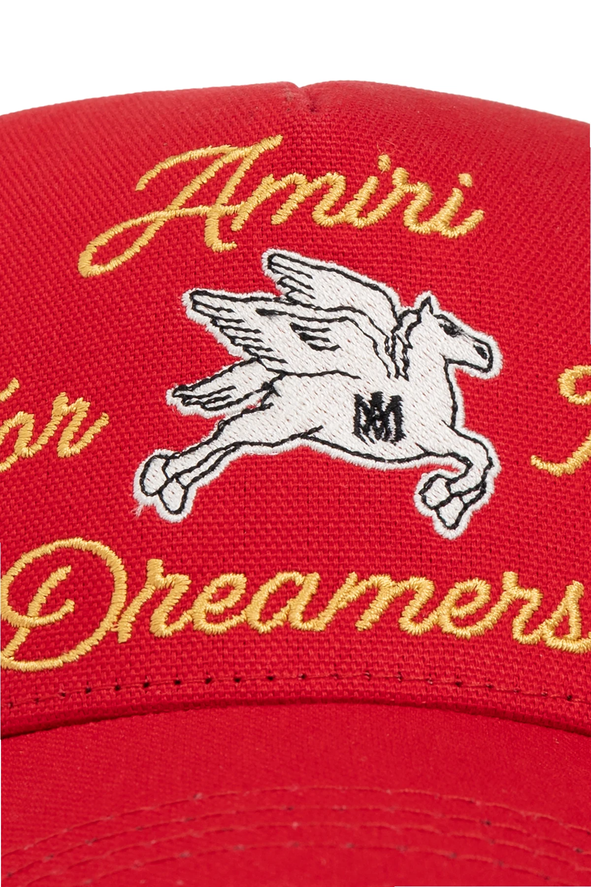 Embrace the spirit of rebellion with the Amiri Kids Red Cap, a quintessential accessory that marries style with comfort. Fashioned in a bold red hue, this cap is a testament to the brand\'s commitment to quality and design. The front showcases the striking yellow inscription, \"Amiri For The Dreamers\", accompanied by an exquisitely embroidered white Pegasus bearing the letter \"M\". This unique detail adds a touch of whimsy and distinction. Constructed with a breathable mesh back, this cap ensures unparalleled comfort, making it an ideal choice for any casual ensemble. The black side patch with the white \"AMIRI\" lettering further accentuates its exclusive allure. Why Choose This Product? Exclusive design with a bold color palette. Features a unique embroidered Pegasus detail. Crafted with breathable mesh for enhanced comfort. Reflects the rebellious and high-quality ethos of Amiri.