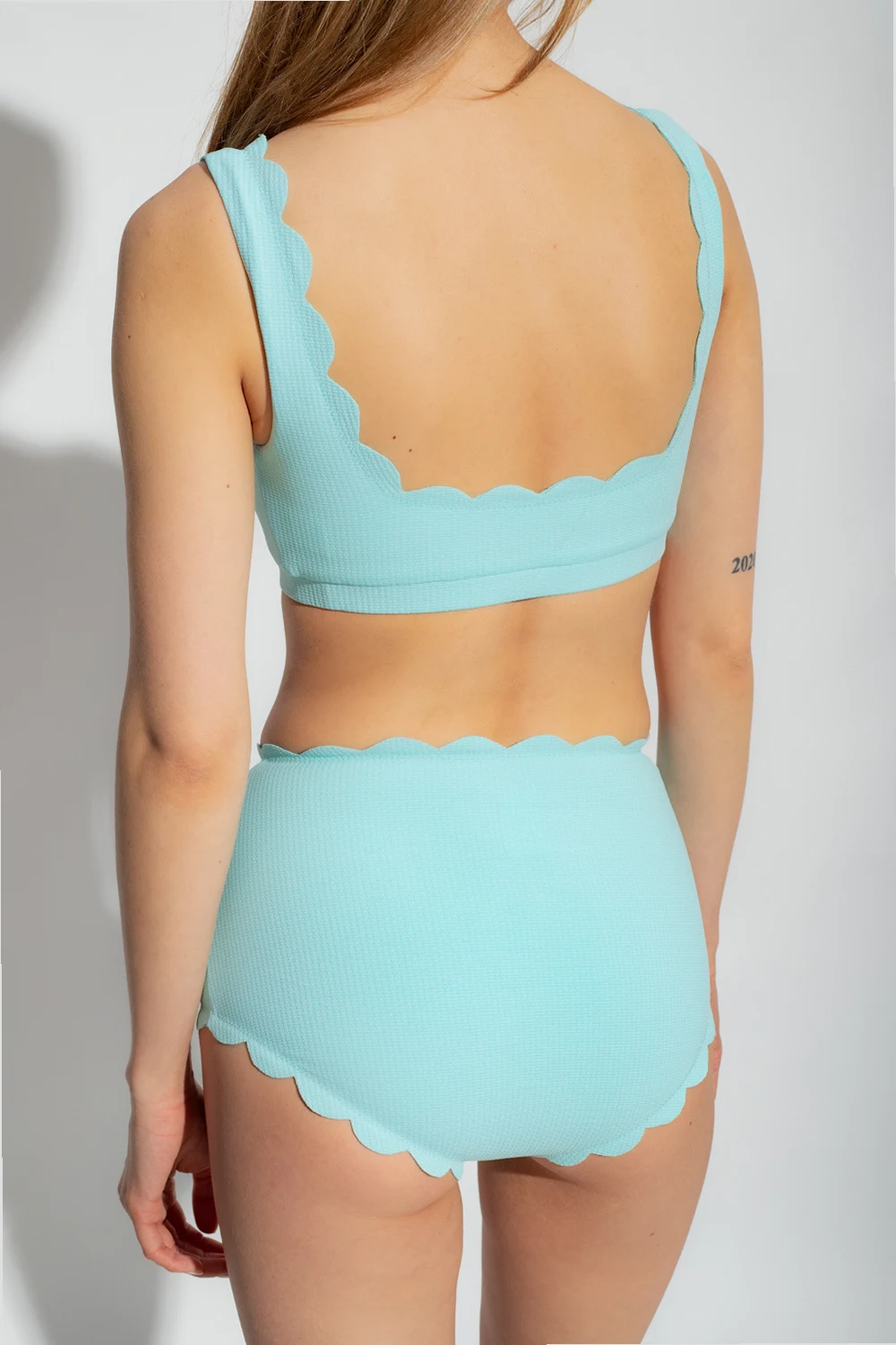 Light blue ‘Palm Springs’ bikini top from Marysia. Crafted from textured stretch fabric, this design features an elasticated waist, the brand’s signature hand cut scalloped trim and wide shoulder straps.