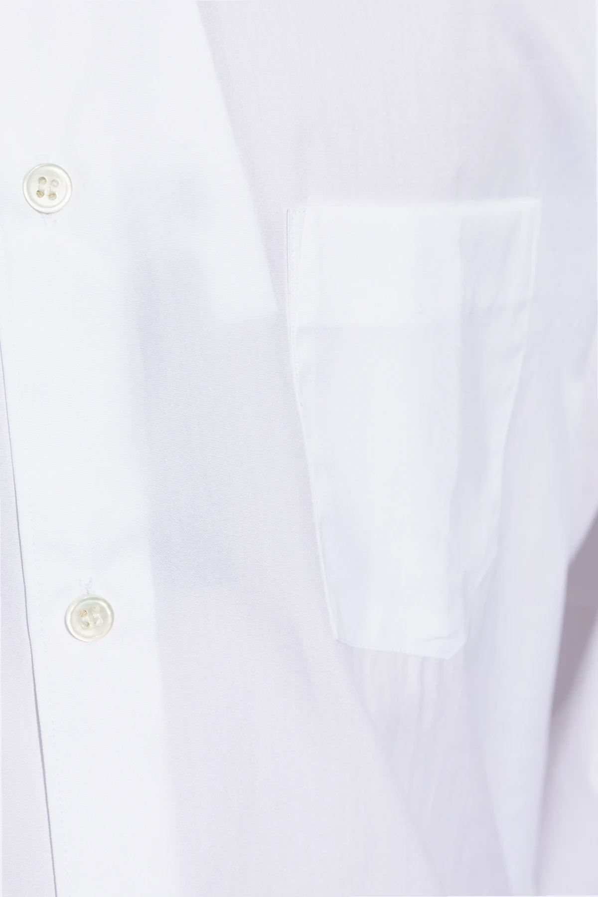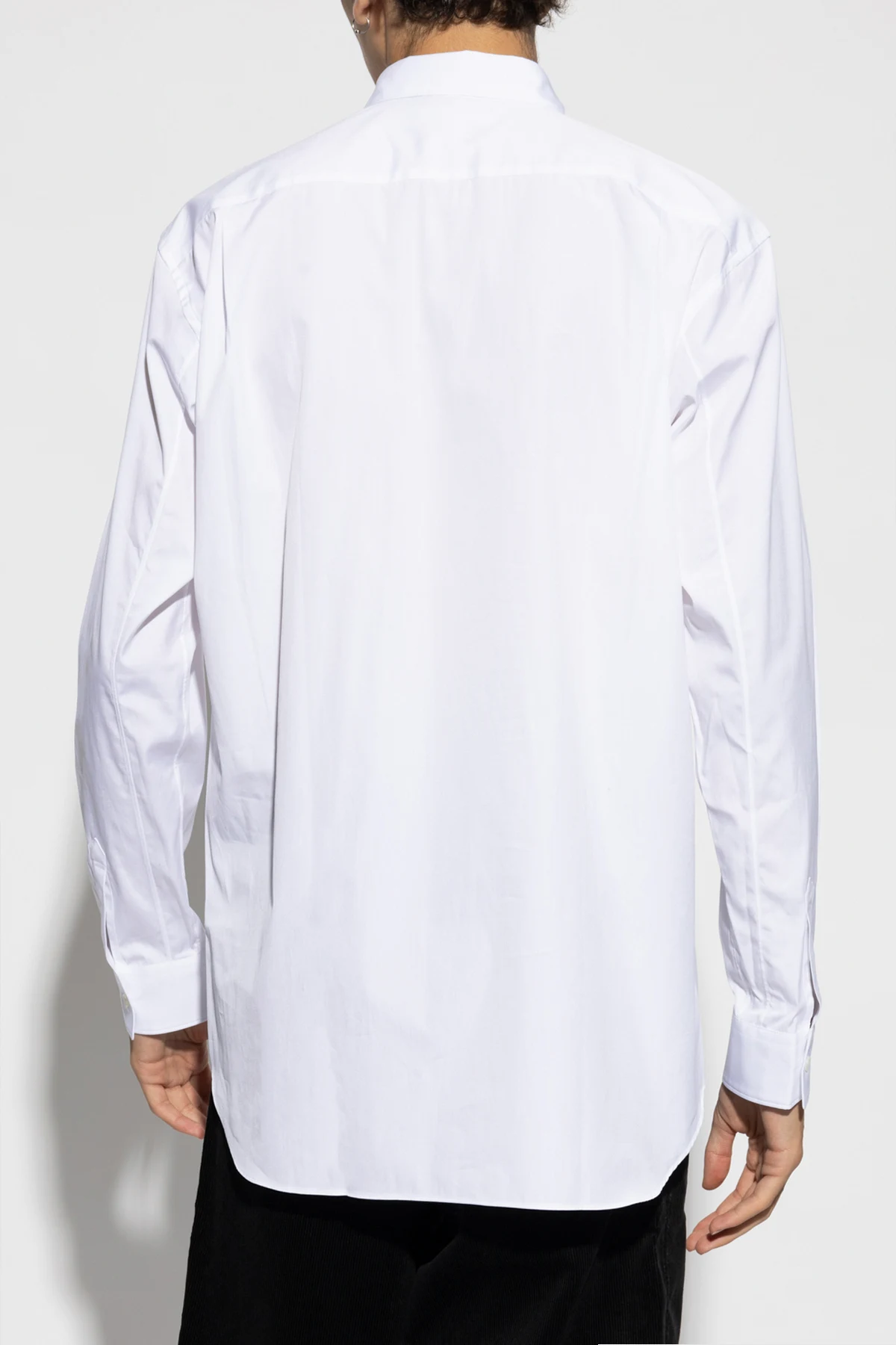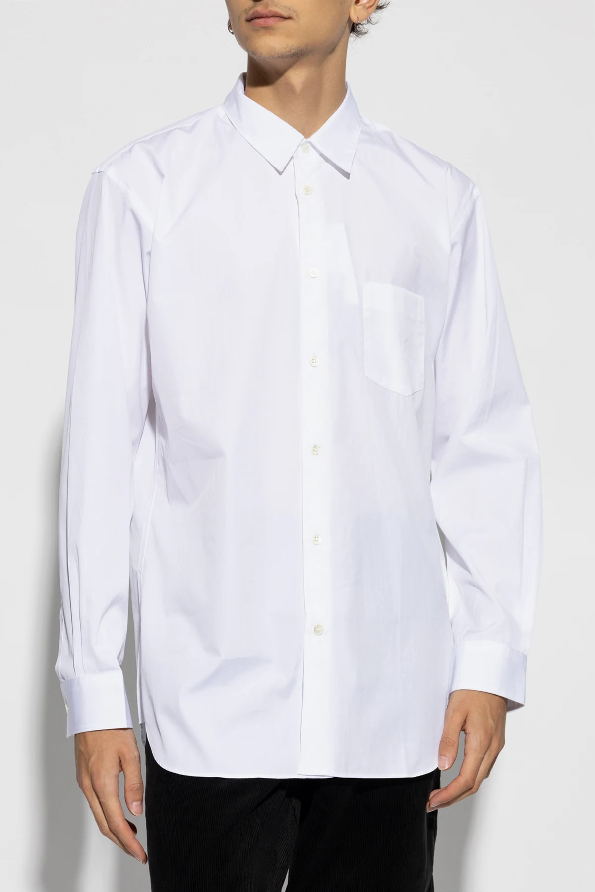 Introducing the \"Pocket Shirt\" by the esteemed fashion house Comme des Garçons Shirt. This exquisite men\'s white shirt epitomizes elegance and simplicity, crafted from 100% premium cotton. The shirt boasts a classic, straight cut with long sleeves and a rounded hem, ensuring a timeless silhouette. The \"Pocket Shirt\" is a solid white hue, devoid of any patterns or prints, providing a versatile canvas for both formal and casual ensembles. A rectangular pocket adorns the left chest, adding a subtle yet functional detail. The white buttons seamlessly blend with the fabric, maintaining the shirt\'s refined aesthetic, while the classic collar enhances its sophisticated appeal. Designed with wide, buttoned cuffs, this shirt allows for adjustable wrist fit, ensuring comfort and style. The back of the shirt is kept simple and unadorned, emphasizing its minimalist design. This versatile piece is expertly tailored to complement a variety of styles, from sleek business attire to relaxed weekend wear. Why Choose This Product? Timeless Design: Classic straight cut with a rounded hem for a perennial look. High-Quality Material: Crafted from 100% premium cotton for superior comfort and durability. Elegant Details: Features a rectangular chest pocket and harmonizing white buttons. Versatile Styling: Suitable for both formal and casual occasions, showcasing its adaptability. Renowned Designer: A creation by Comme des Garçons Shirt, known for its impeccable craftsmanship and modern fashion interpretations.