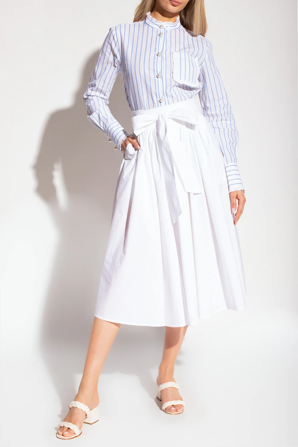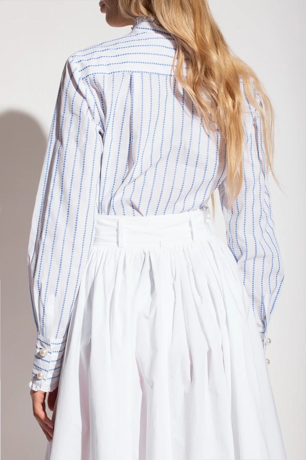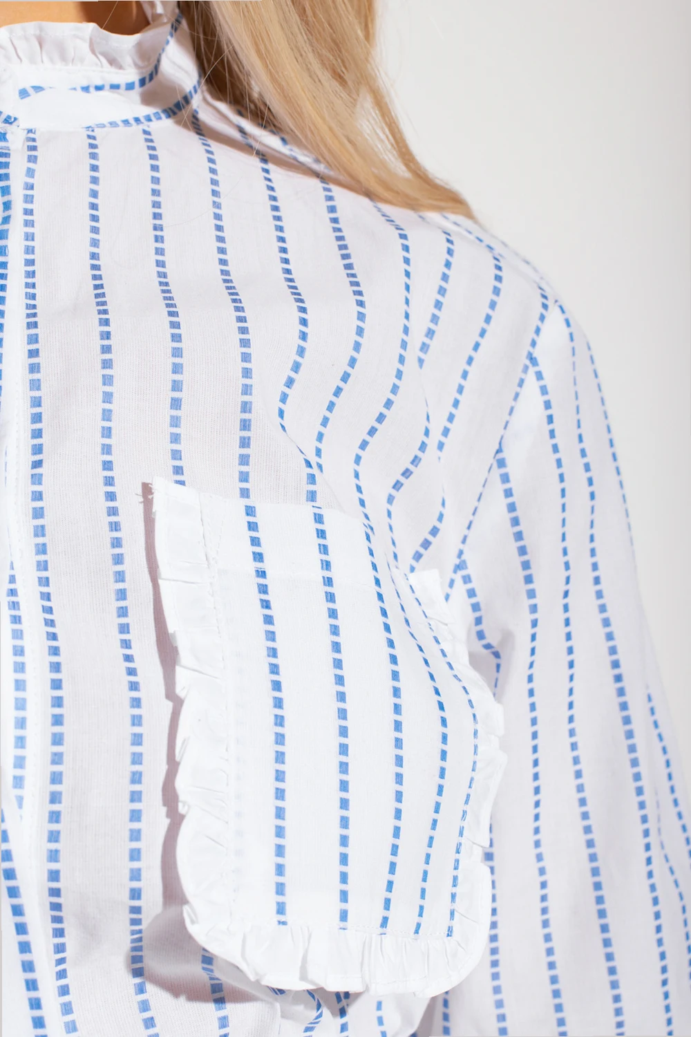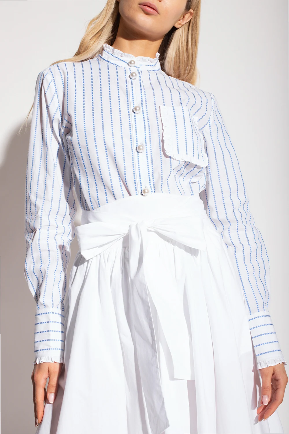 White ‘Berte’ shirt with a stand collar from Custommade. Crafted from organic cotton, this garment features pearly buttons, blue pinstripe pattern, decorative ruffles, front pocket and long sleeves with buttoned cuffs.