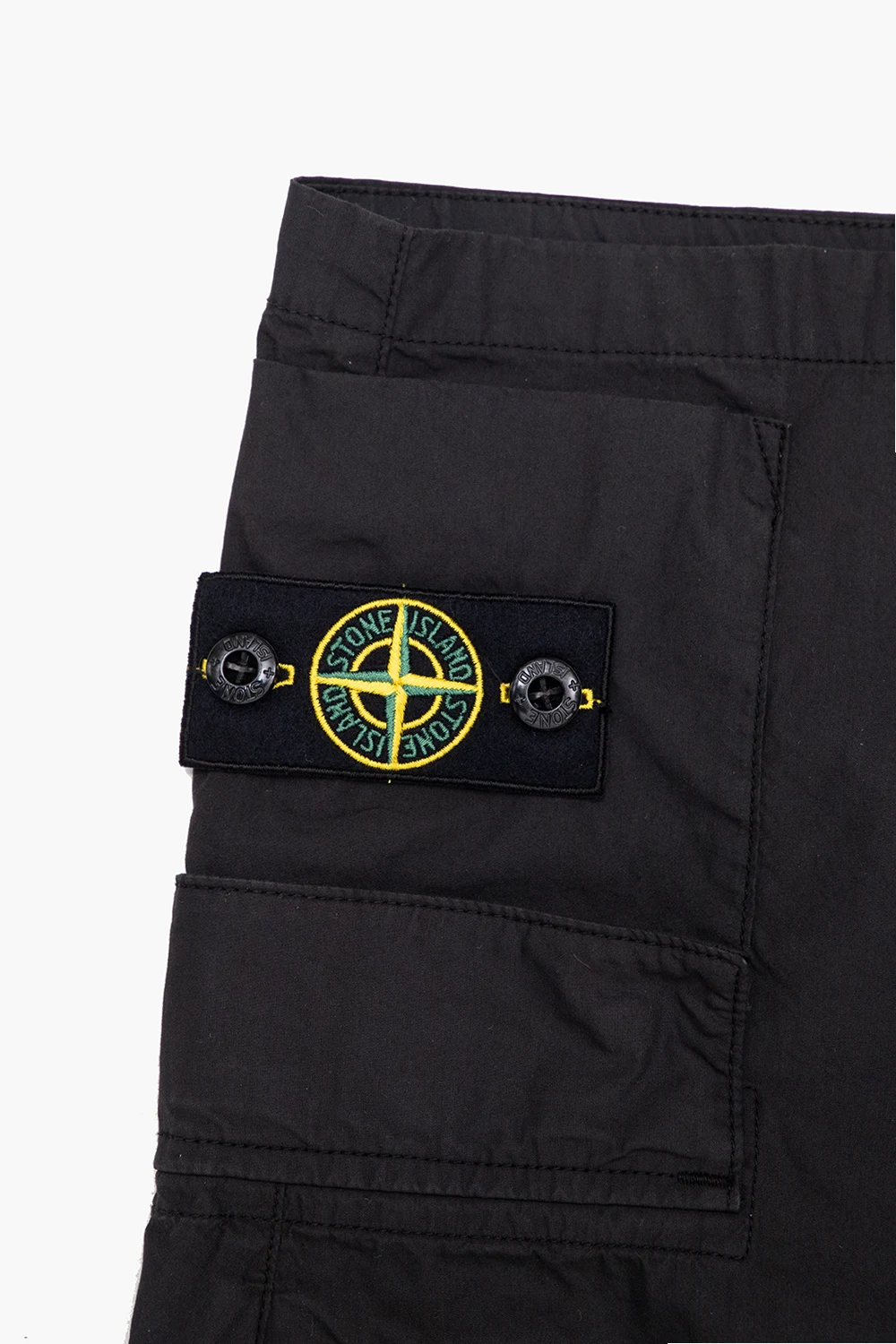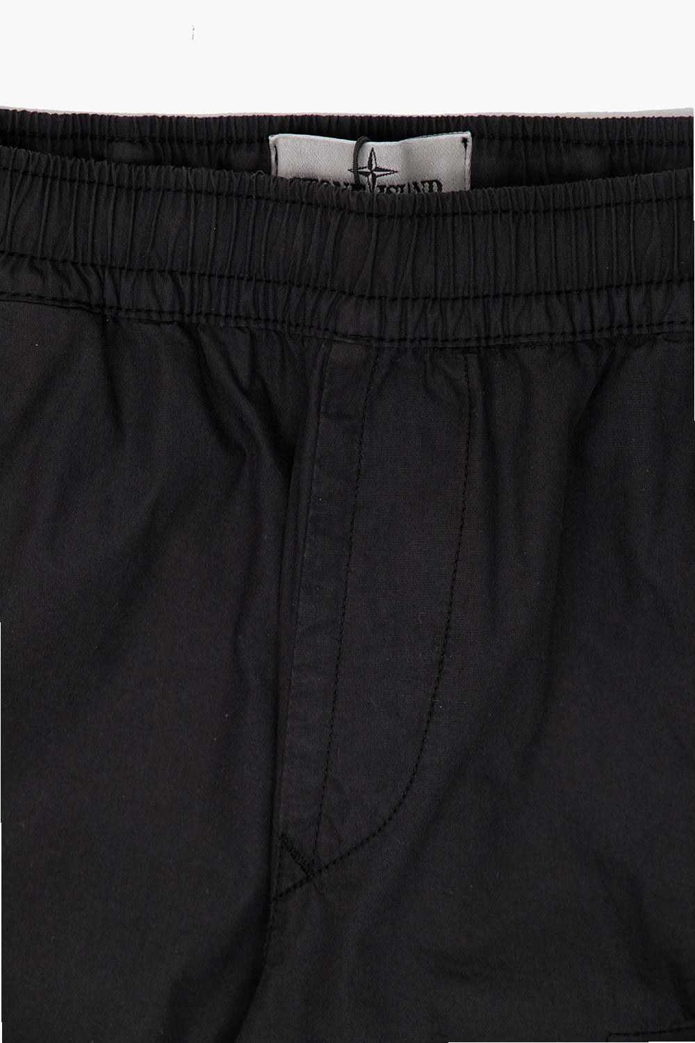 Black shorts from Stone Island Kids. Crafted from a cotton blend, this pair is complete with an elastic drawstring waistband, detachable logo patch, two zip pockets, one slip pocket and one snap-fastened flap pocket.