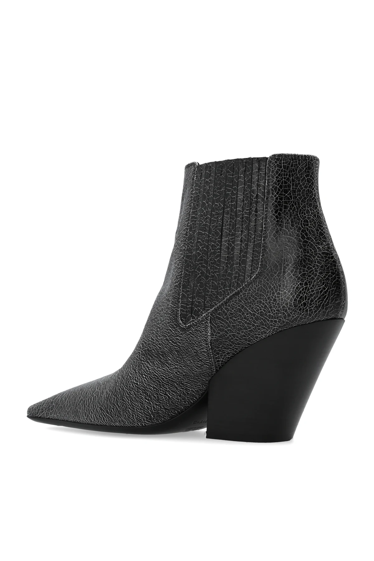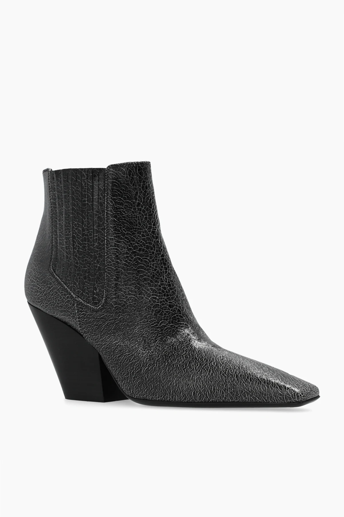 Black heeled ankle boots from Casadei. Crafted from leather with a cracked effect, this model sits on a black leather sole and features a slip-on silhouette with an elongated square toe, elastic panels on the sides and a tapered heel.