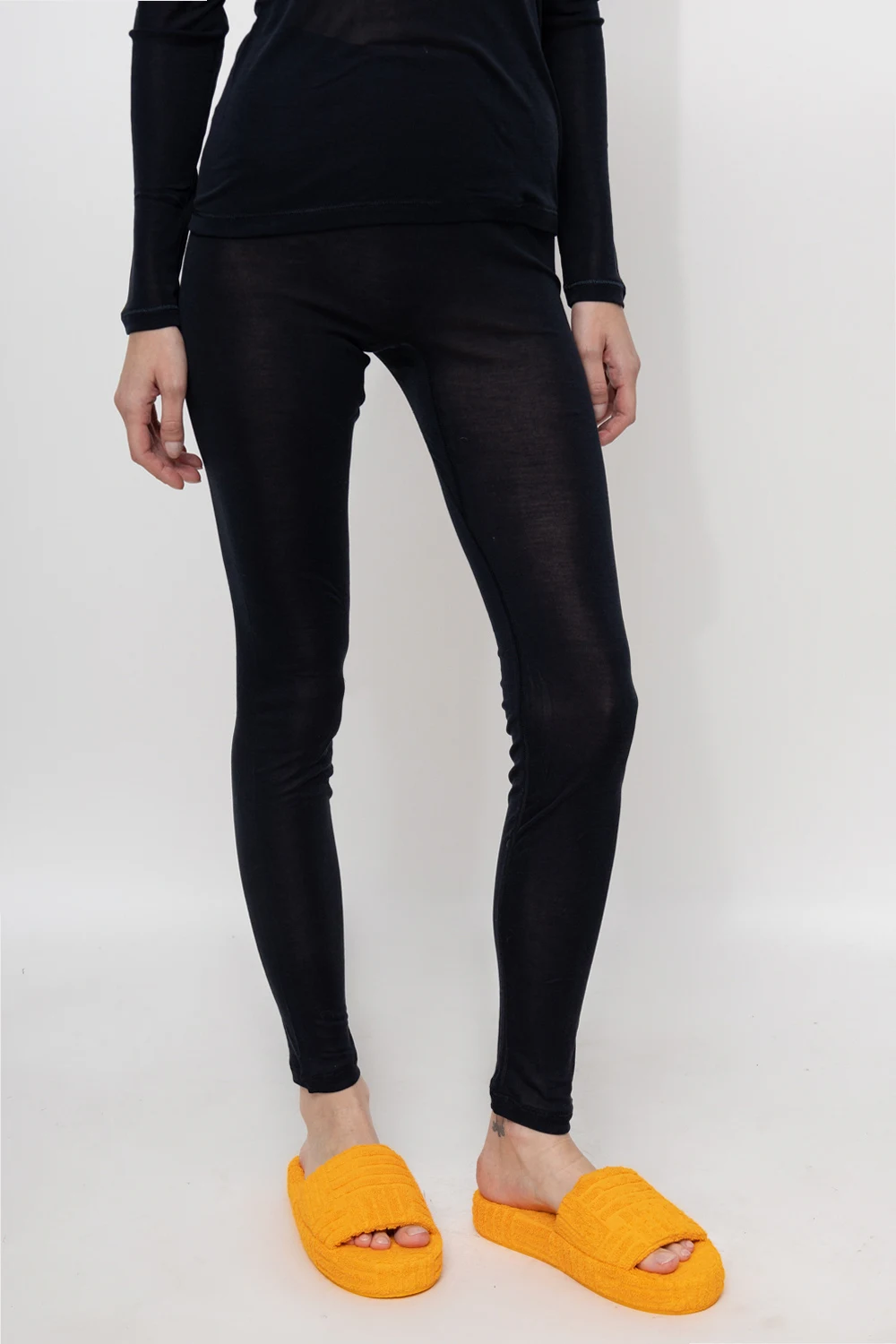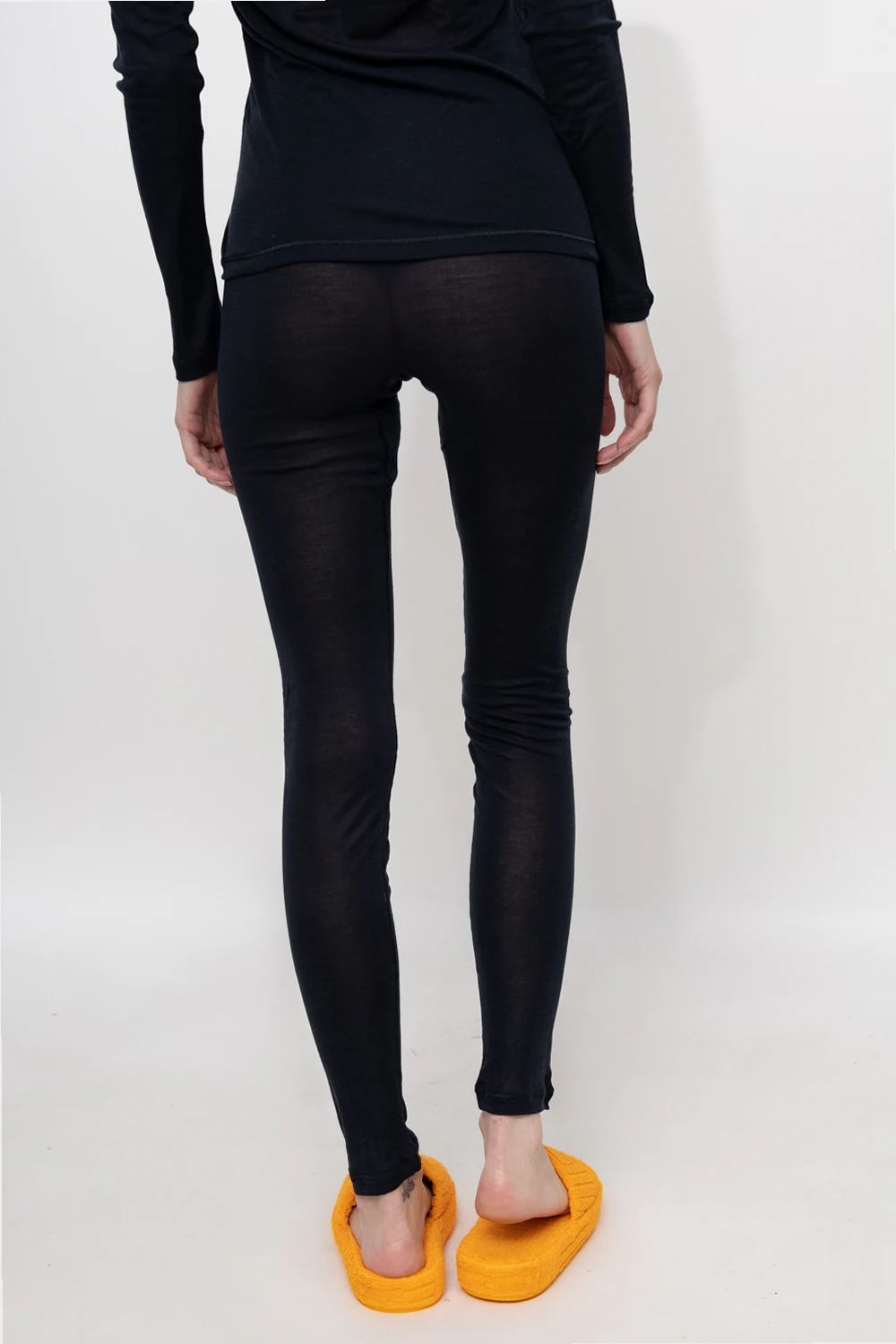 Black leggings from Hanro. Made from silk, they feature long legs and an elastic waistband.