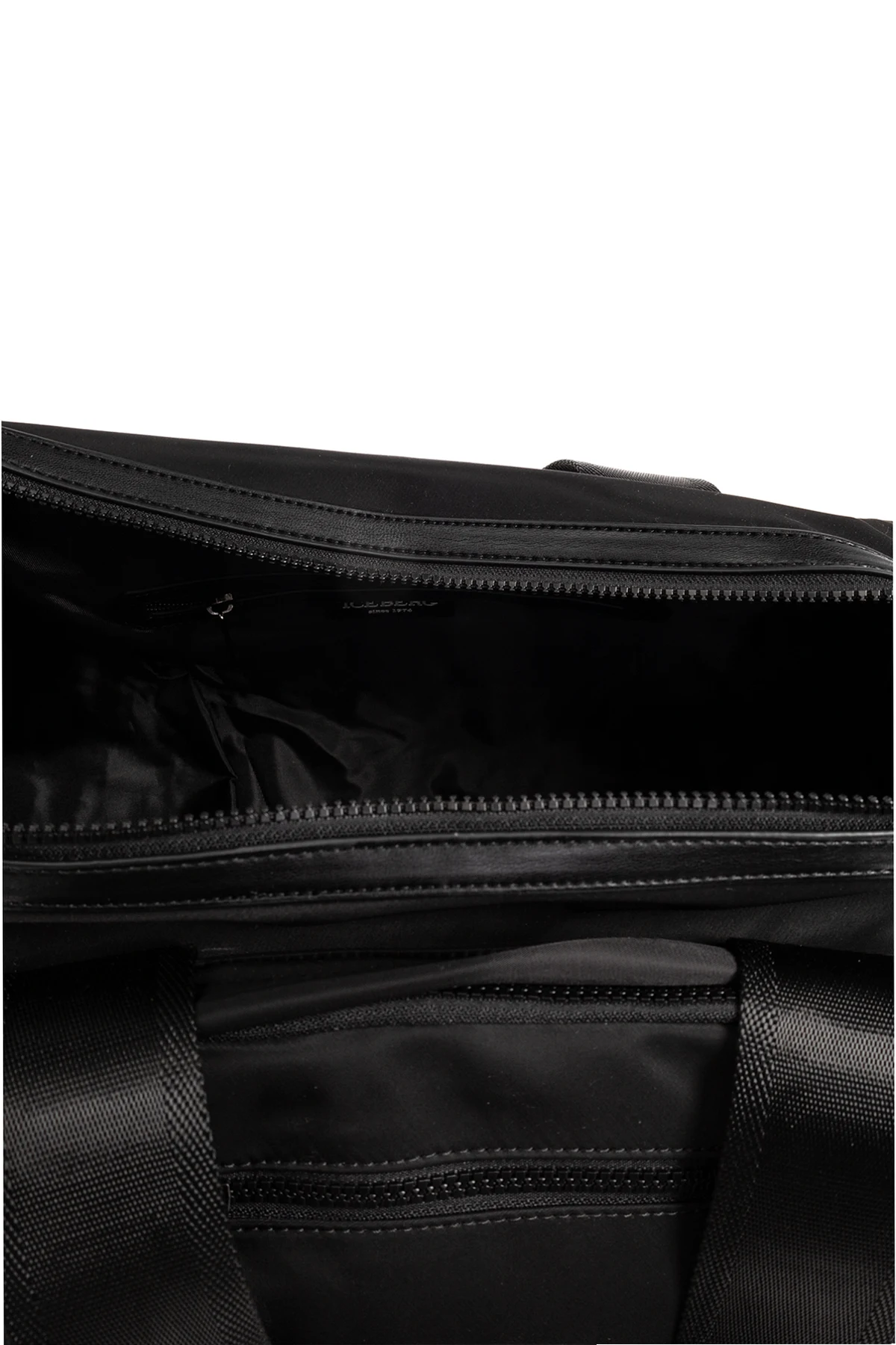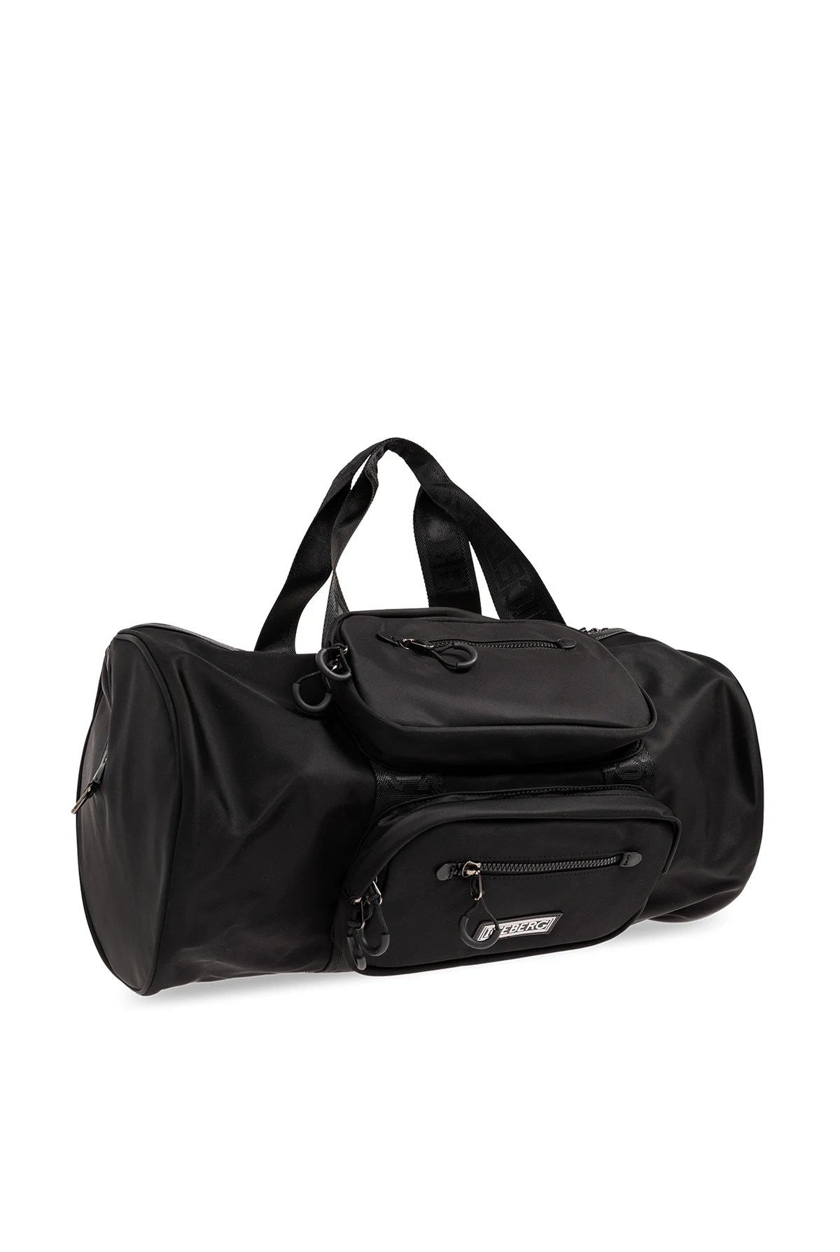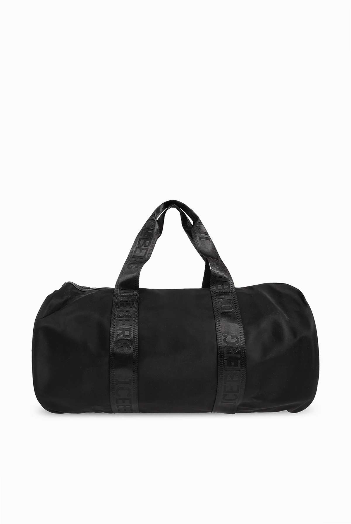 Black travel bag from Iceberg. Fastened with a two-way zip, this design features a logo patch, two zipped front pockets, two half-round handles, shoulder strap, black metal hardware and one internal compartment with one zip pocket.