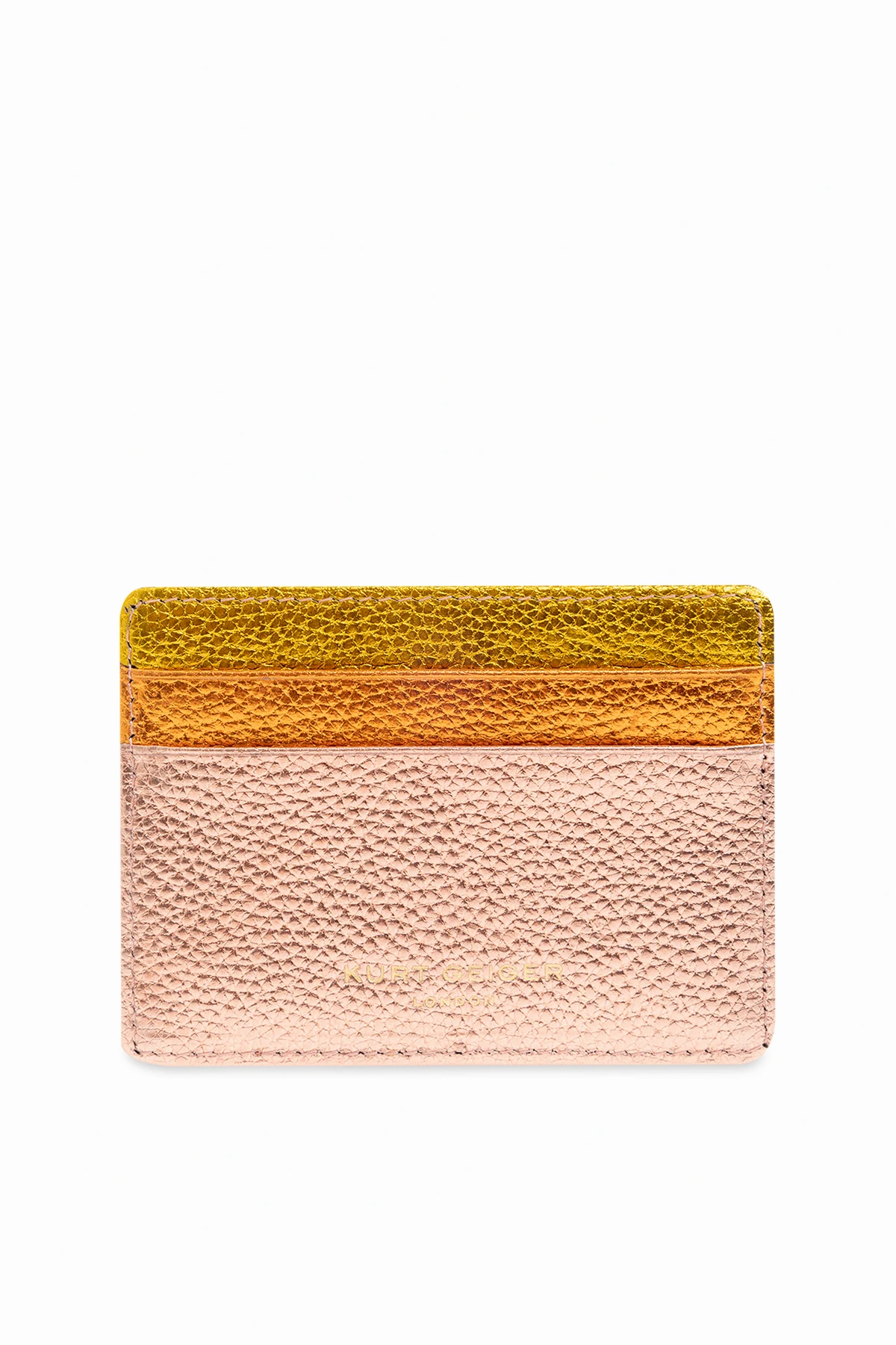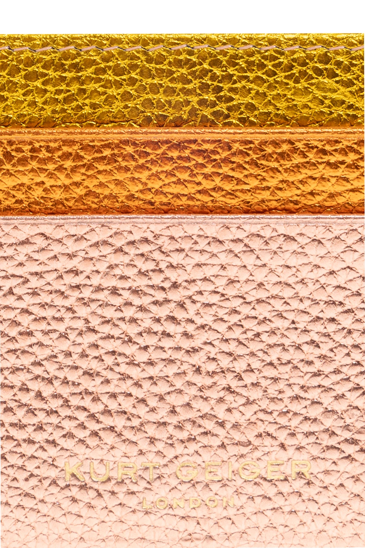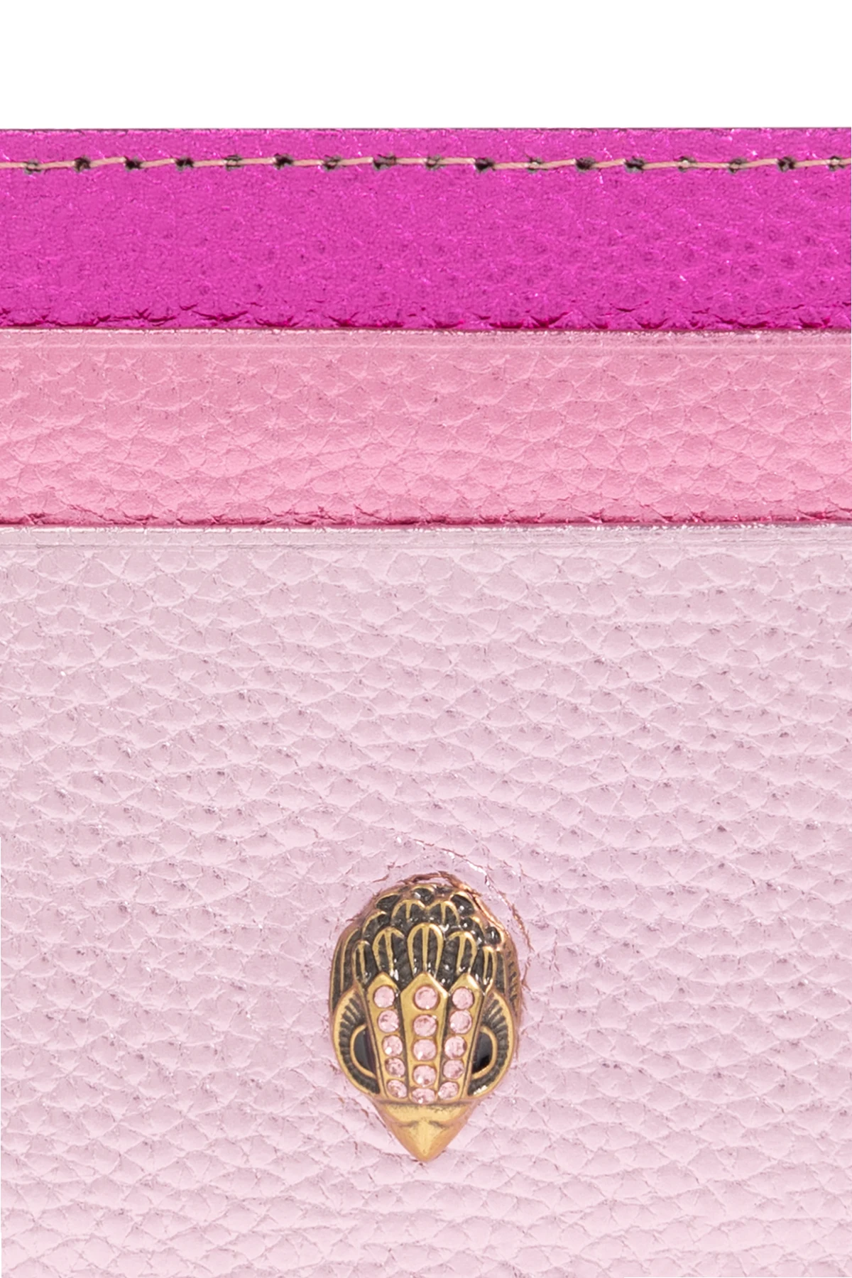 Multicoloured card case from Kurt Geiger. Made from grained leather with a metallic finish, this item fastens via a zip and showcases the brand\'s signature Eagle head hardware encrusted with crystals on the front, five card slots and a printed gold-tone logo on the back.