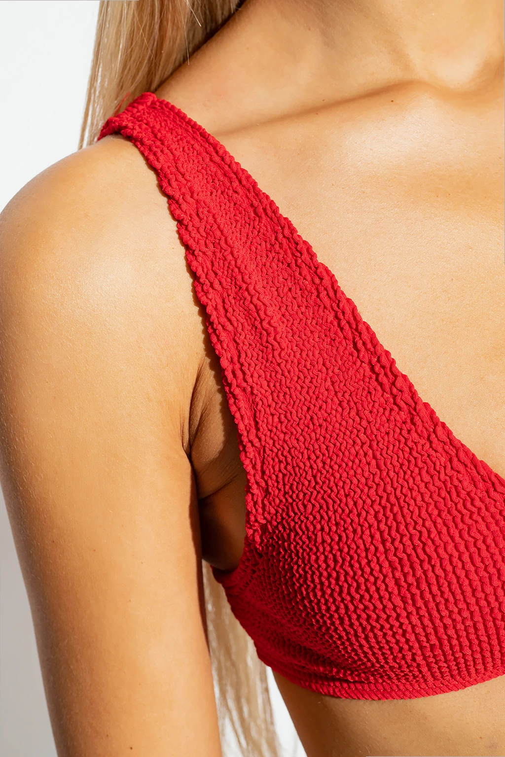 Red \'Scout’ swimsuit top from Bond-Eye. This item was made in part from recycled material with a texture.