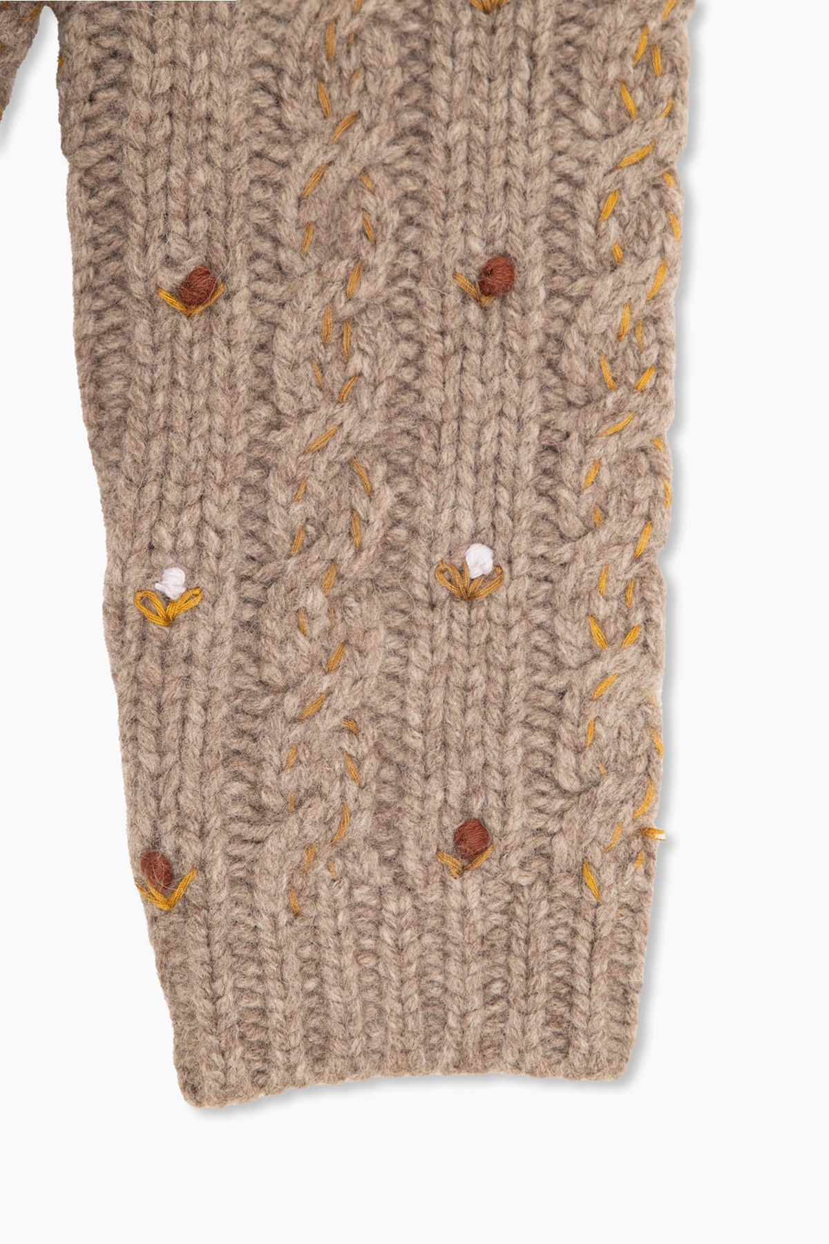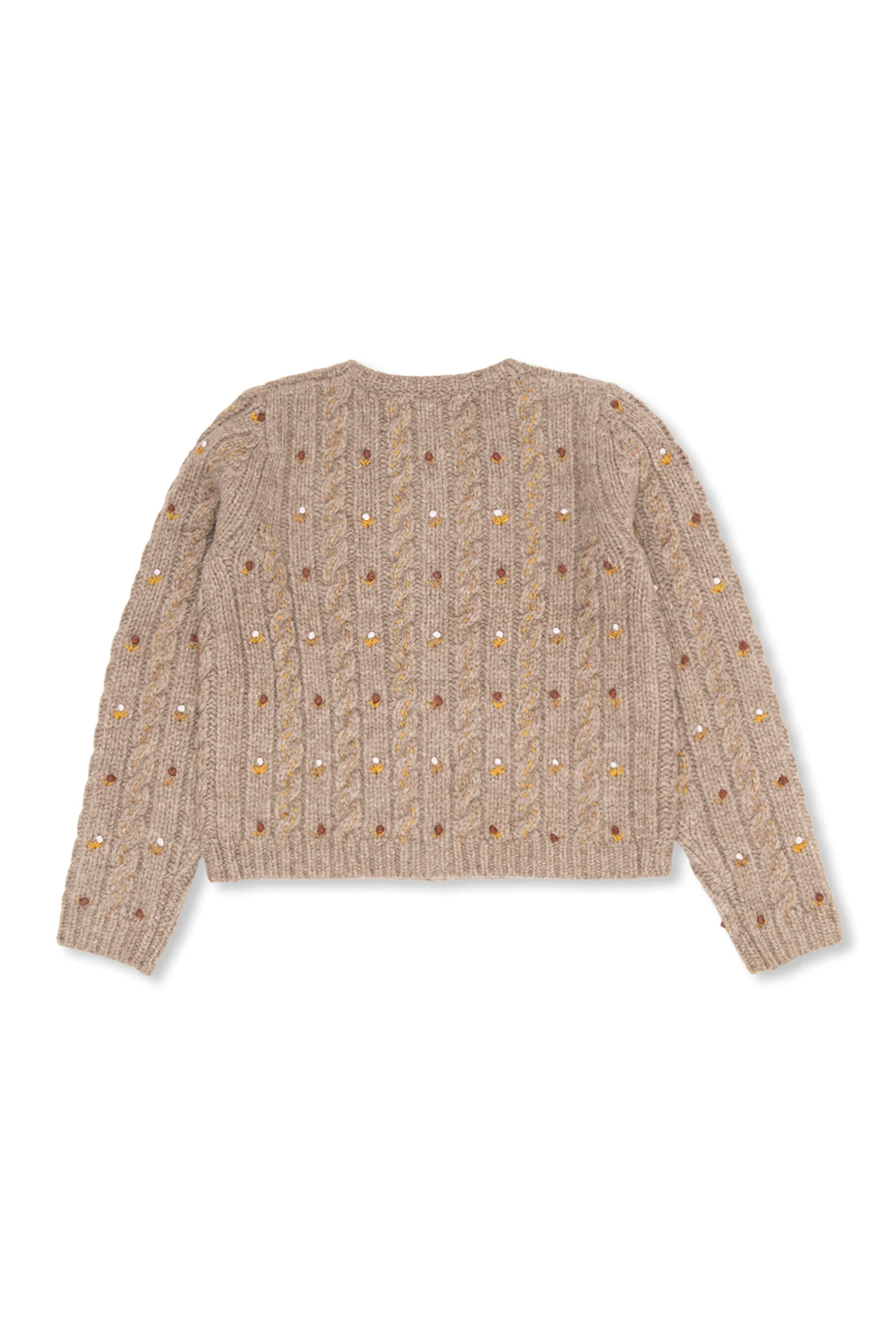 Brown ‘Dallulah’ cardigan from Bonpoint. Made from a blend of wool and yak, this style fastens with buttons and showcases a floral pattern, long sleeves and ribbing on the round neck, bottom hem and cuffs.