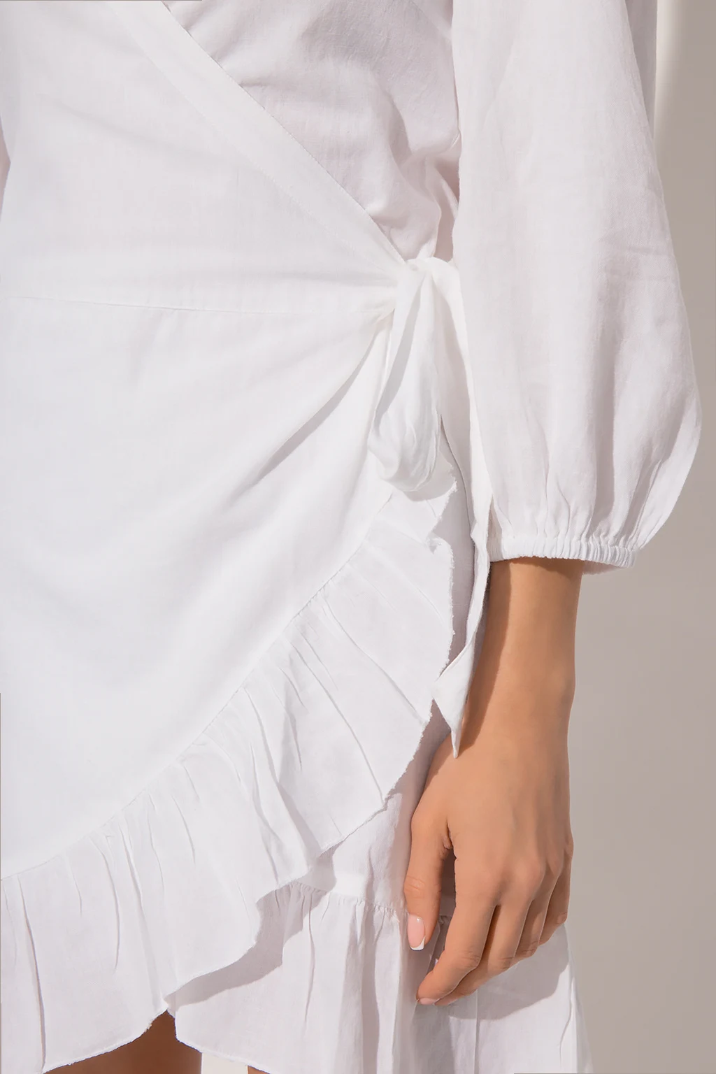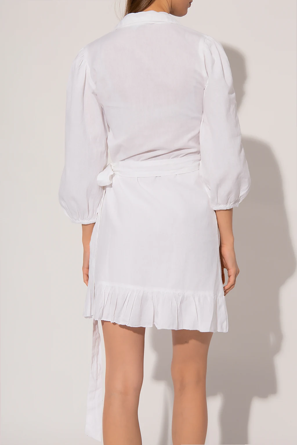 White ‘Paige’ beach dress from Melissa Odabash. Cut with a wrap-around silhouette, this style features a self-tie waist, a V-neckline, long sleeves and a ruffled hemline.