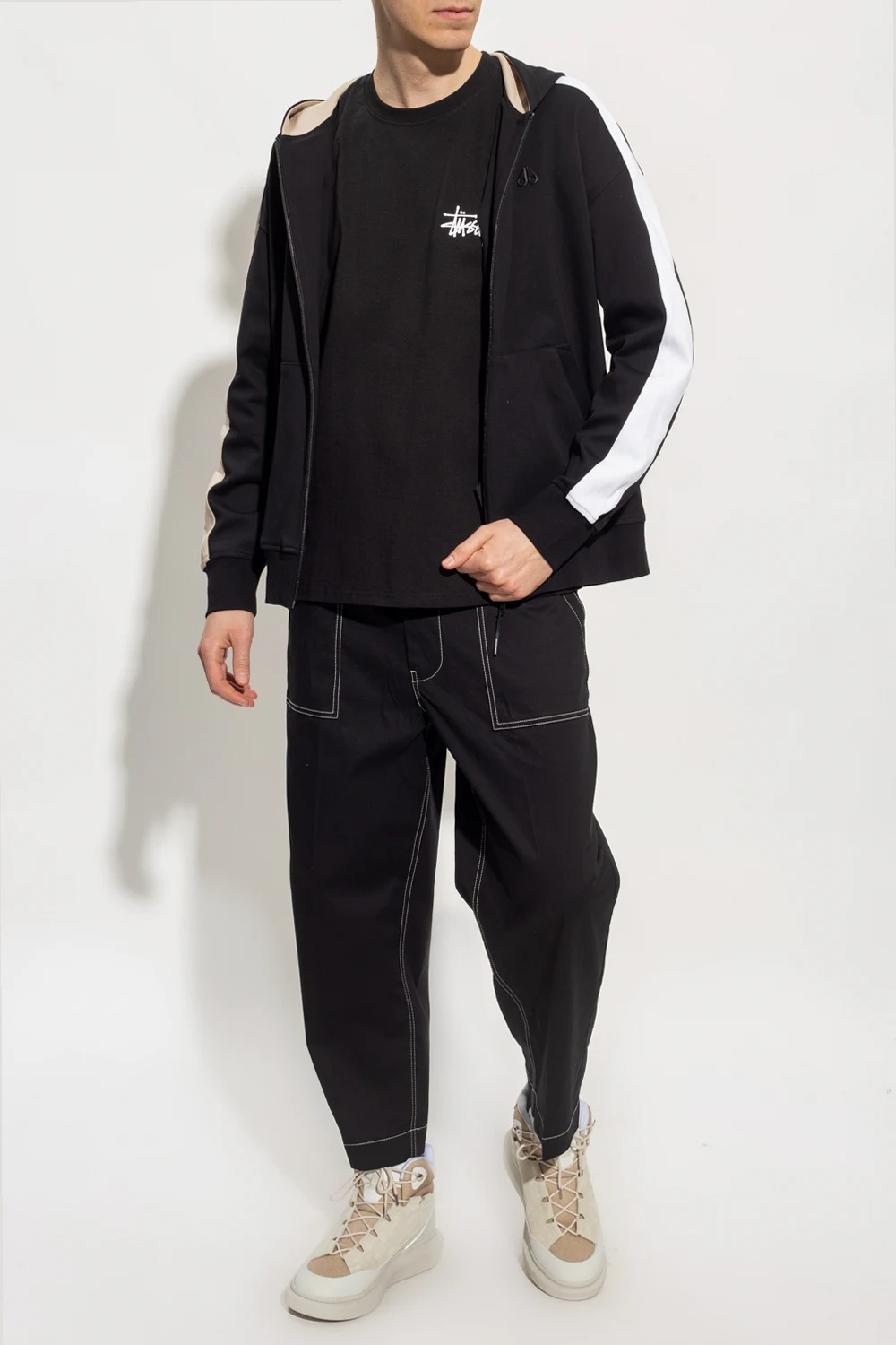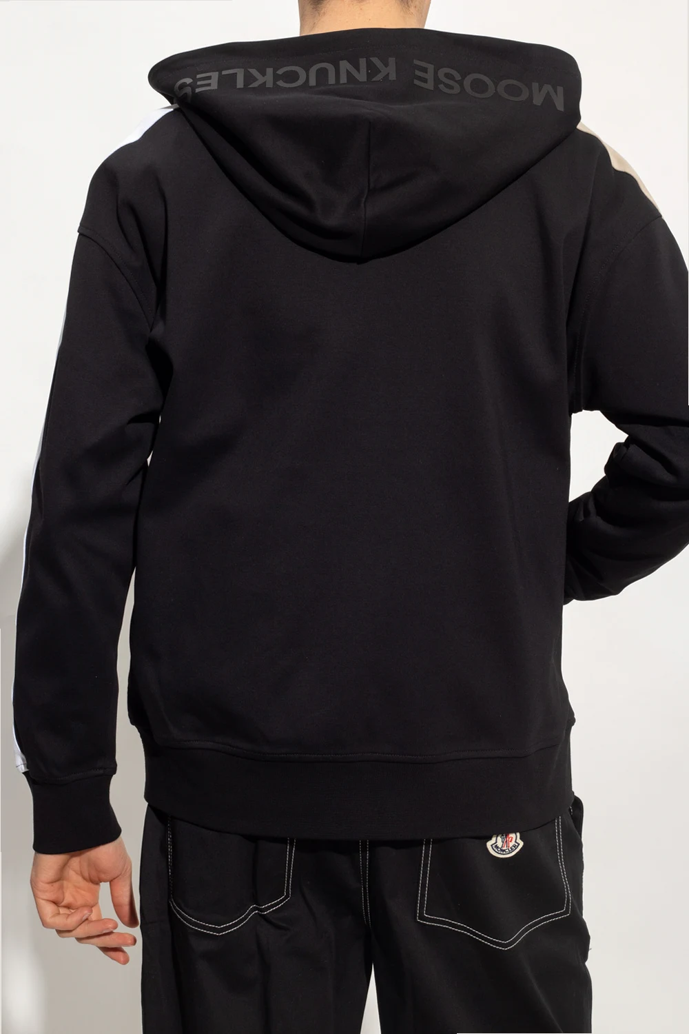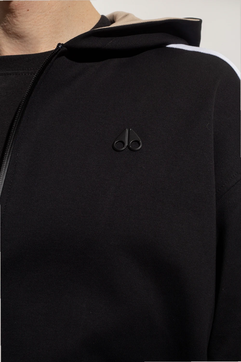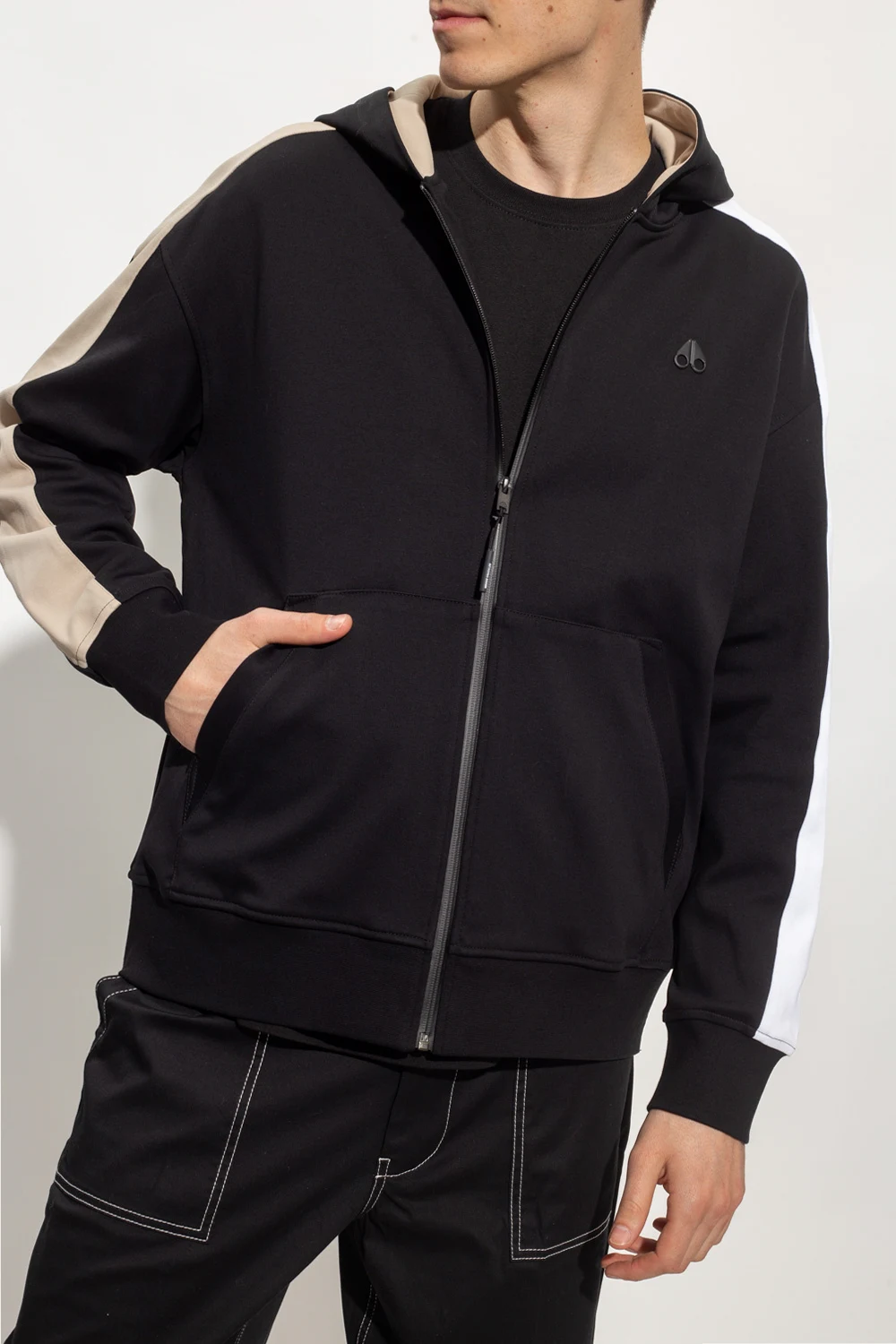 Black ‘Vero Beach’ hoodie from Moose Knuckles. Made of cotton, this long sleeve design features a zip fastening, hood with a logo, logo appliqué, two slip pockets, beige and white sleeve stripes and ribbed trims at the hem and cuffs.