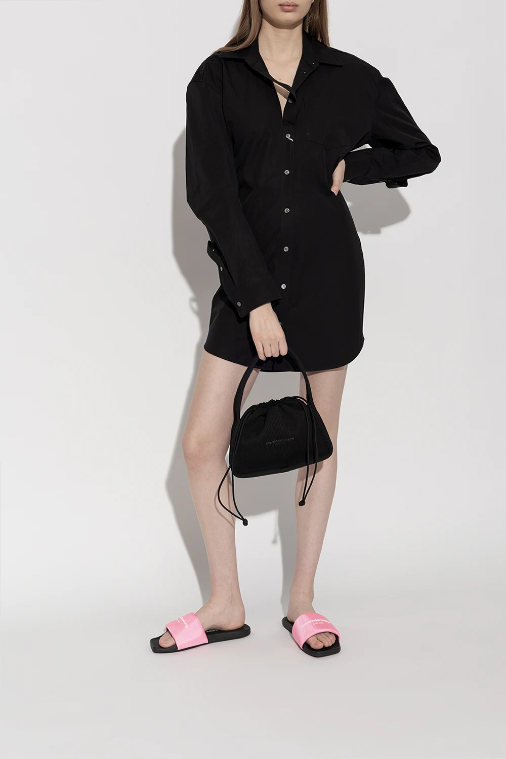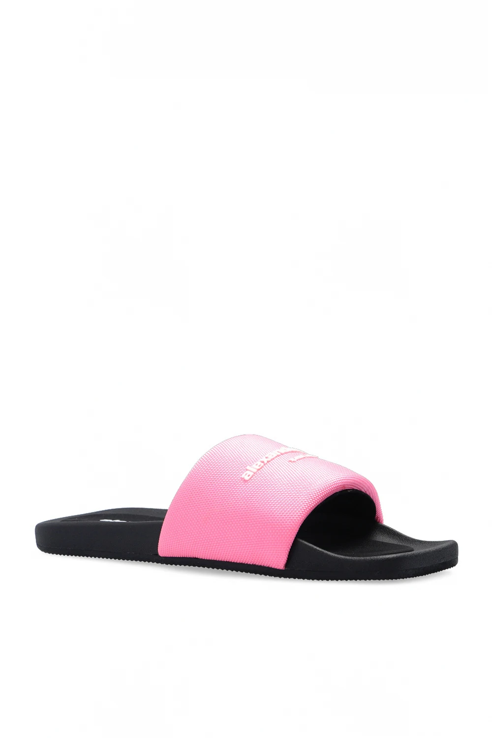 Black and pink slides from Alexander Wang. Resting on a black rubber sole, this square toe design is decorated with a rubber logo appliqué in white.