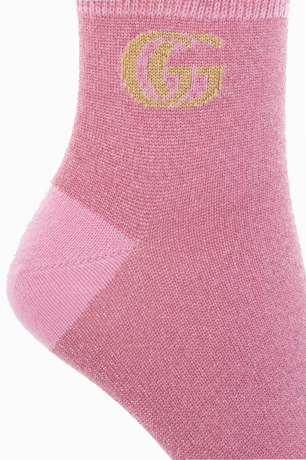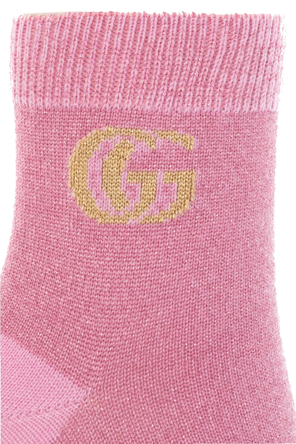 Pink socks from Gucci. Made of cashmere with a touch of lurex thread, they feature a gold-tone logo graphic and an elastic edge.