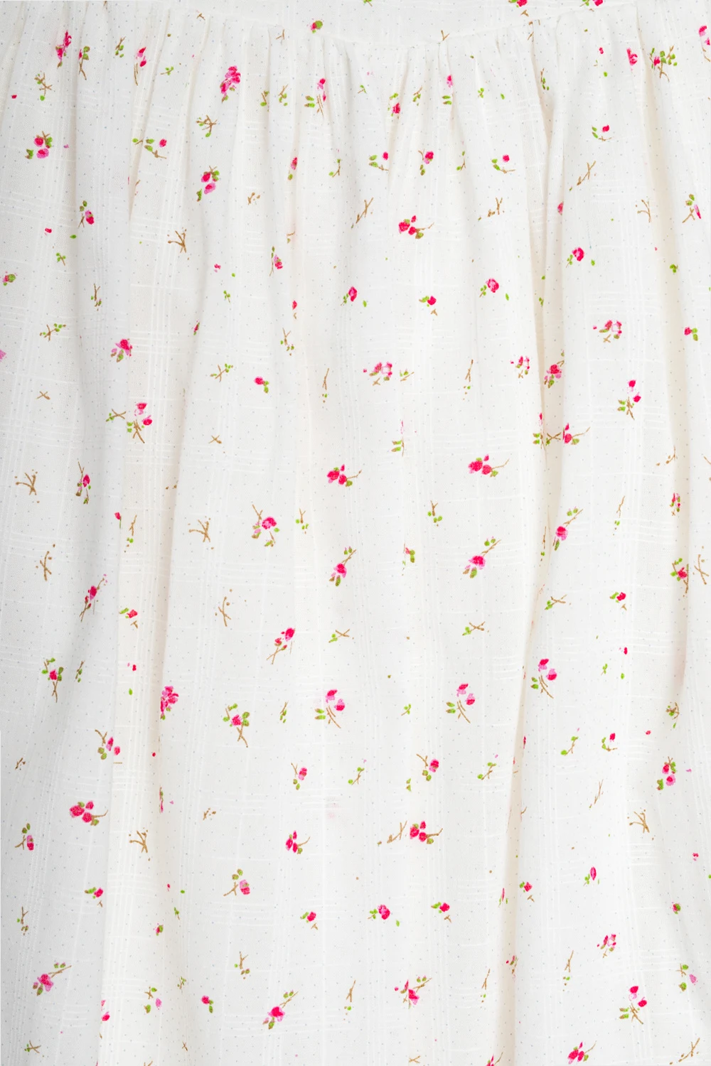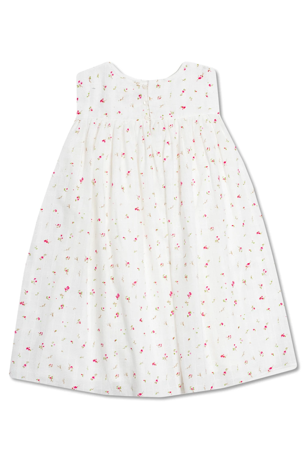 White sleeveless dress from Bonpoint. Embellished with a green and red floral print, this style features button fastenings at the back and a flared hem.