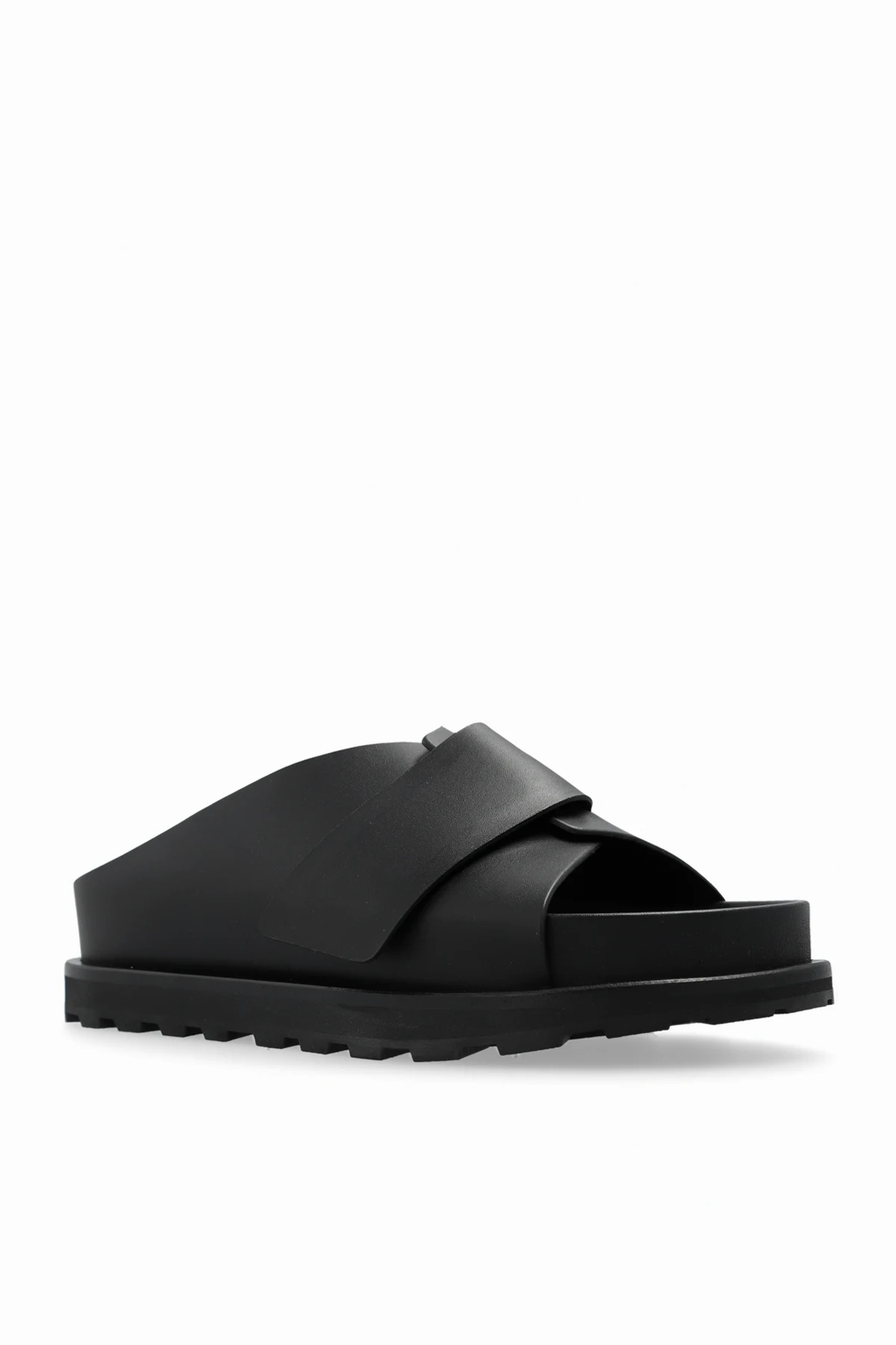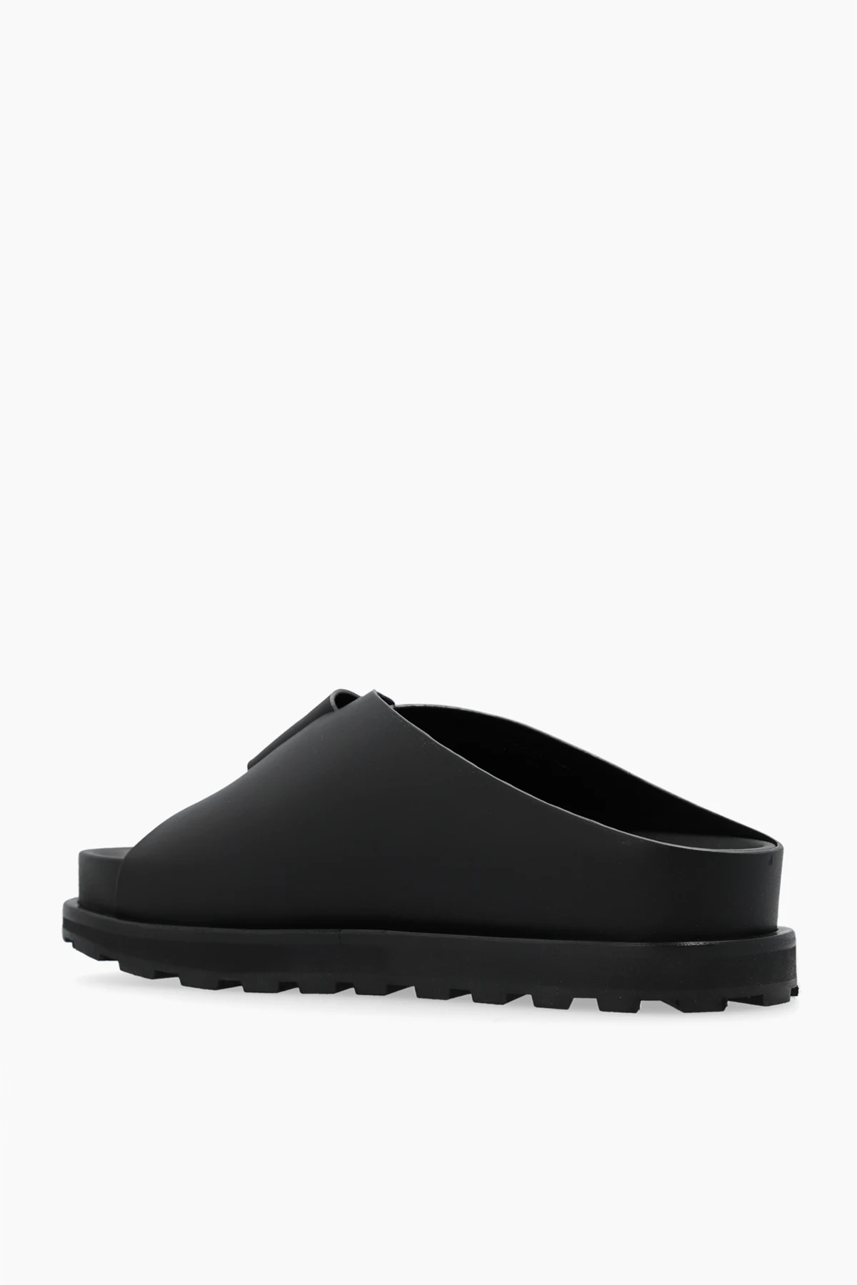 Black slides from JIL SANDER. Made of leather, this model sits on a black rubber sole and features a velcro fastener.