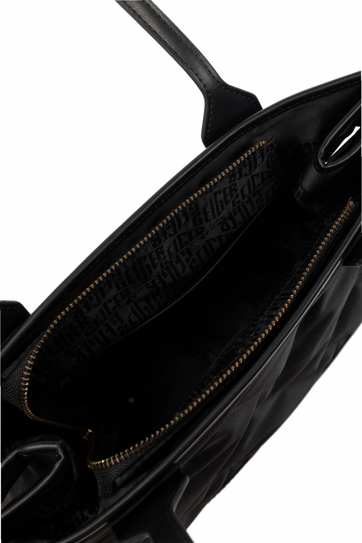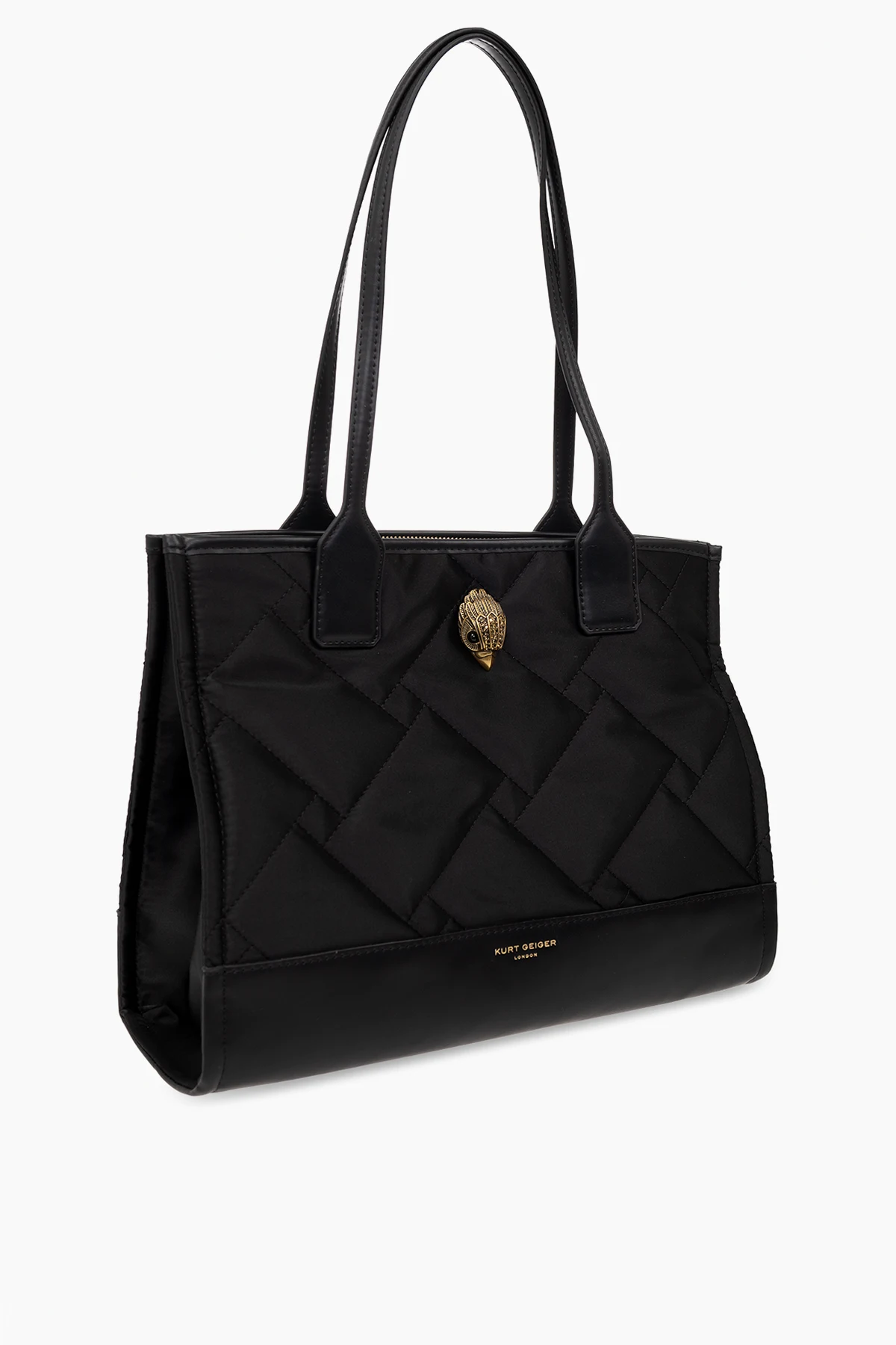 Black ‘Recycled SQ’ quilted shopper bag from Kurt Geiger. Made from recycled material, this design fastens with a zip and showcases the brand\'s signature Eagle head accompanied by an antiqued gold-tone logo print. It is complete with two half-round handles, antiqued gold-tone metal hardware and one internal compartment with two slip pockets.