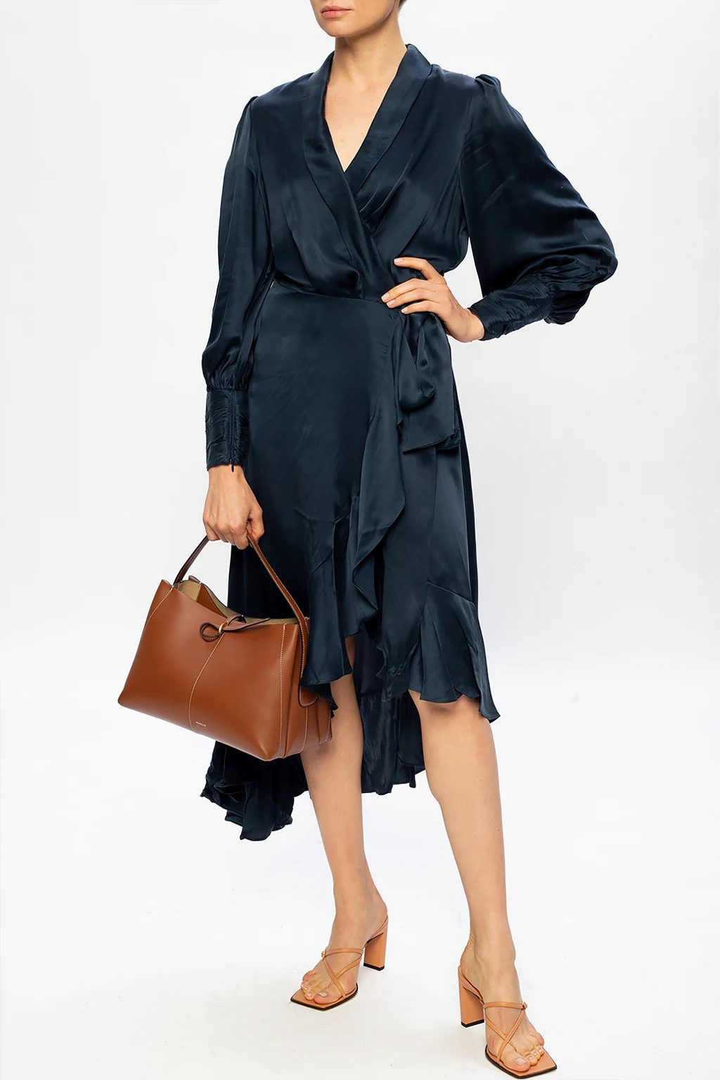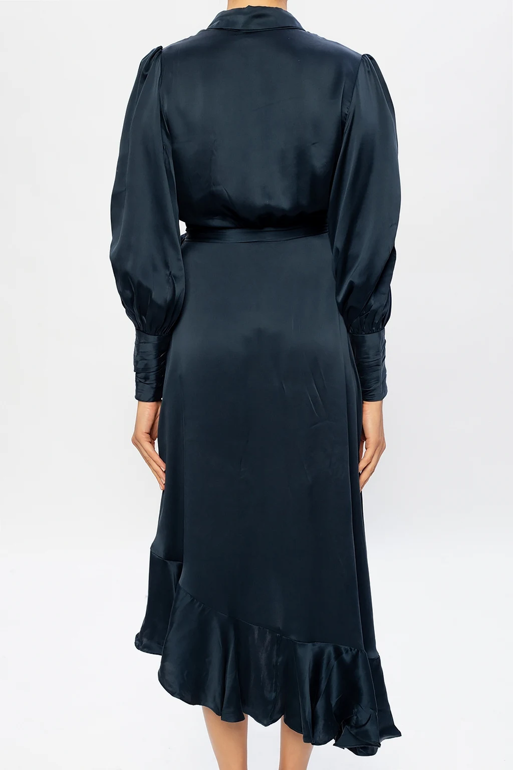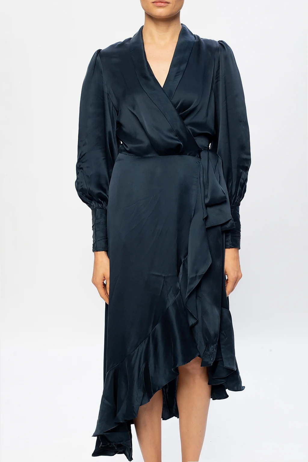 Navy asymmetrical dress from Zimmermann. Crafted from silk, this long sleeve design is complete with a waist tie and a ruffle trim.