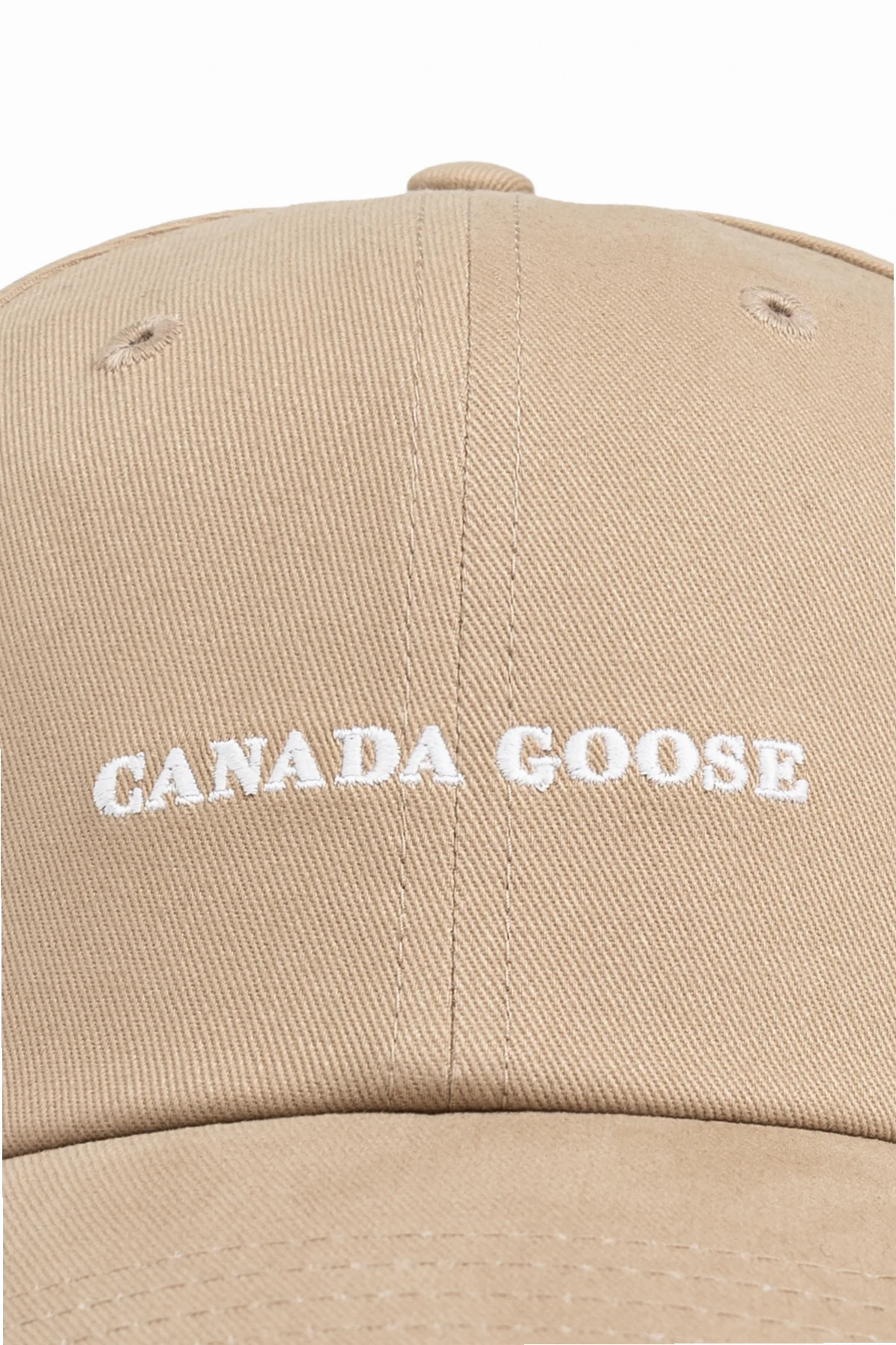 Introducing the epitome of refined headwear: the Cotton Baseball Cap by Canada Goose, available in an exquisite beige hue. Crafted with premium cotton, this cap ensures unparalleled comfort and breathability. Exhibiting a classic silhouette with a curved brim, this cap boasts a six-panel construction complete with ventilation eyelets on each panel. The front proudly displays an intricately embroidered white \"CANADA GOOSE\" logo, a testament to meticulous craftsmanship and superior quality. The back features an adjustable strap with a metal buckle, allowing for a customized fit. This unisex accessory seamlessly blends simplicity and elegance, making it an indispensable addition to any wardrobe. Why Choose This Product? Timeless beige color that complements any outfit. Made of high-quality cotton for comfort and breathability. Six-panel design with ventilation for optimal airflow. Adjustable strap with a metal buckle for a perfect fit. Unisex design suitable for both men and women. Embroidered branding that signifies luxury and attention to detail.
