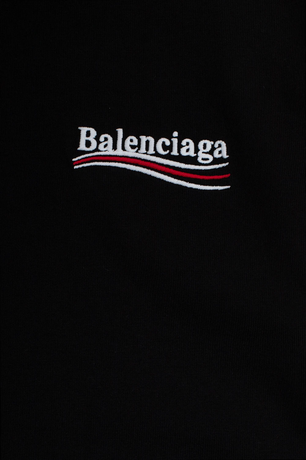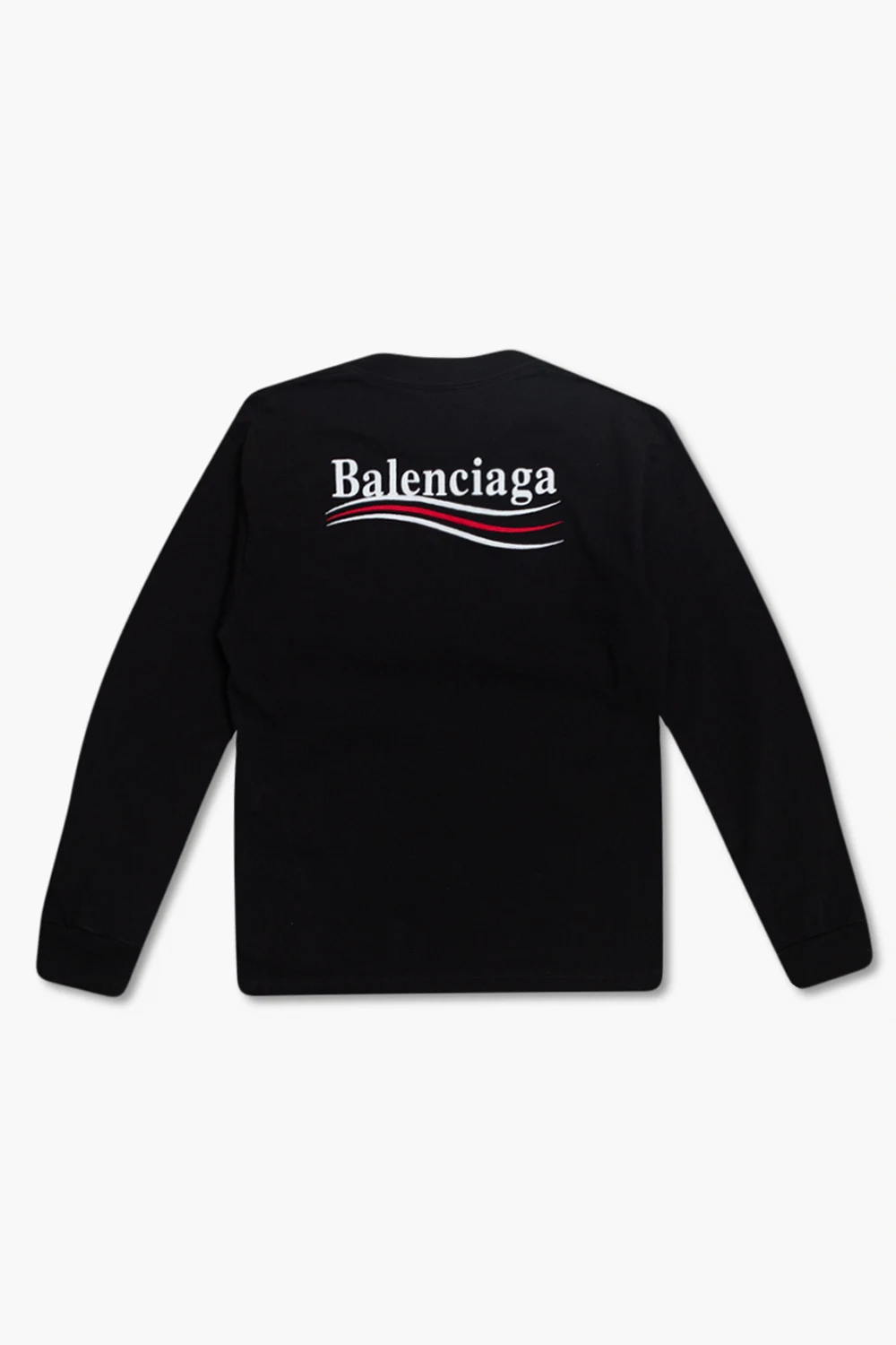 Black T-shirt from Balenciaga Kids. Crafted from cotton, this long sleeve design features an embroidered logo pattern in white and red as well as ribbed trims at the crew neck and cuffs.