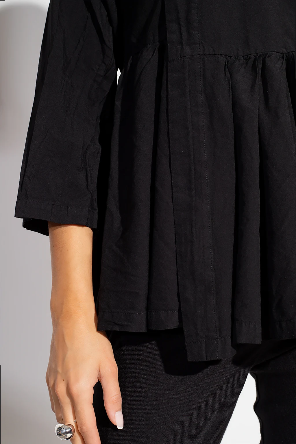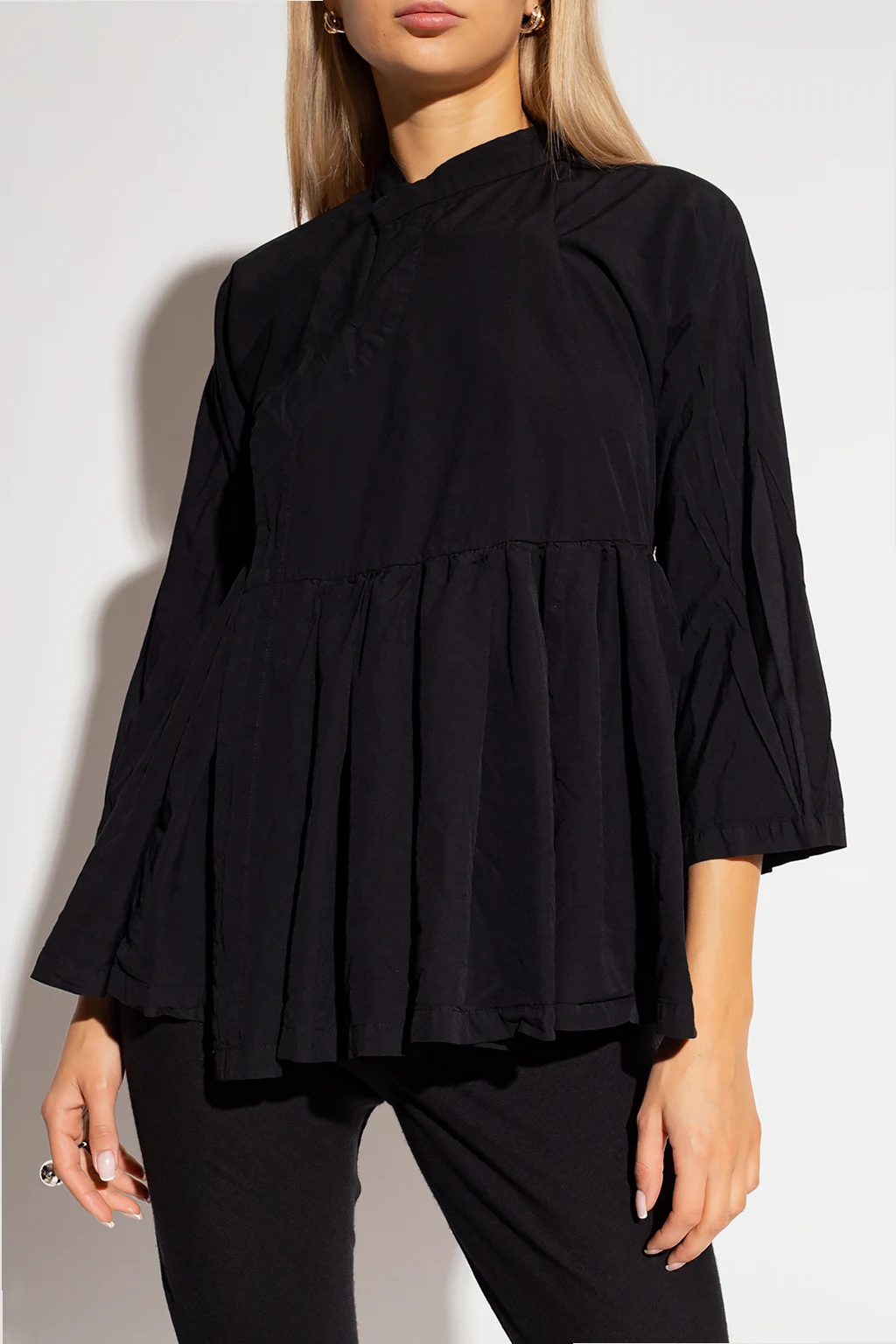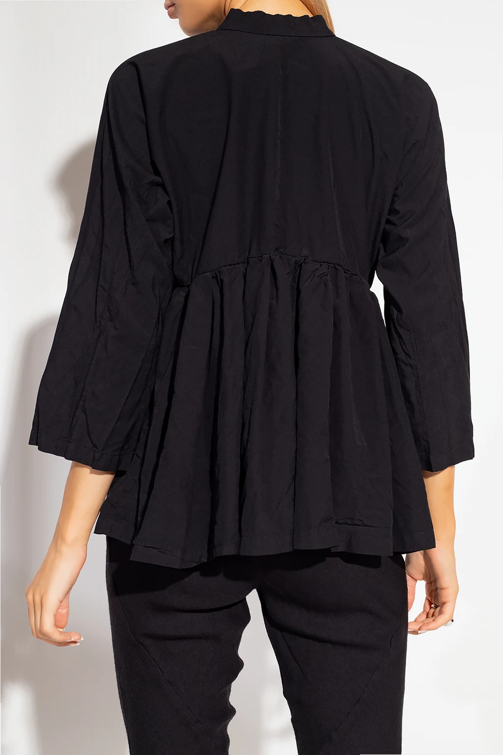Black shirt from Comme des Garcons. Crafted from cotton with a relaxed fit, this style features a wrap-around silhouette with snap closures, drawstring, a distinctive collar and long sleeves.
