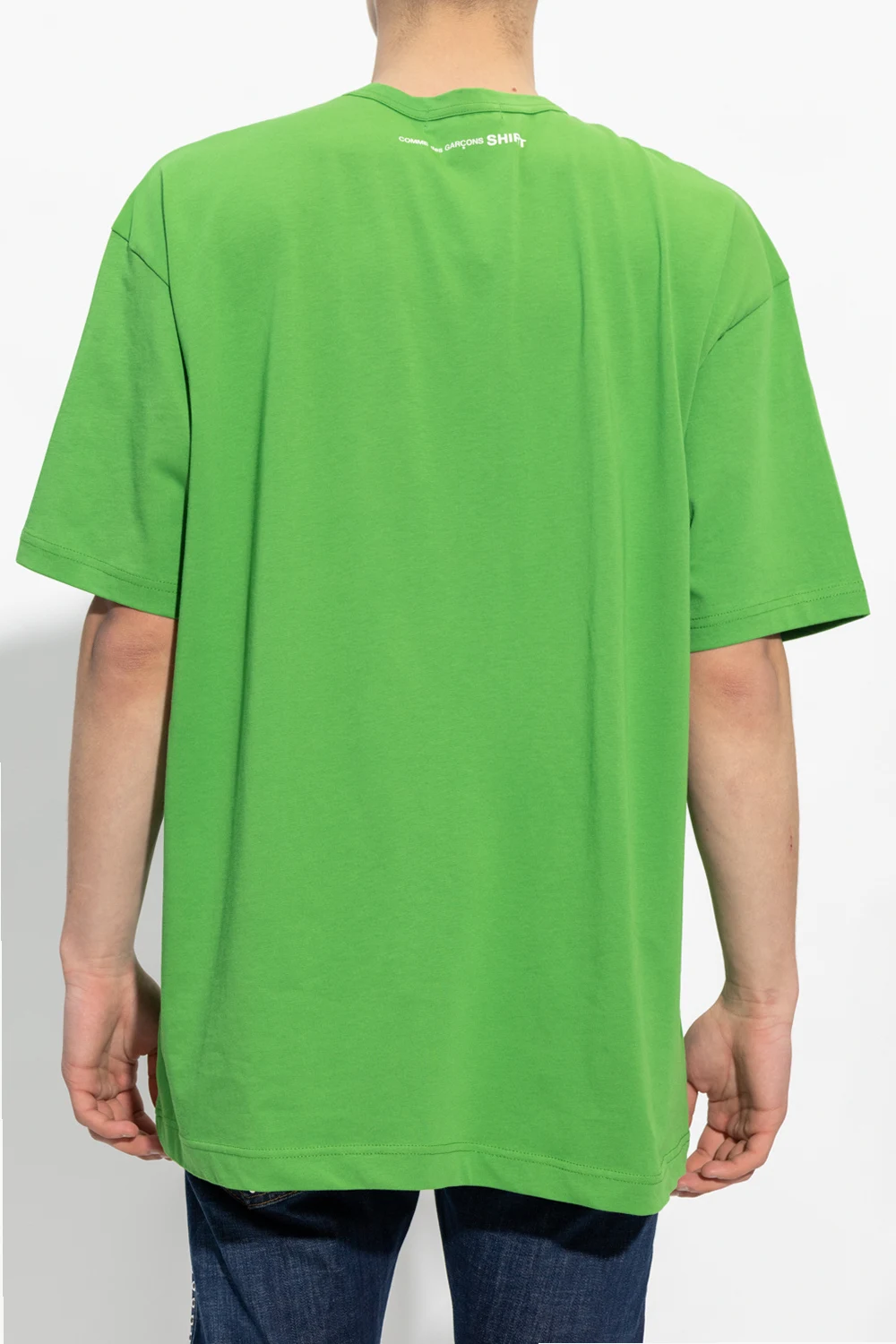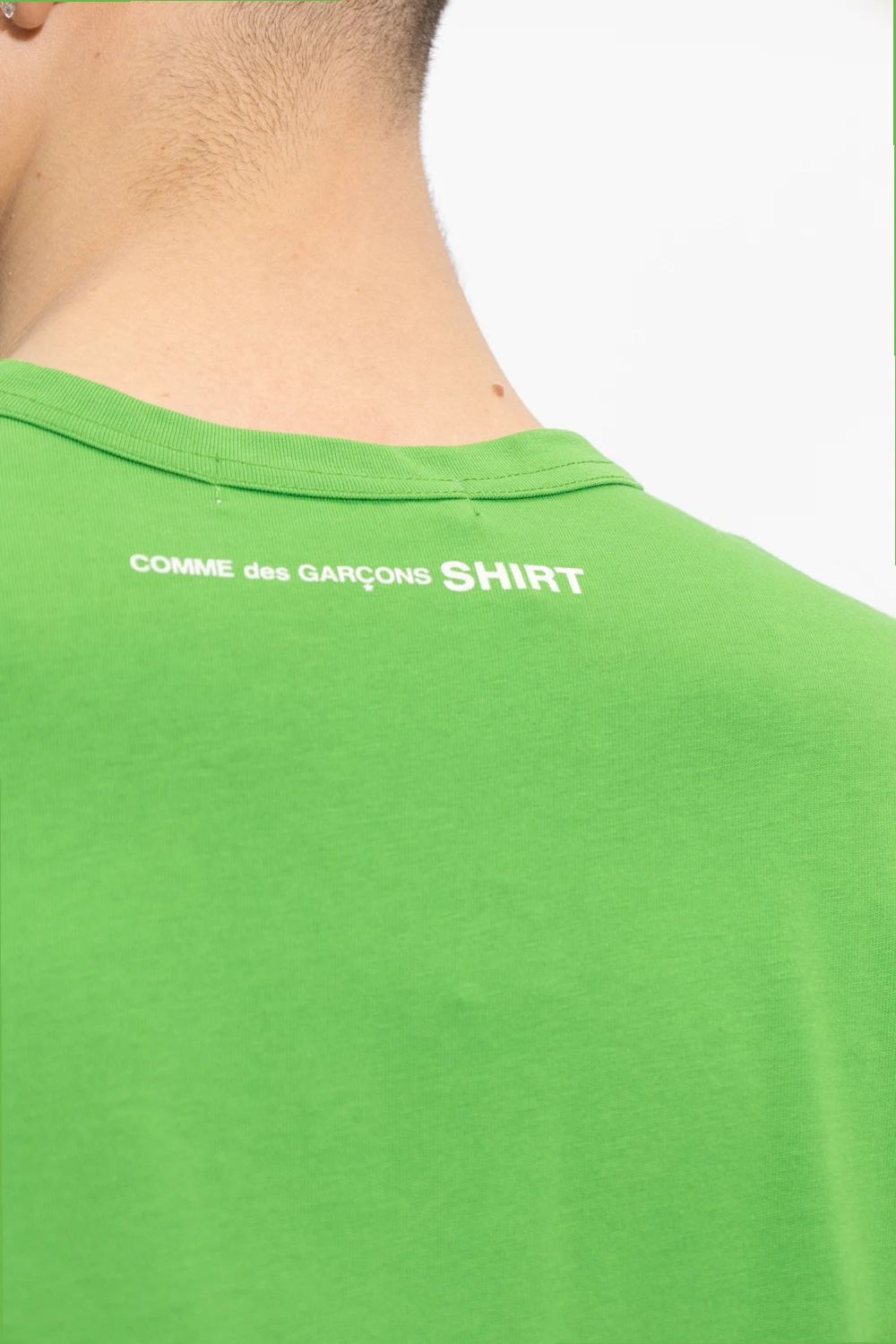 Green crewneck T-shirt from Comme des Garcons Shirt. Made of cotton, this style features a white logo print at the back and stitching details on the short sleeve and hem.