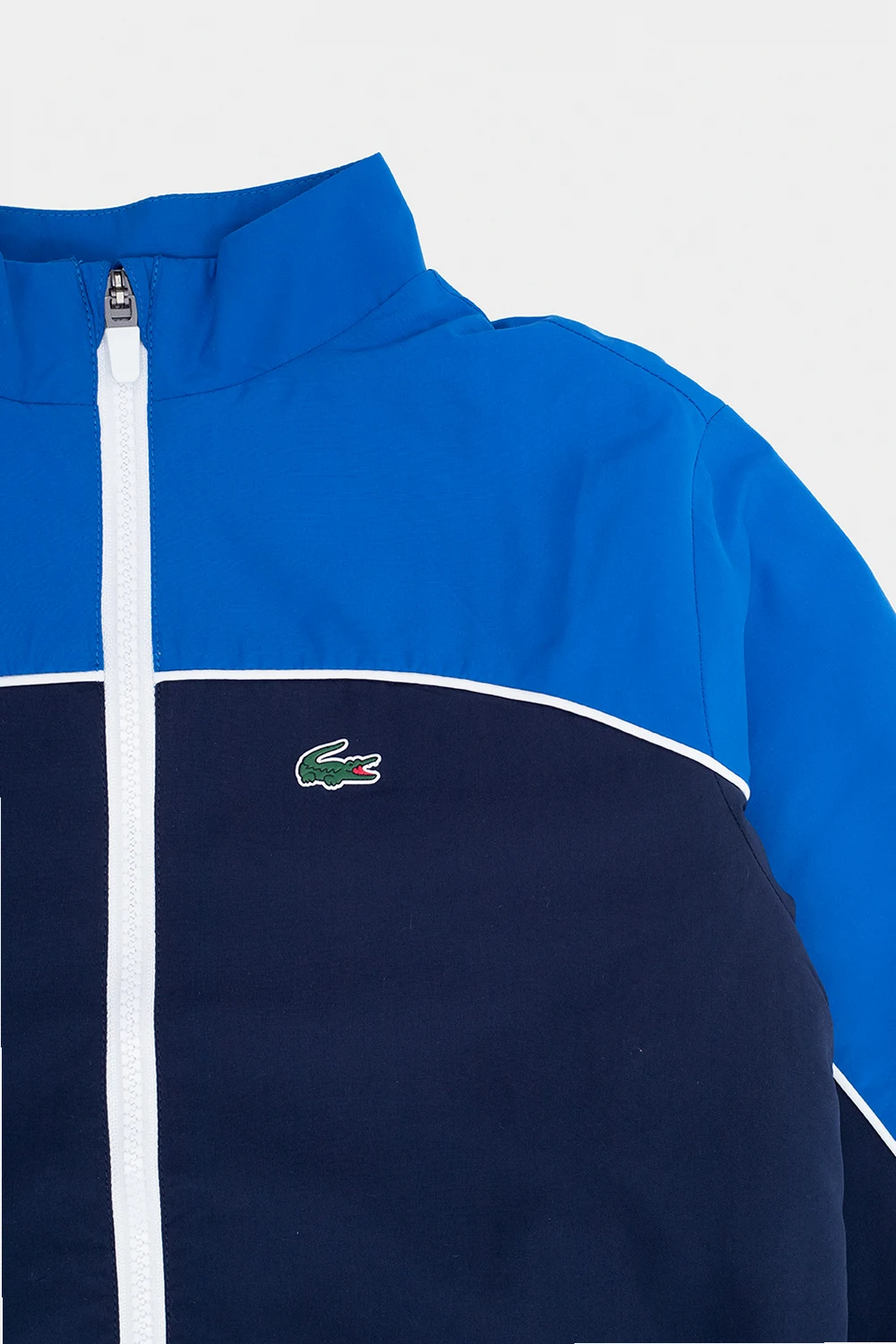 Navy blue, blue and white apparel set from Lacoste Kids. Crafted from recycled material, it showcases a graphic print and a logo patch and includes a sweatshirt with a standing collar, a zip fastening, long sleeves and elasticized edges, and sweatpants with a drawstring waistband, two front slip pockets and elasticated cuffs.