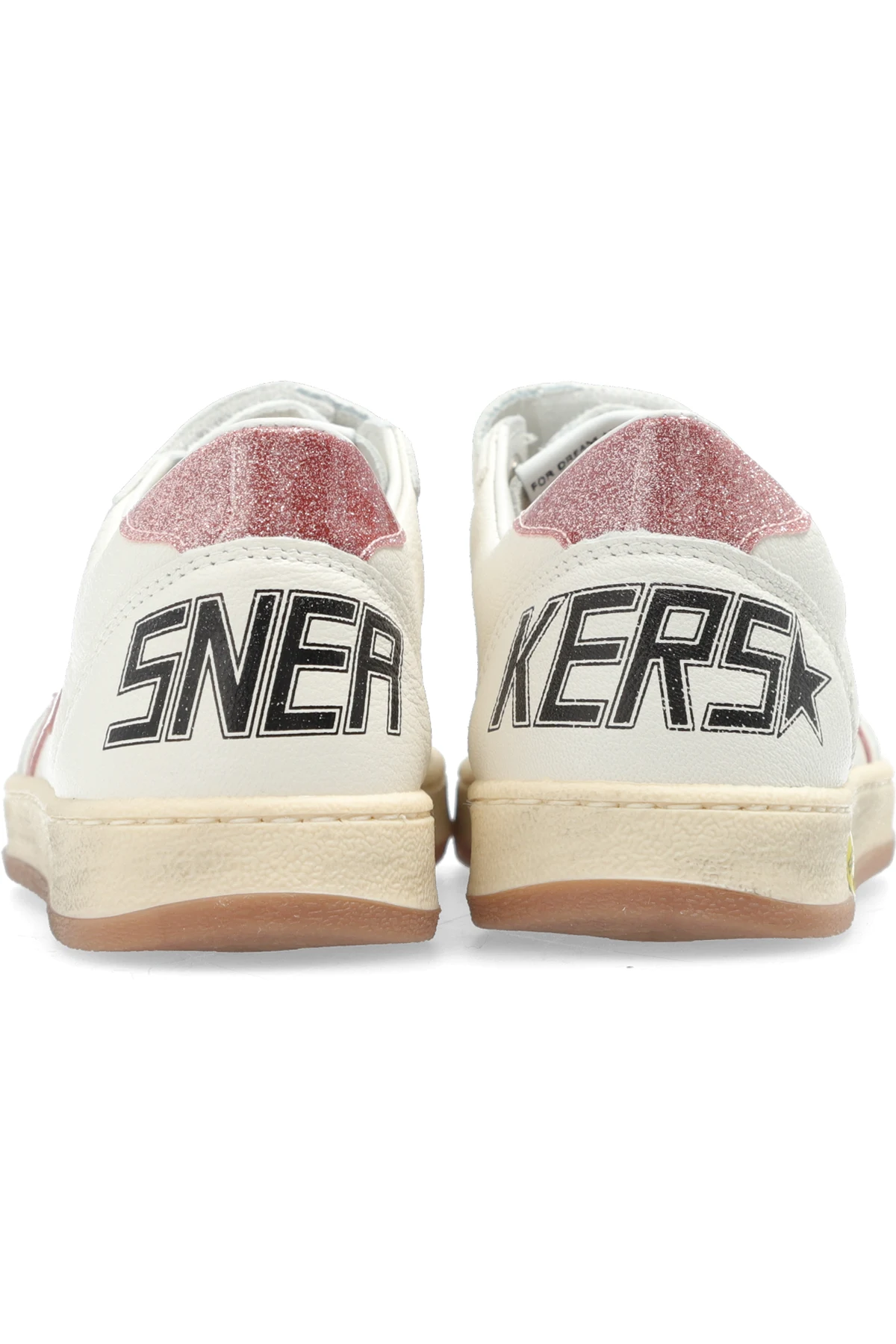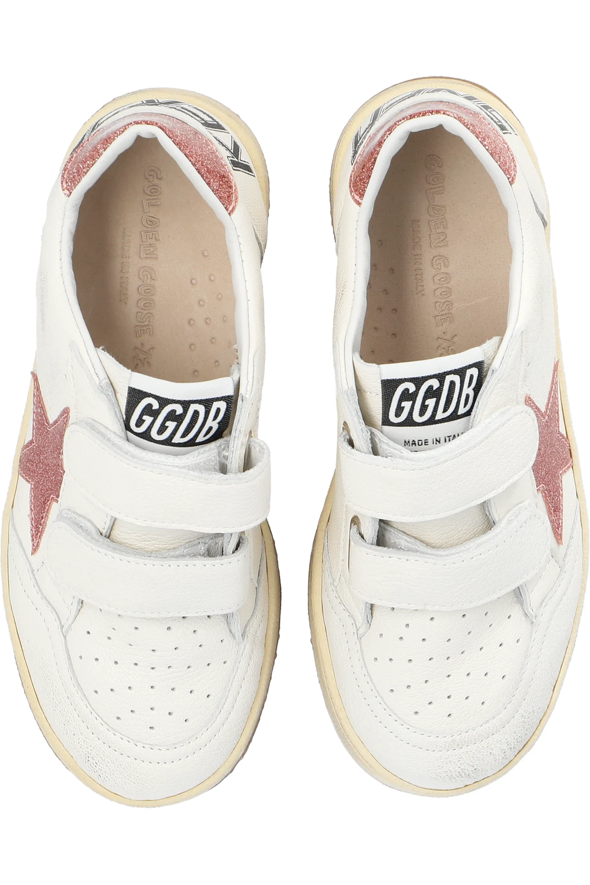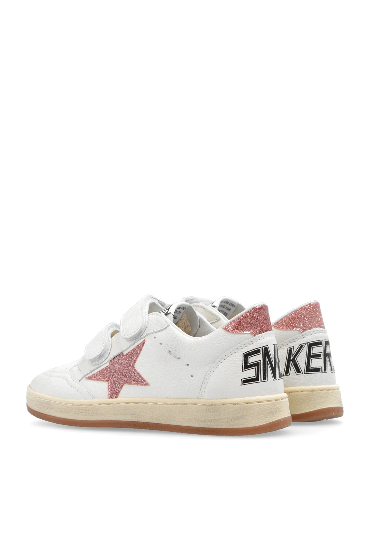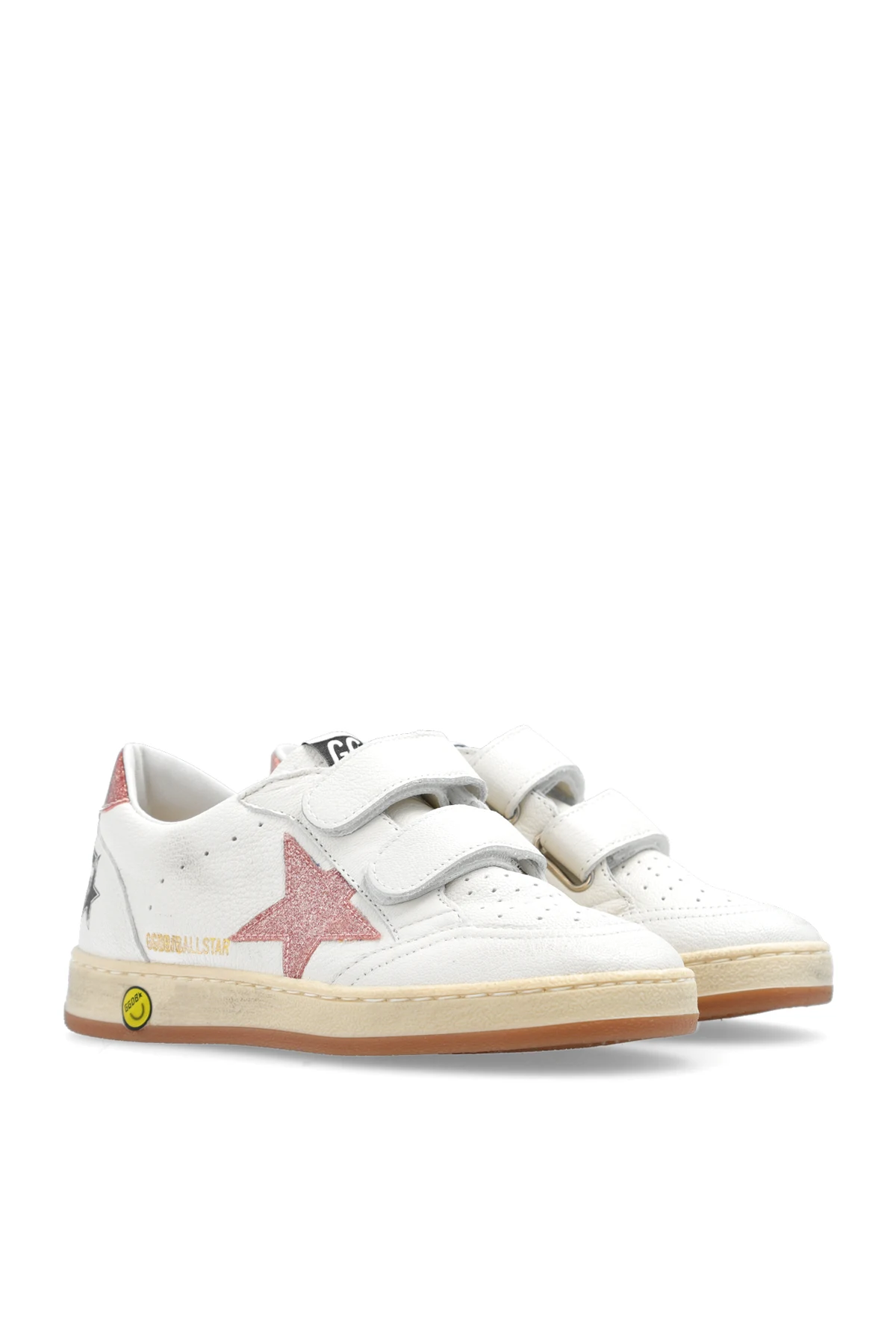 Cream ‘Ball Star Strap’ sneakers from Golden Goose Kids. Made of leather, this model sits on a beige and cream rubber sole and showcases a printed logo, perforations, distressed details, velcro closures as well as a logo patch, a pink heel counter and a signature, sparkling star patch in pink.