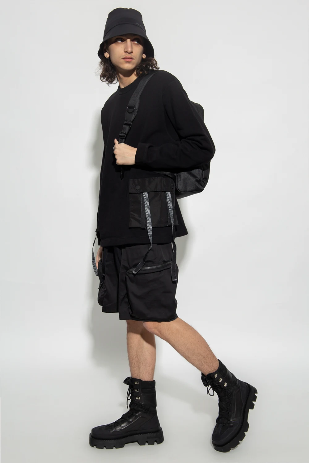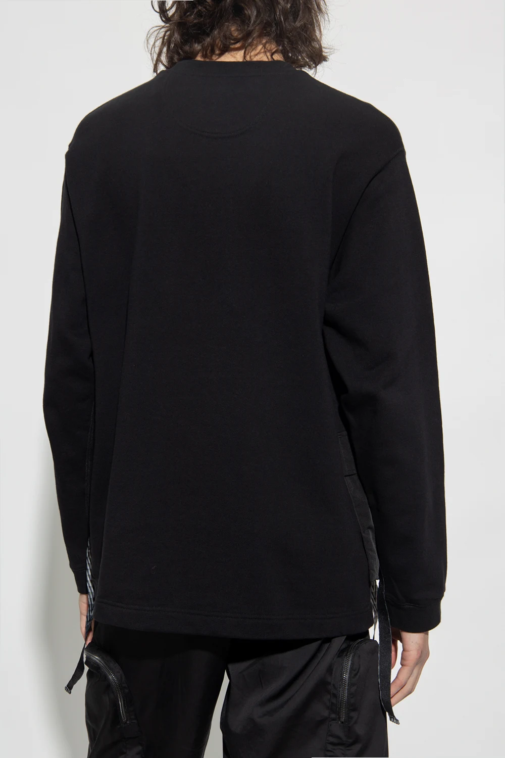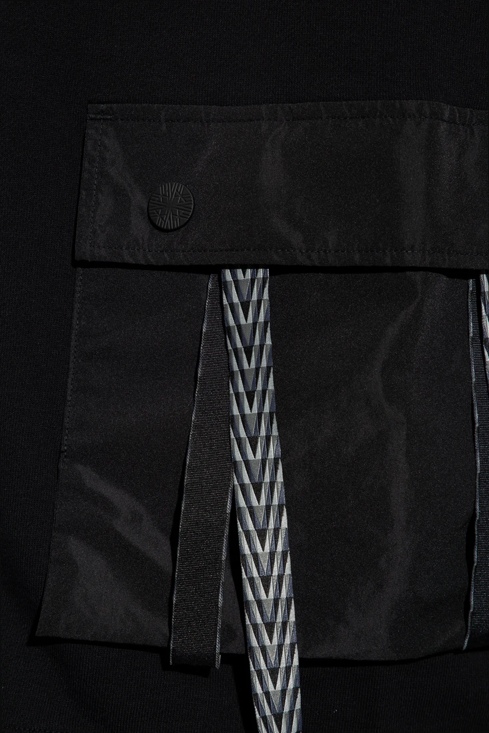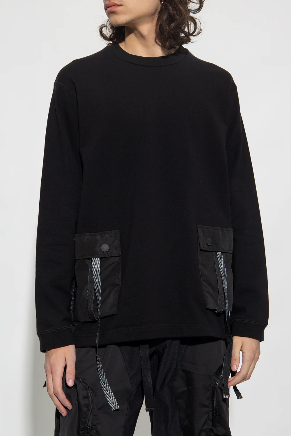 Black crewneck sweatshirt from White Mountaineering. Crafted from cotton jersey, this style features two snap-fastened flapped patch pockets and stripes with a geometric pattern on the front and long sleeves with elasticated cuffs.