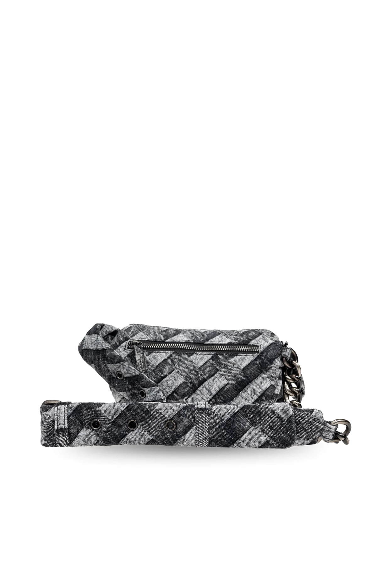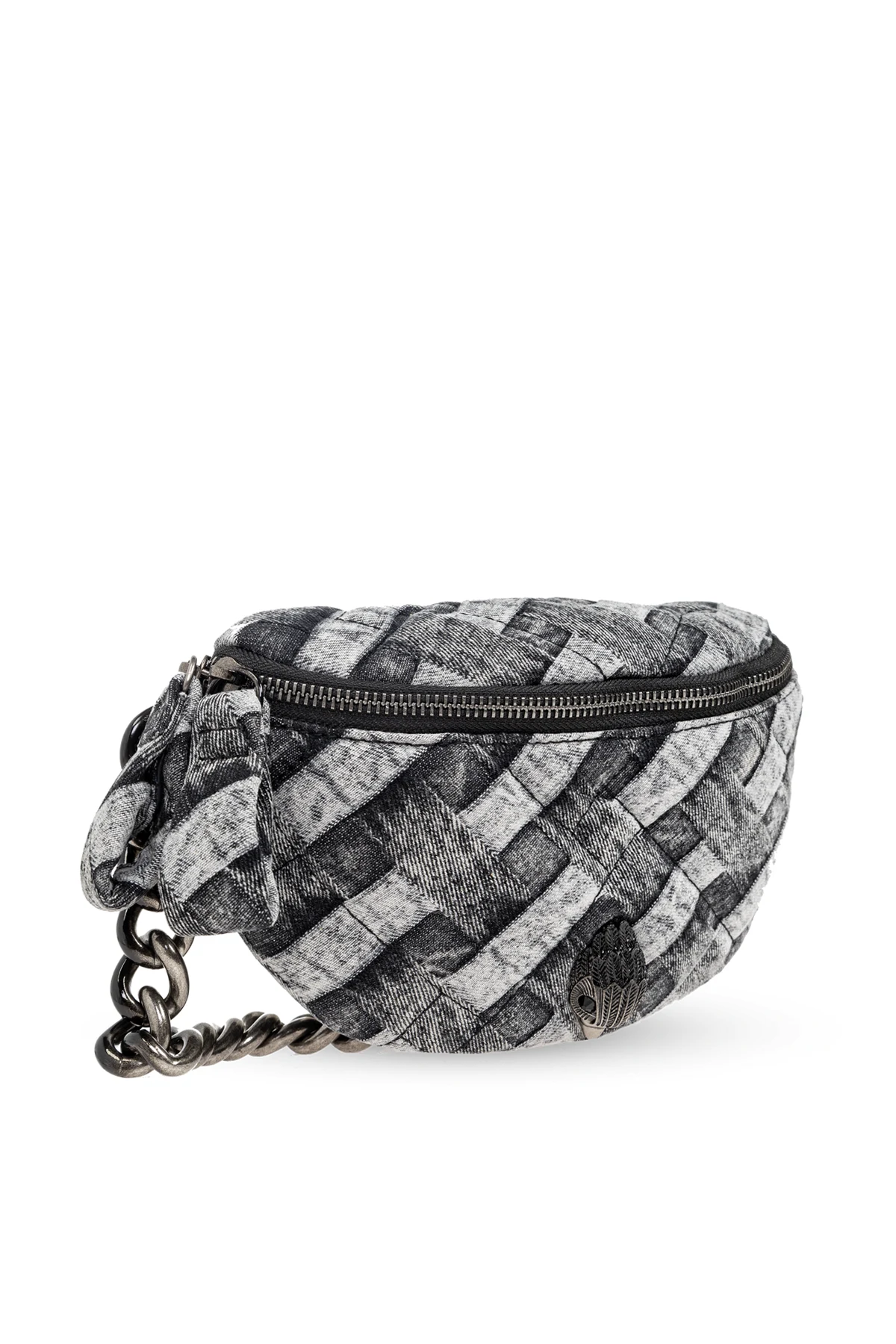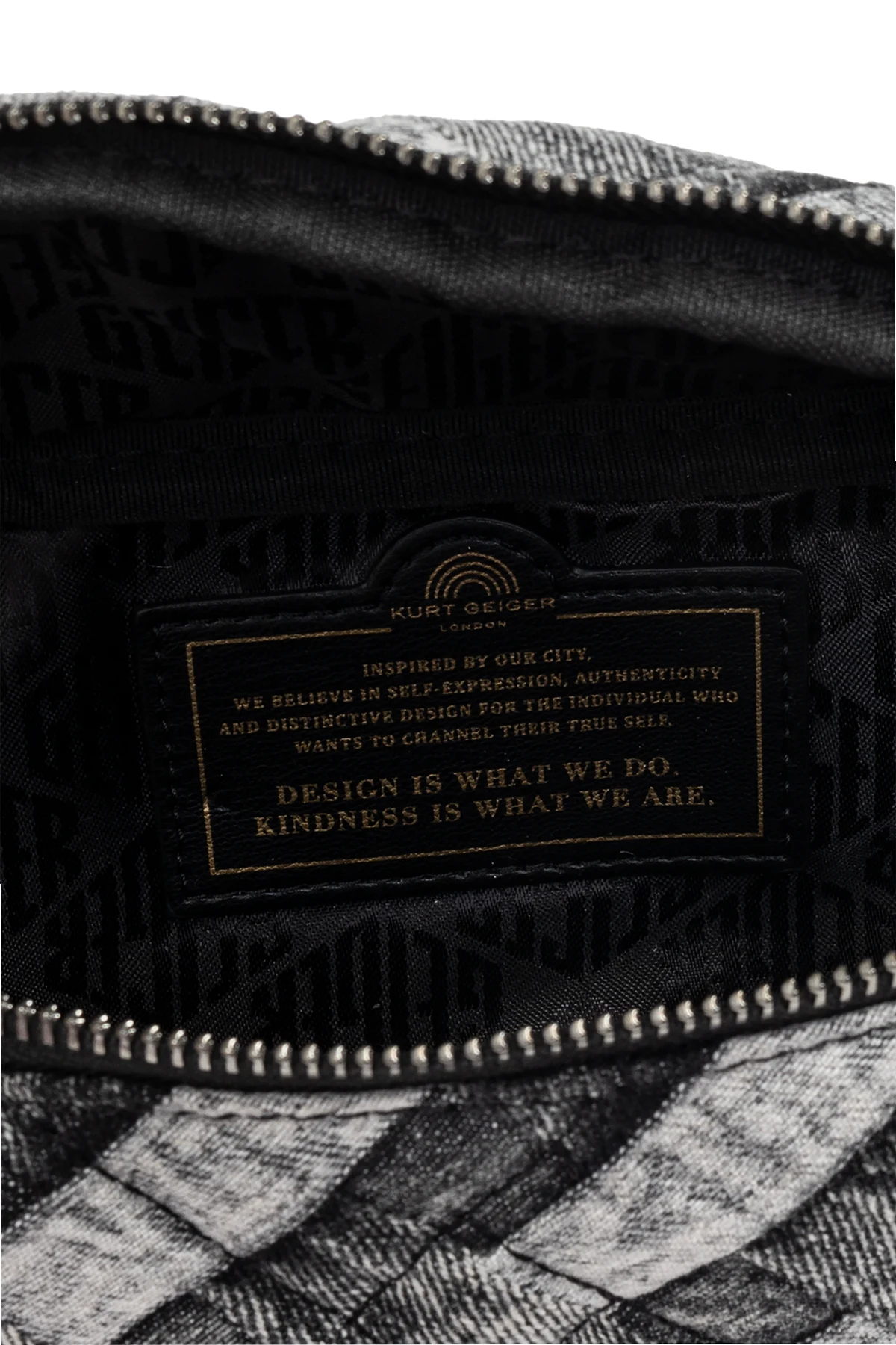 Introducing the SM Kensington S belt bag from the exclusive collection by Kurt Geiger. This exquisite accessory, inspired by the distinctive British street style and pop culture, effortlessly blends functionality with sophisticated design. The bag features a classic, rounded shape with a flat base, ensuring both style and stability. The striking woven pattern in shades of gray creates a unique, three-dimensional effect, enhanced by the textured material that mimics a detailed fabric weave. Adorned with a metallic chain strap, the SM Kensington S exudes a refined elegance. The bag’s front is embellished with a small, metal decorative element, likely the designer\'s emblem, adding a touch of luxury. Inside, a label proudly states the brand’s philosophy: \"DESIGN IS WHAT WE DO. KINDNESS IS WHAT WE ARE.\" The predominant gray hue, with its varying shades and textures, makes this belt bag a versatile yet eye-catching addition to any ensemble. The top zipper closure provides easy access to the interior compartment, making it a practical choice for everyday use. Why Choose This Product? Elegant Design: Classic, rounded shape with a unique woven pattern. High-Quality Material: Textured fabric that mimics intricate weaves. Refined Details: Metallic chain strap and decorative emblem. Practical Functionality: Top zipper closure for easy access. Exclusive Branding: Embodies Kurt Geiger’s stylish and innovative ethos.