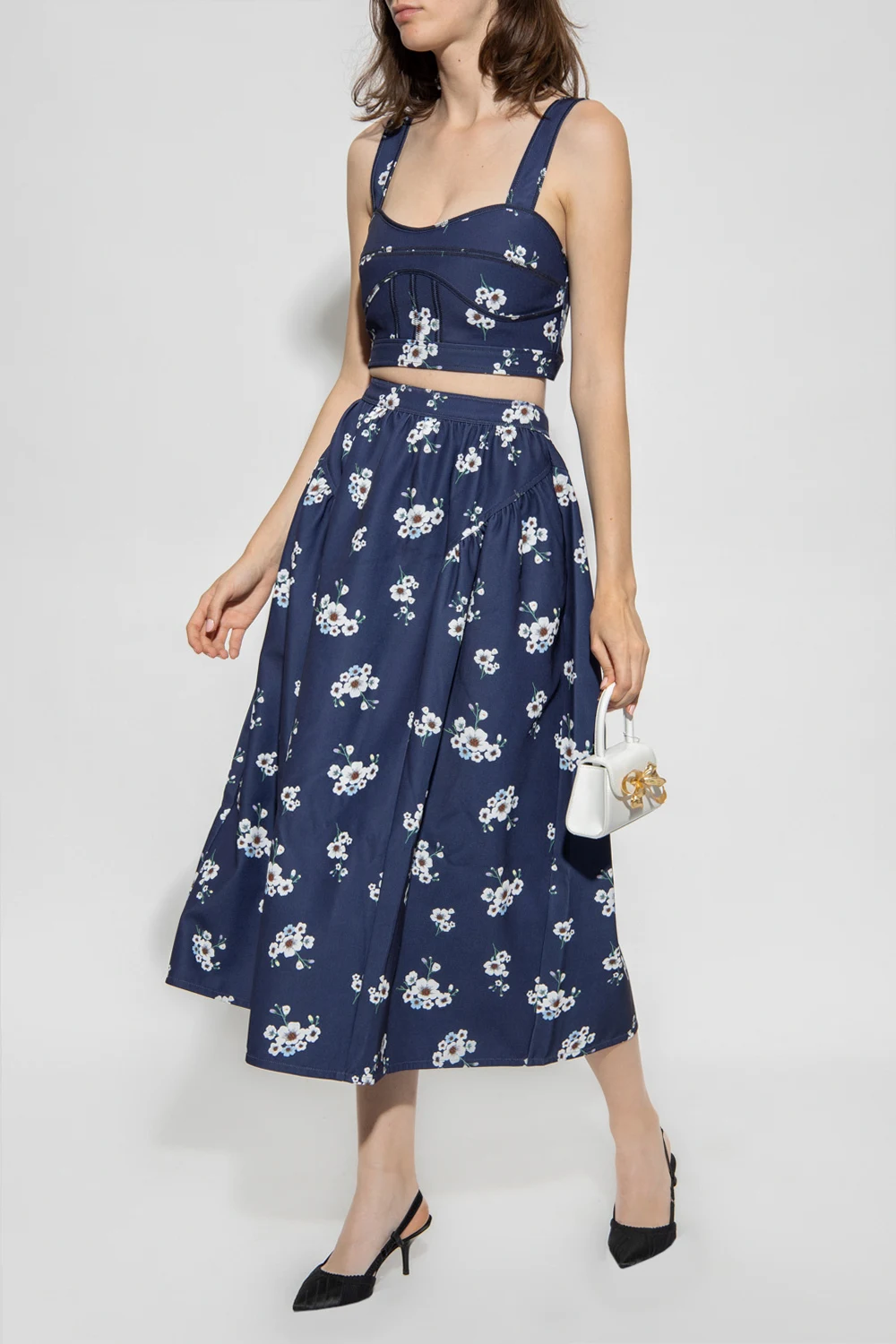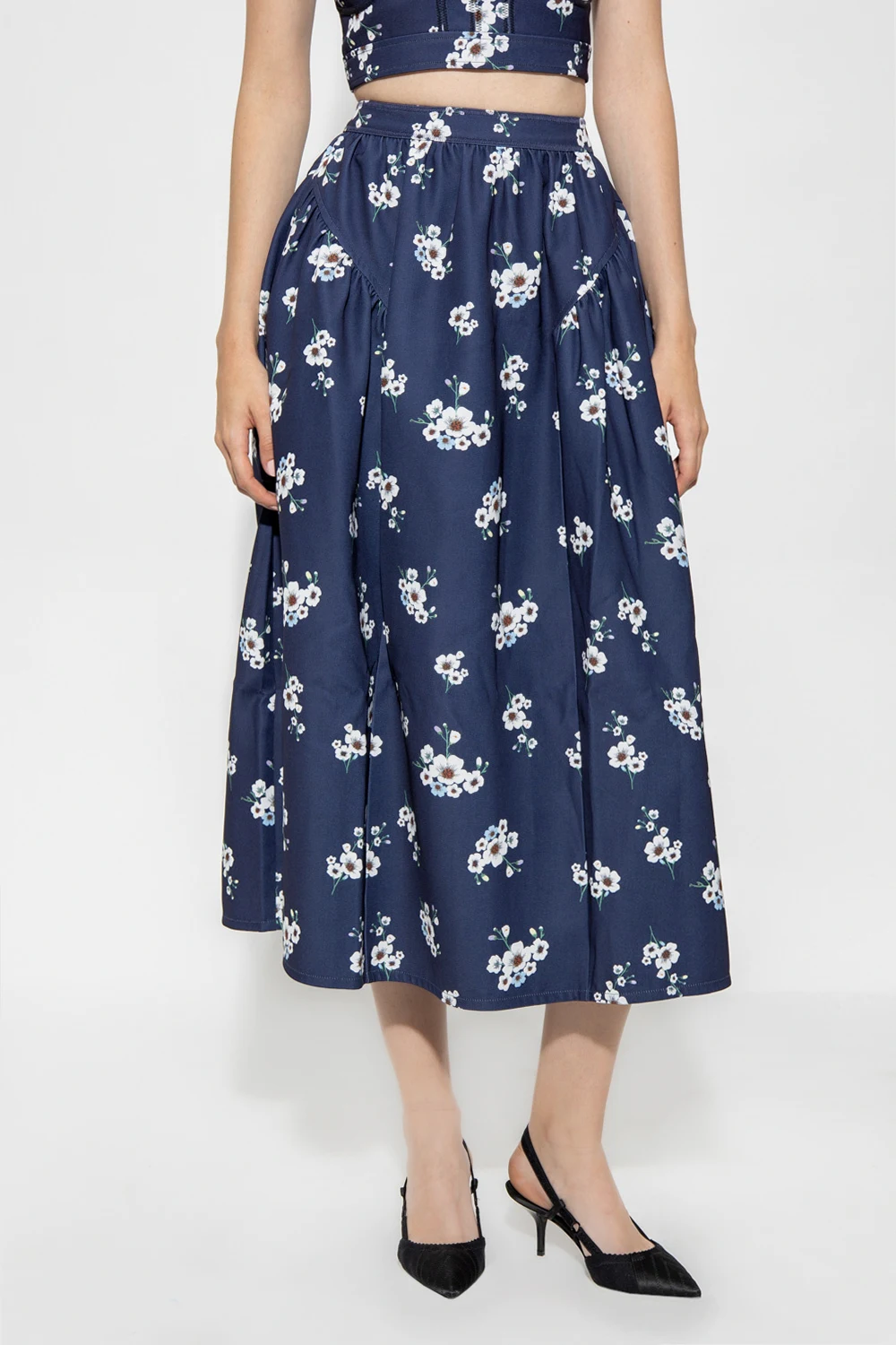Navy blue midi skirt from Self Portrait. Embellished with a colourful floral pattern, this style features a high-rise waist, a back zipper and hook & eye closure, two slip pockets and a flared hem.