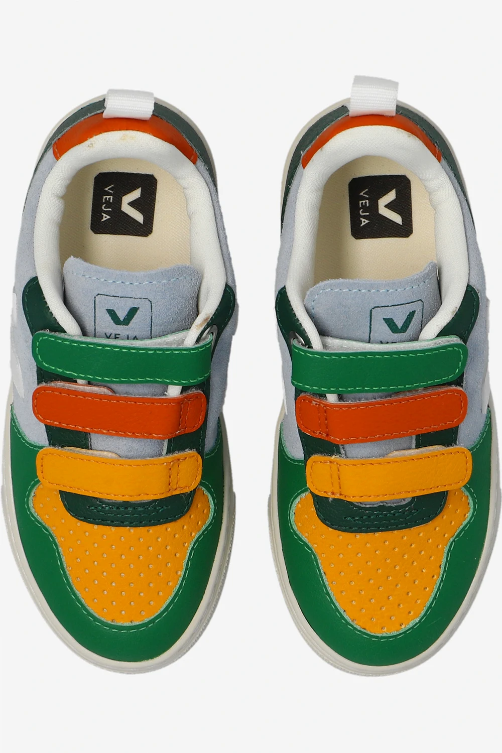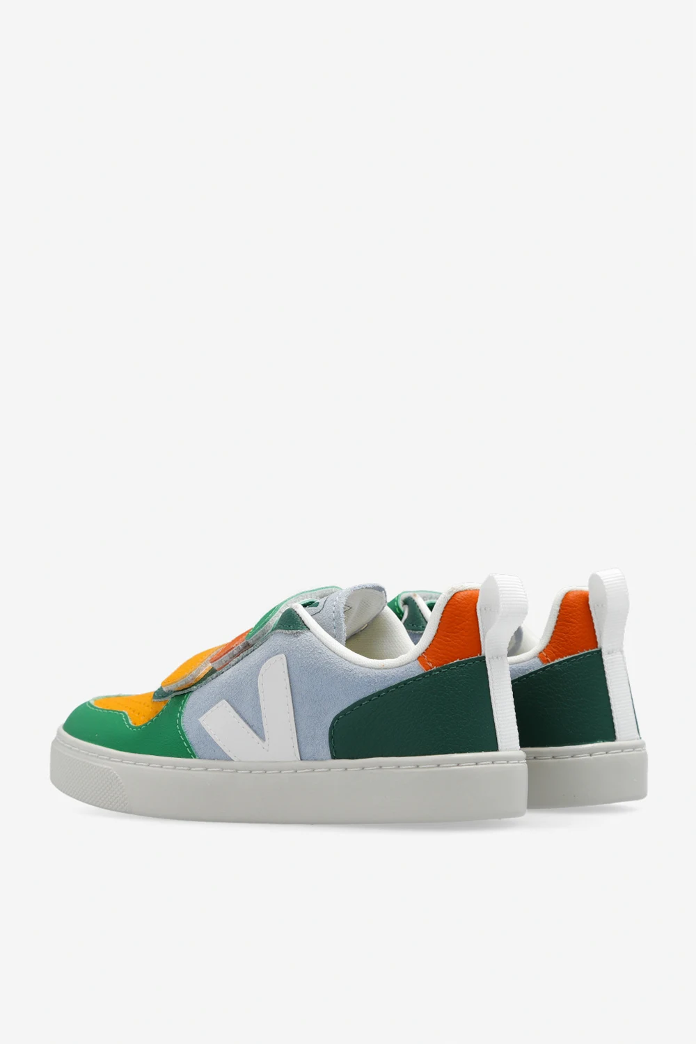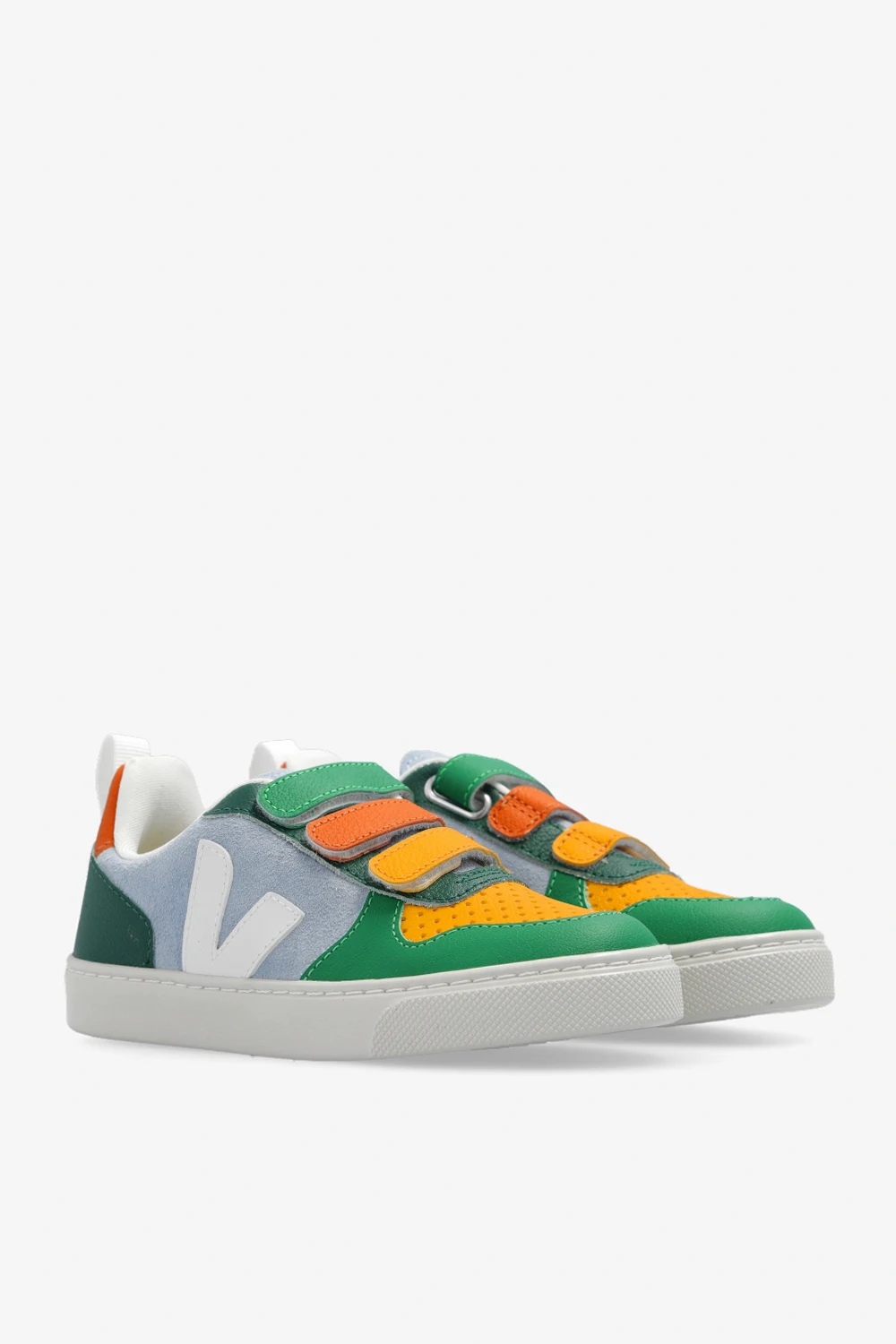 Multicoloured ‘V-10 Suede’ sneakers from Veja Kids. Crafted from suede, this lace-up model features an embossed logo on the tongue, organic cotton laces and the label’s signature white V patch made of rubber and rice waste. The mesh inner lining made from recycled materials was developed to acquire a better resistance to friction. The organic-sourced and recycled insole is made from sugar cane, Amazon rubber, organic cotton and recycled EVA foam. It rests on a cream sole made of organic and recycled materials.