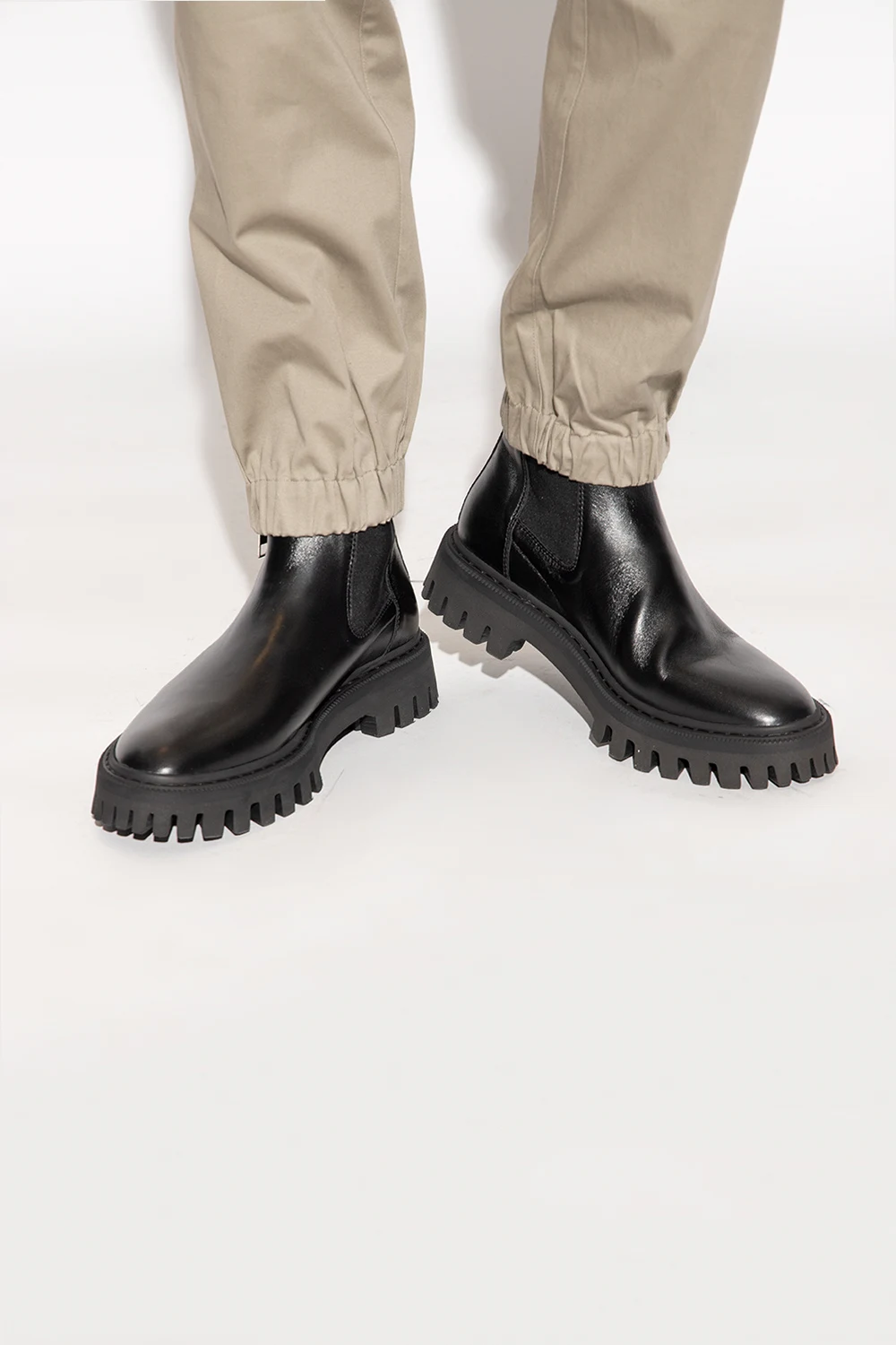 Black ‘Kosmic’ Chelsea boots from Iro. Made of leather, this slip-on pair features elastic side panels, an almond toe and a black rubber sole.