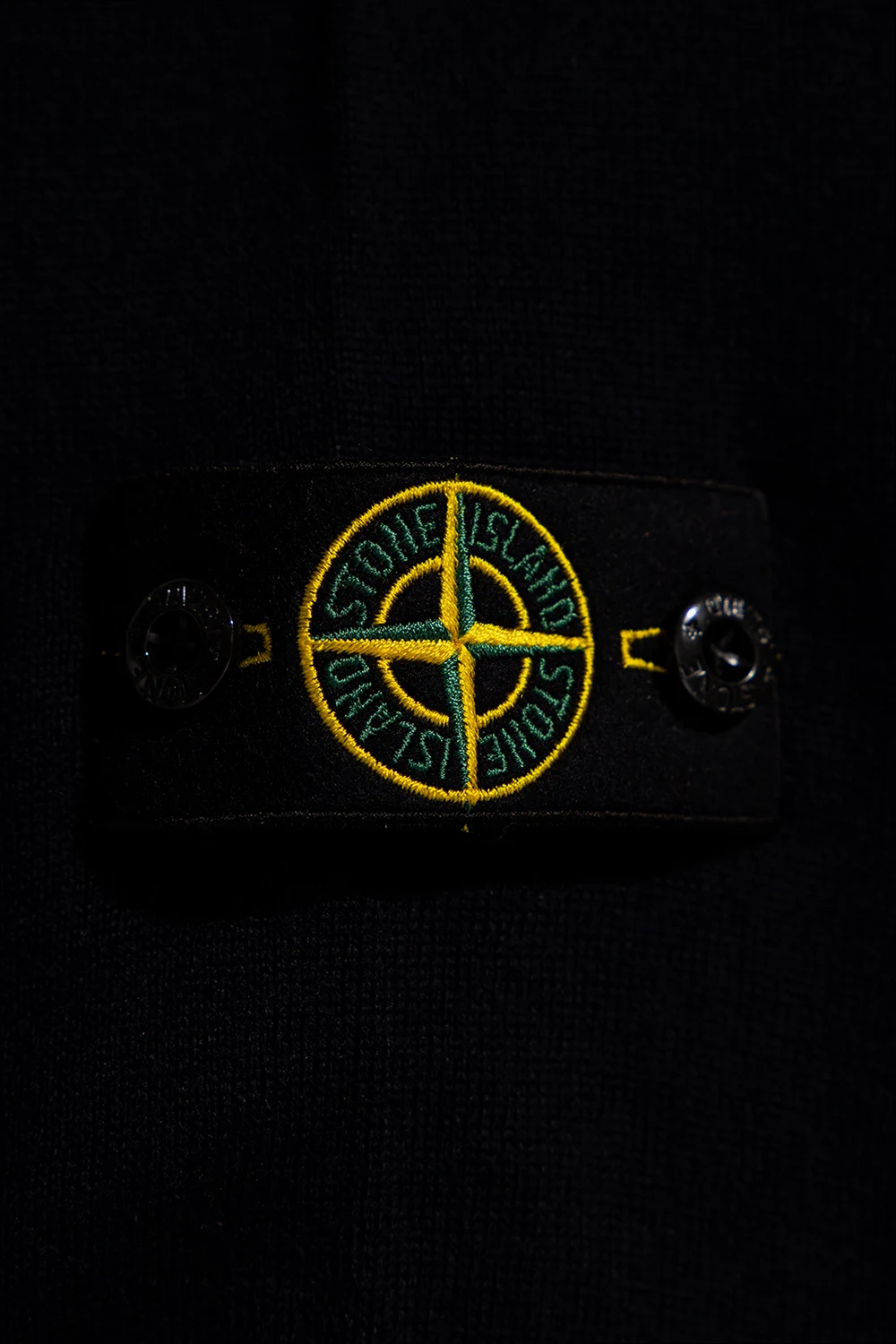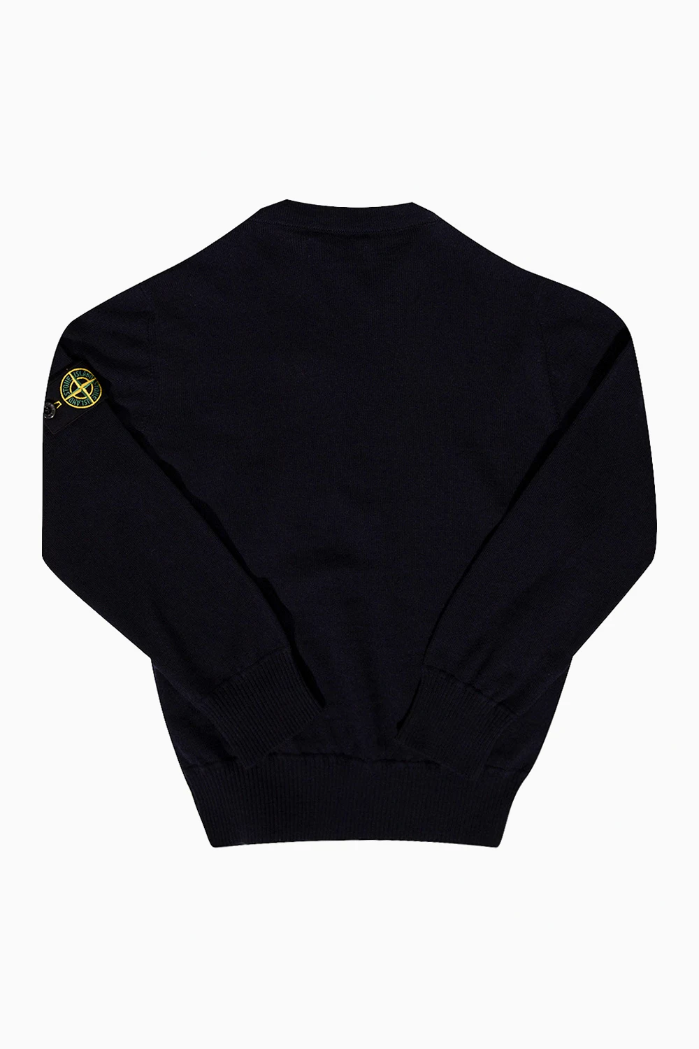 Black sweater from Stone Island Kids. Made of wool, this garment is complete with a black detachable sleeve appliqué with a logo in yellow and green as well as ribbed trims at the round neck, hem and cuffs.